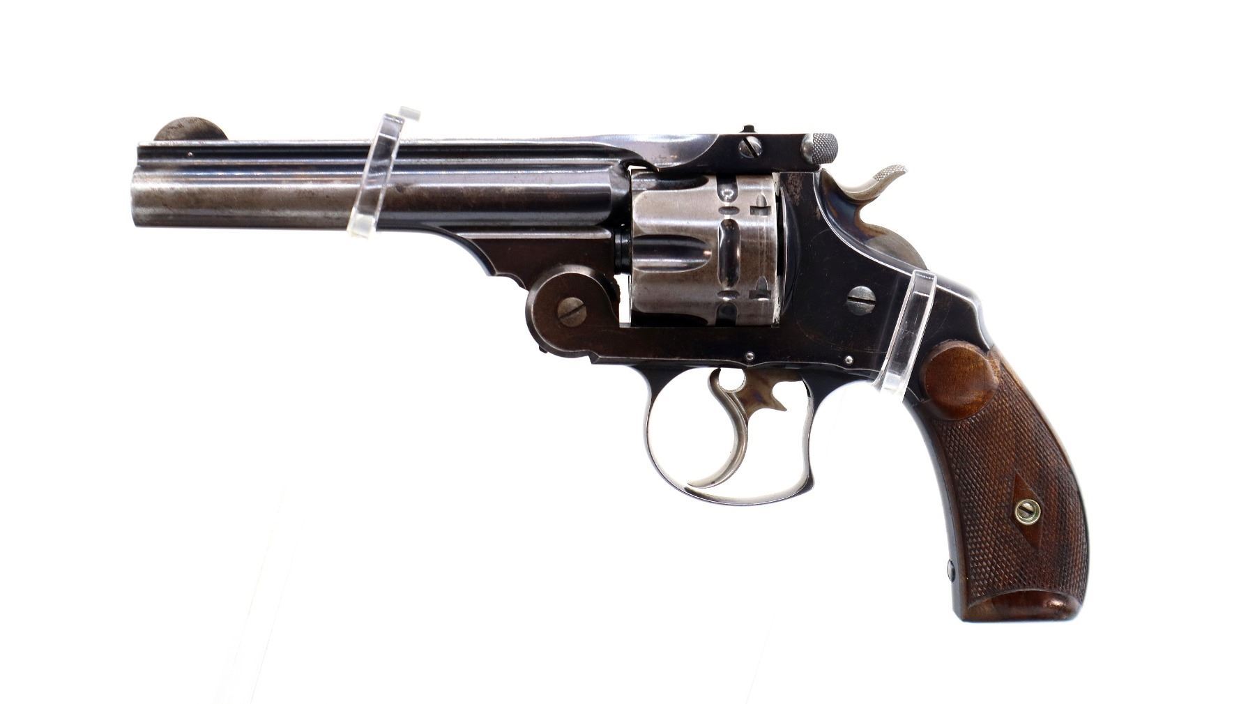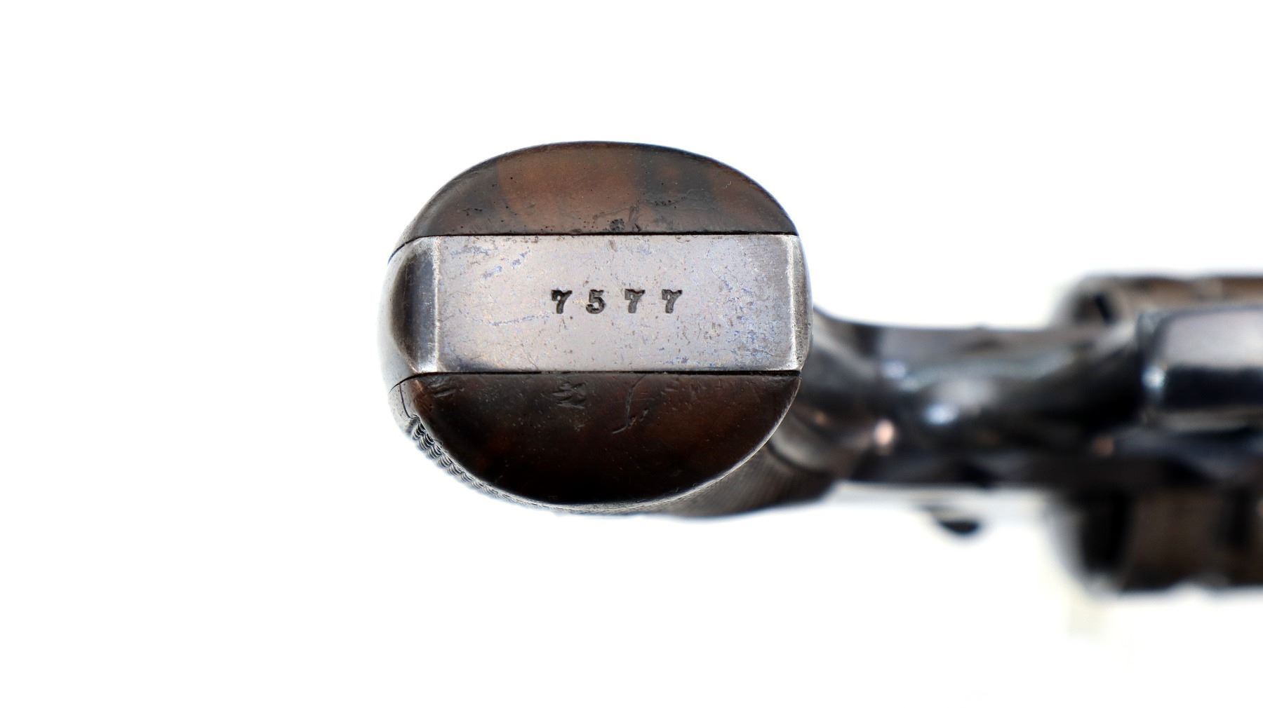 Main Description: Functions mechanically as designed. Cylinder matches. Blade front sight, fixed u notched rear sight, Approx. 60 percent blueing remaining, solid rib on barrel, fluted cylinder, checkered opening latch, checkered colour case hardened spur hammer and smooth trigger, single and double action. Two piece checkered wood grips.