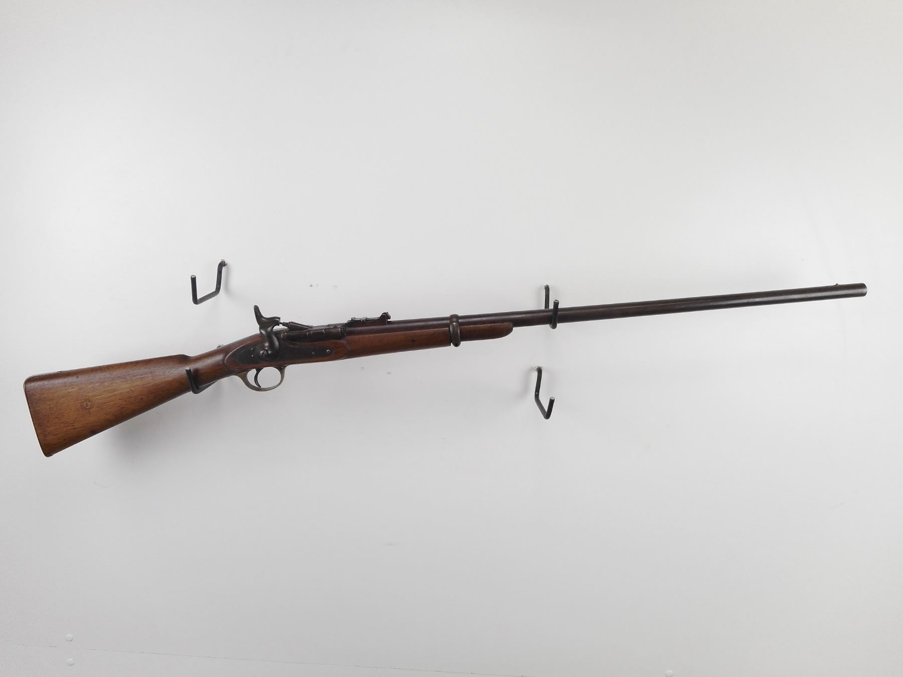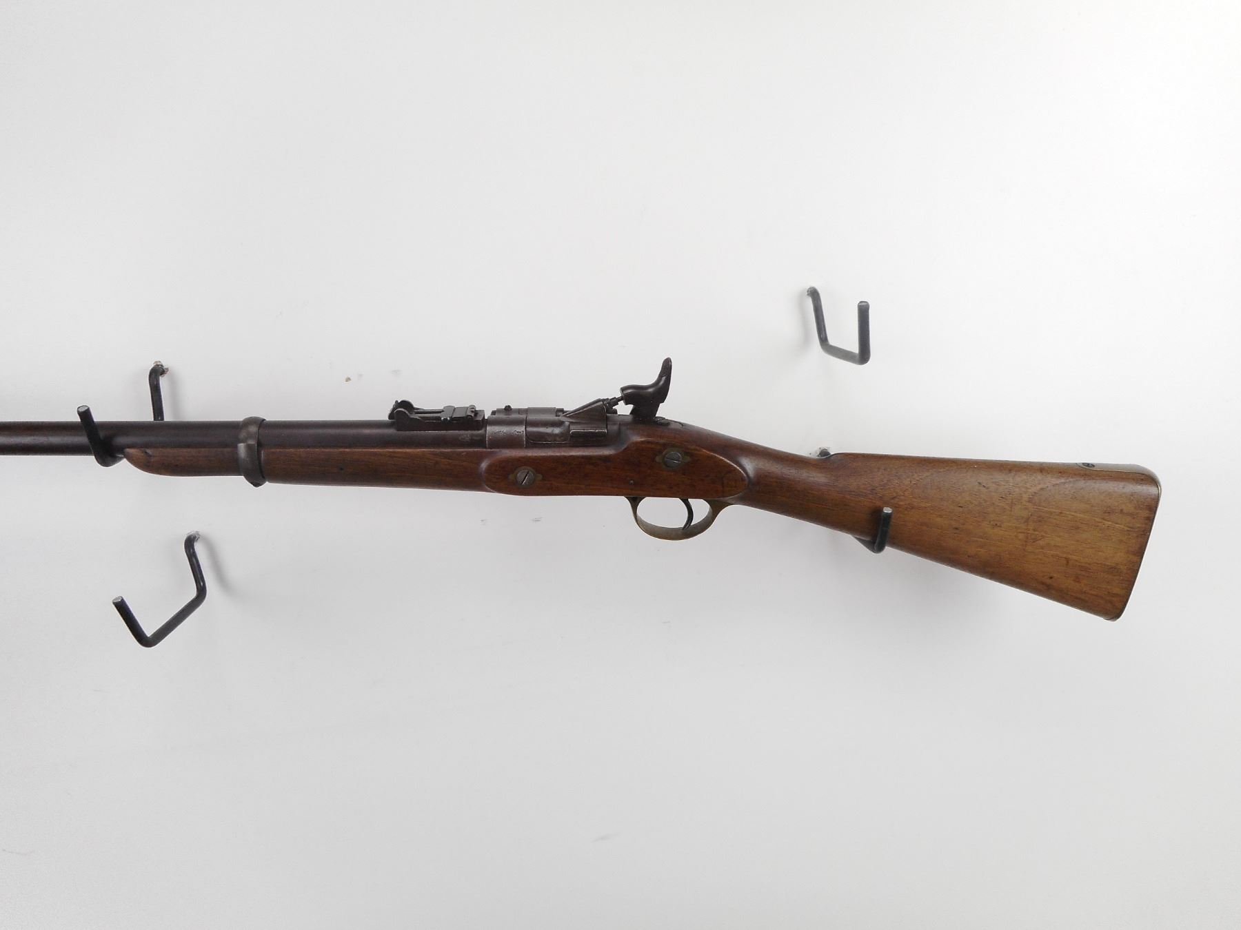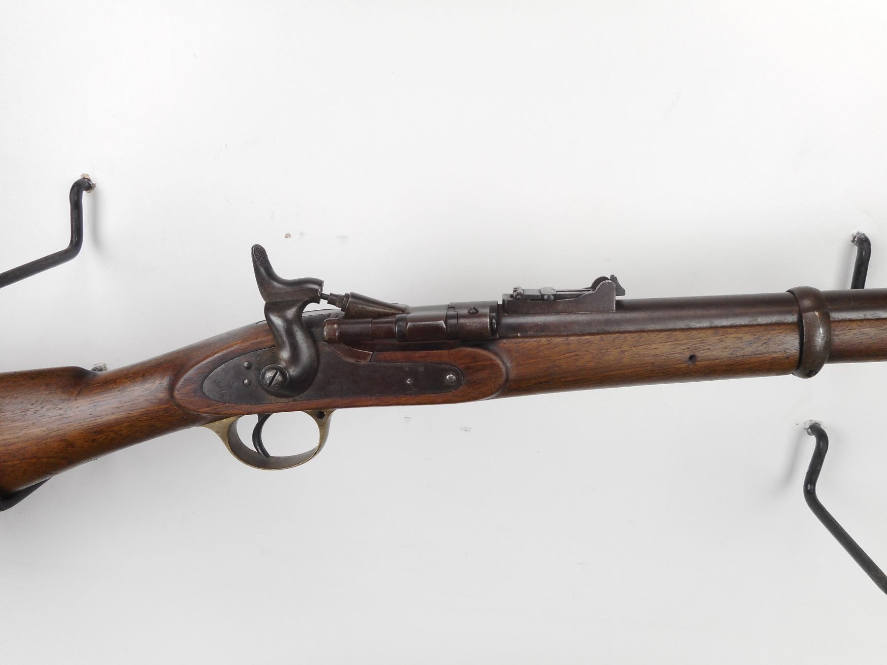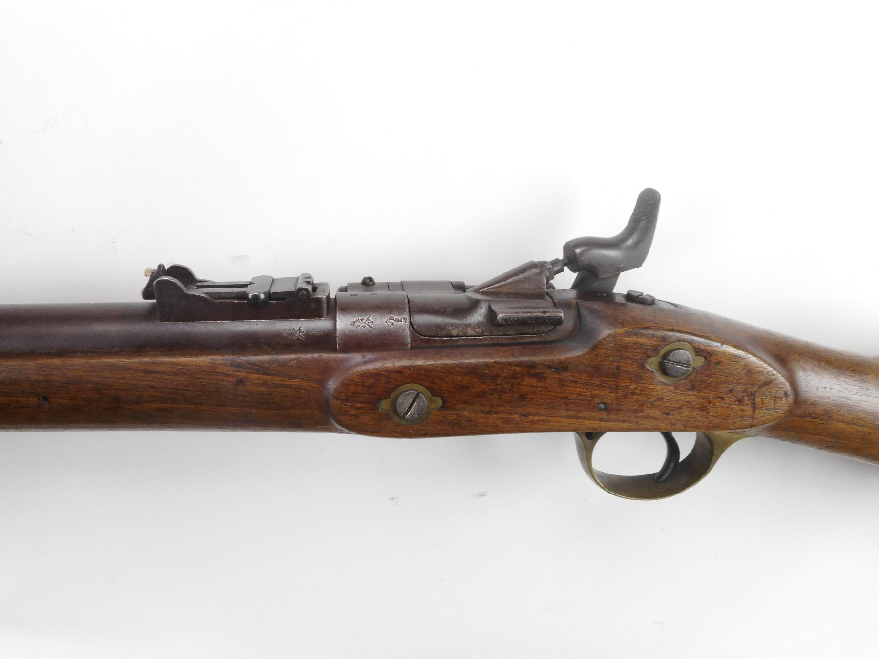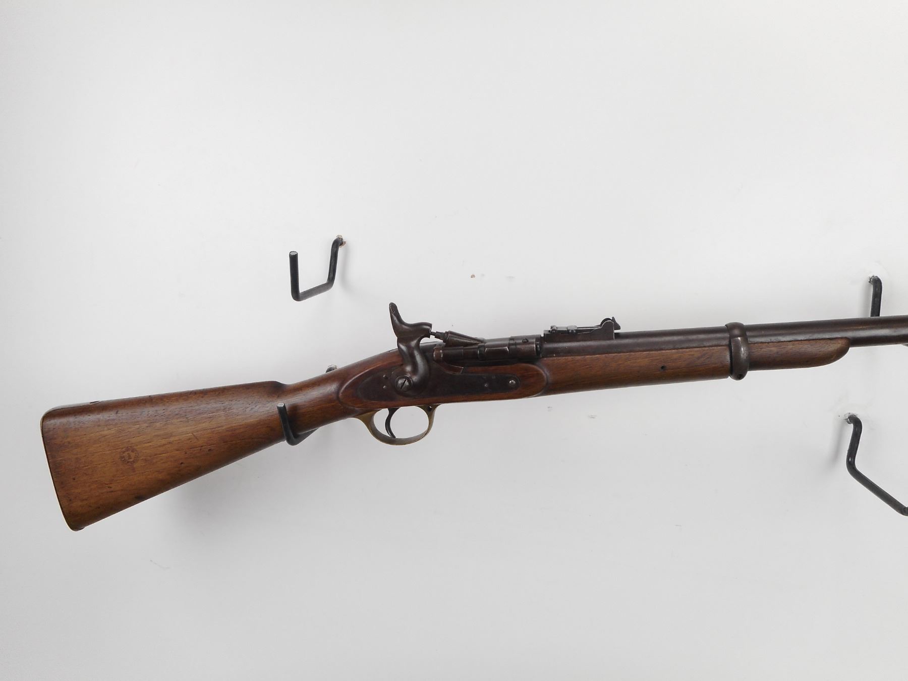 SNIDER ENFIELD , MODEL: MKII* SPORTER , CALIBER: 577 SNIDER , BORE IS DARK. REPLACED HOMEMADE FRONT SIGHT. ADJUSTABLE REAR SIGHT. ONE PIECE HARDWDOOD STOCK WITH BRASS BUTT PLATE. SHOWS SOME HANDLING MARKS. , ACTION: SIDE HINGE TIPPING , BARREL LENGTH: 30" , SERIAL# N/A , CONDITION: 6/10 ANTIQUE , CLASS: CANADIAN CLASS ANTIQUE