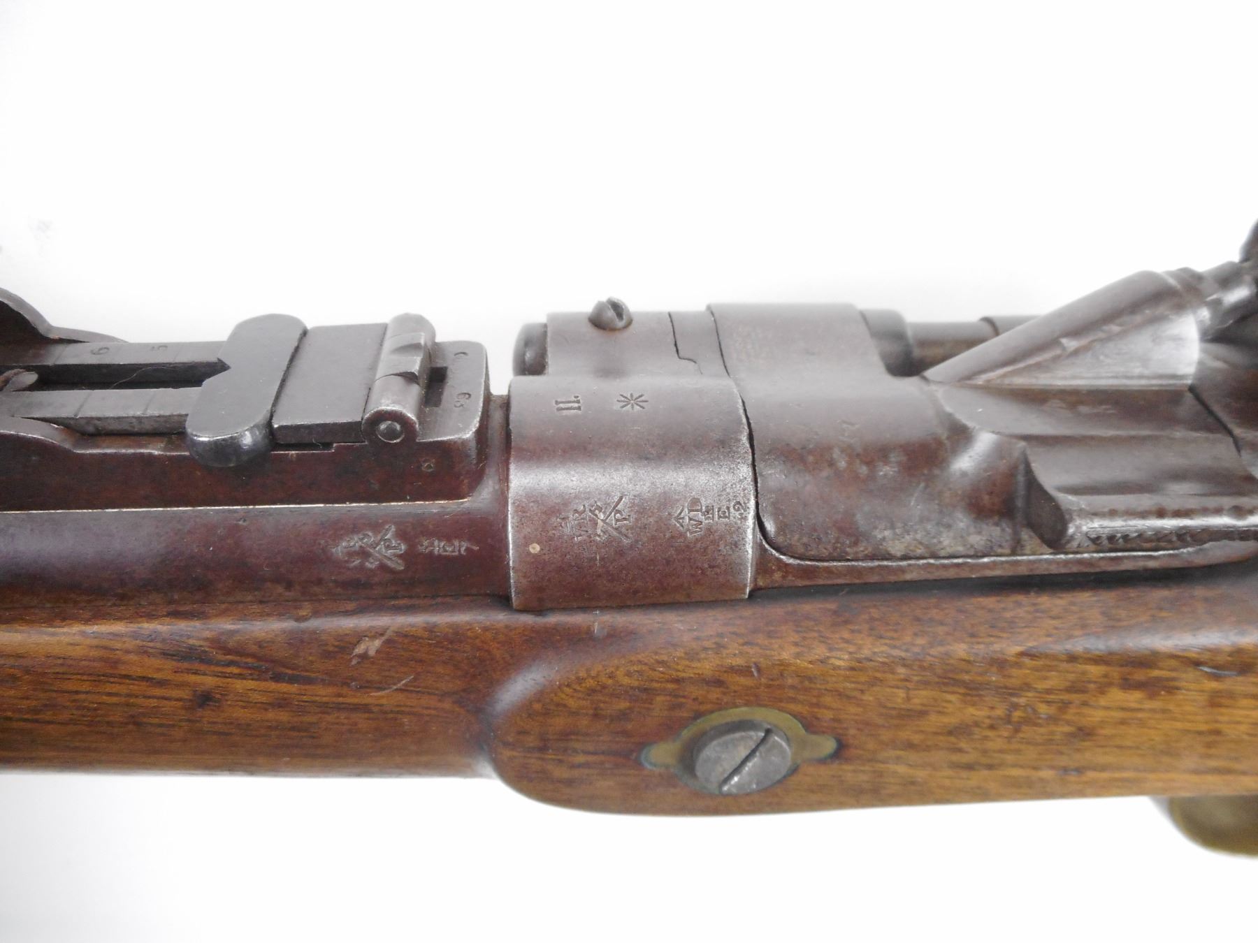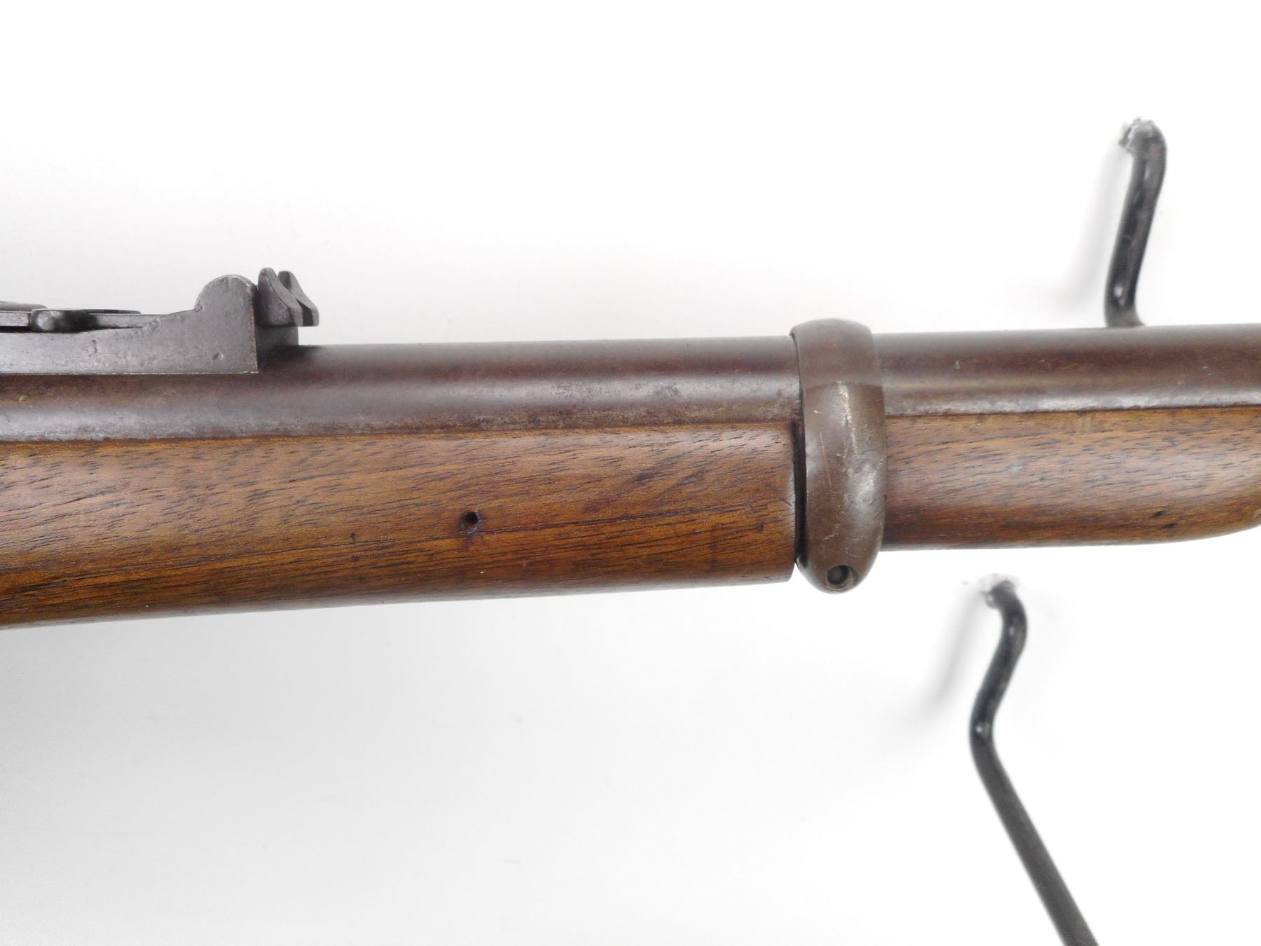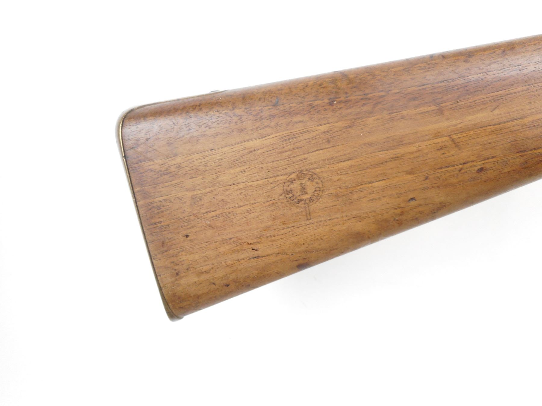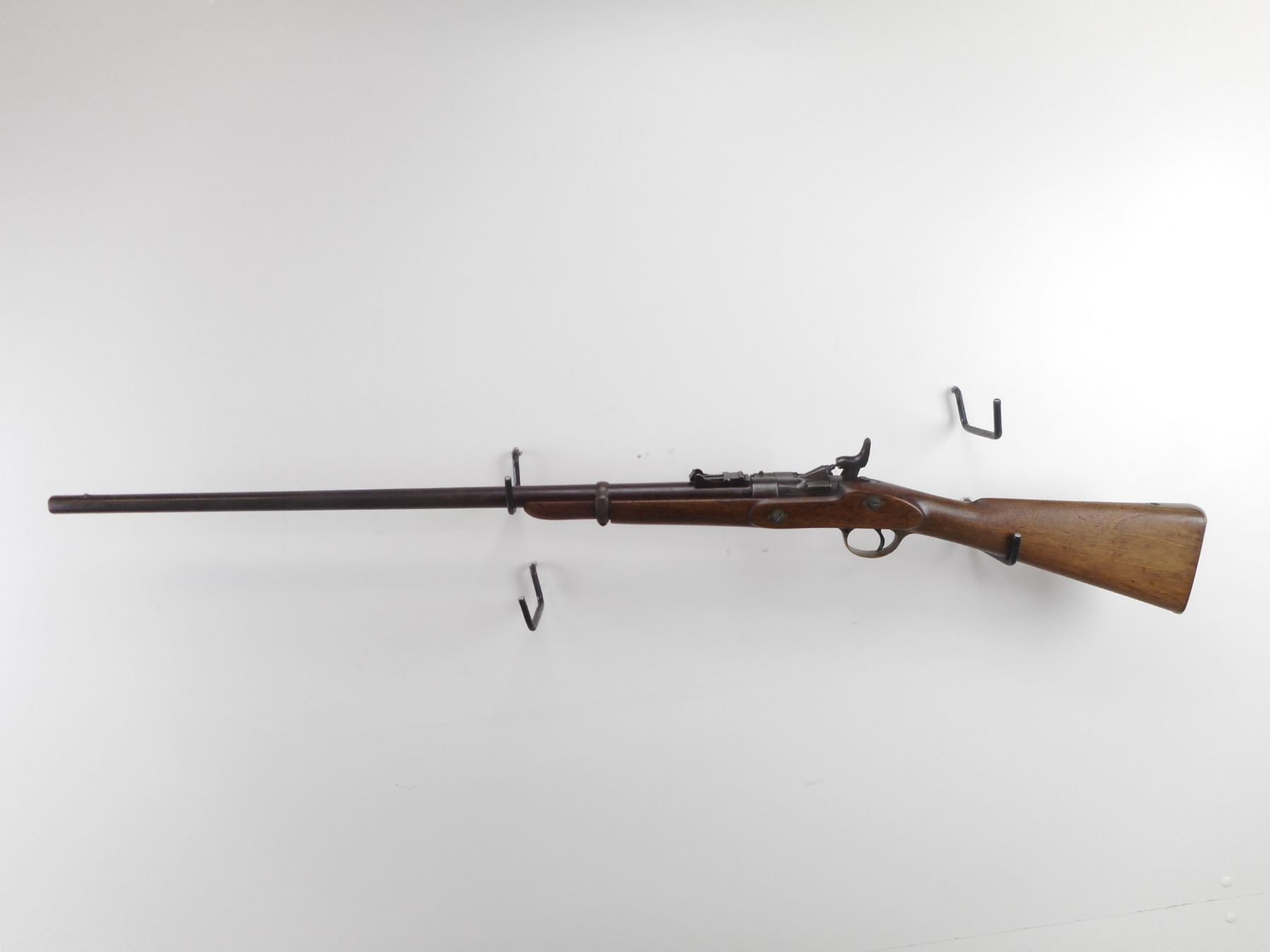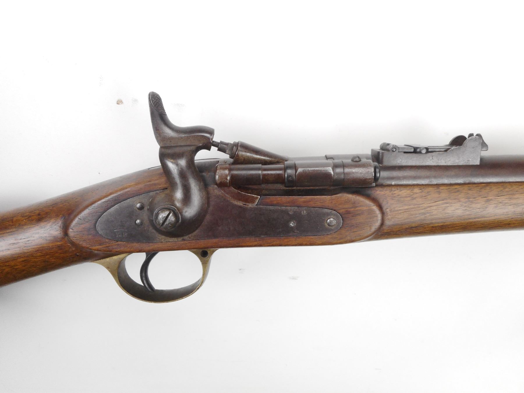 SNIDER ENFIELD , MODEL: MKII* SPORTER , CALIBER: 577 SNIDER , BORE IS DARK. REPLACED HOMEMADE FRONT SIGHT. ADJUSTABLE REAR SIGHT. ONE PIECE HARDWDOOD STOCK WITH BRASS BUTT PLATE. SHOWS SOME HANDLING MARKS. , ACTION: SIDE HINGE TIPPING , BARREL LENGTH: 30" , SERIAL# N/A , CONDITION: 6/10 ANTIQUE , CLASS: CANADIAN CLASS ANTIQUE