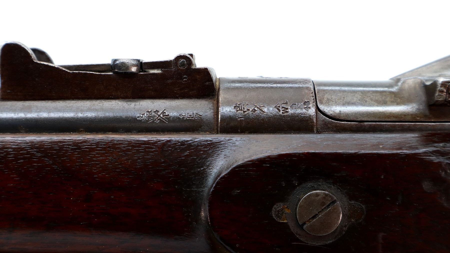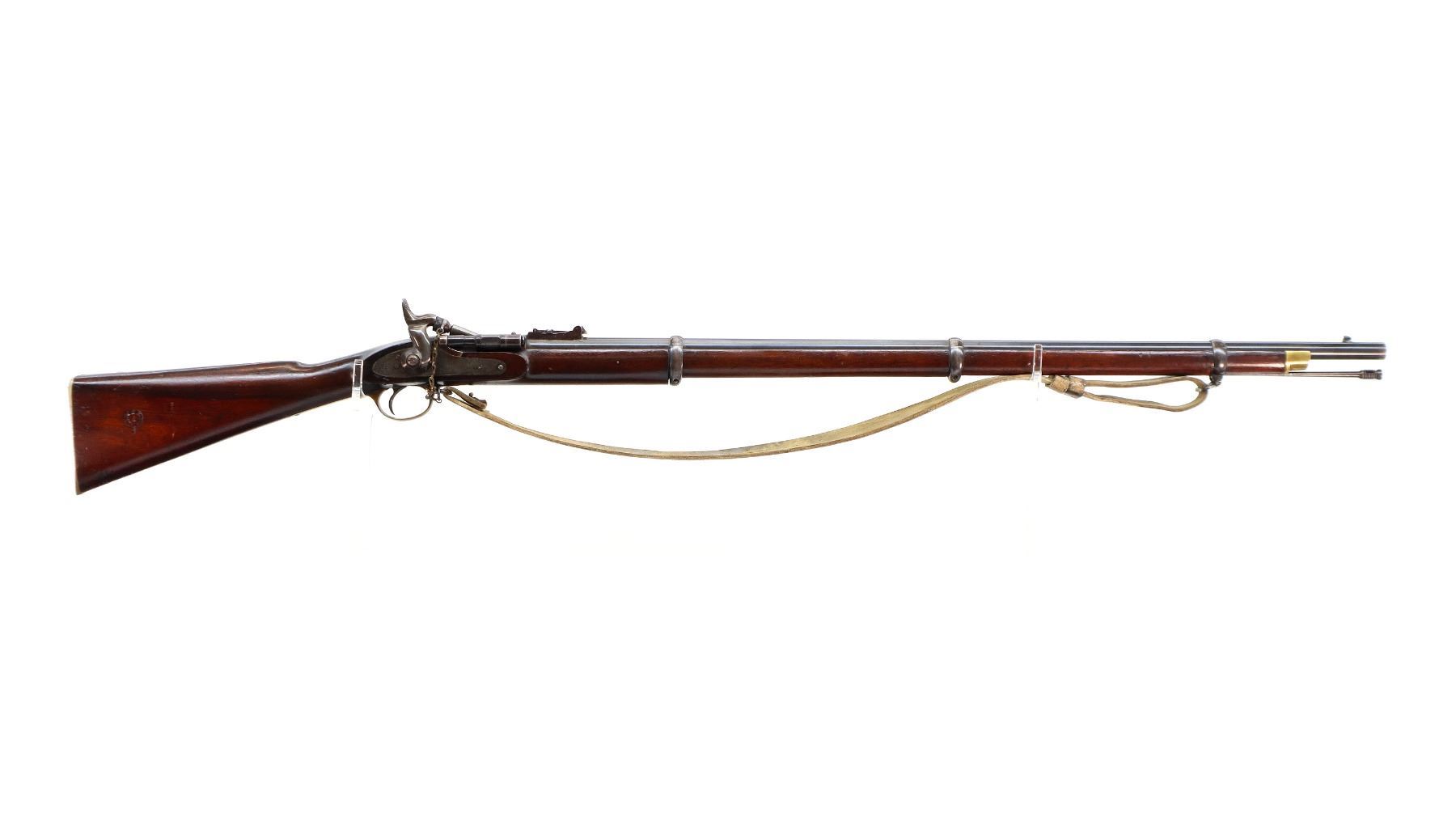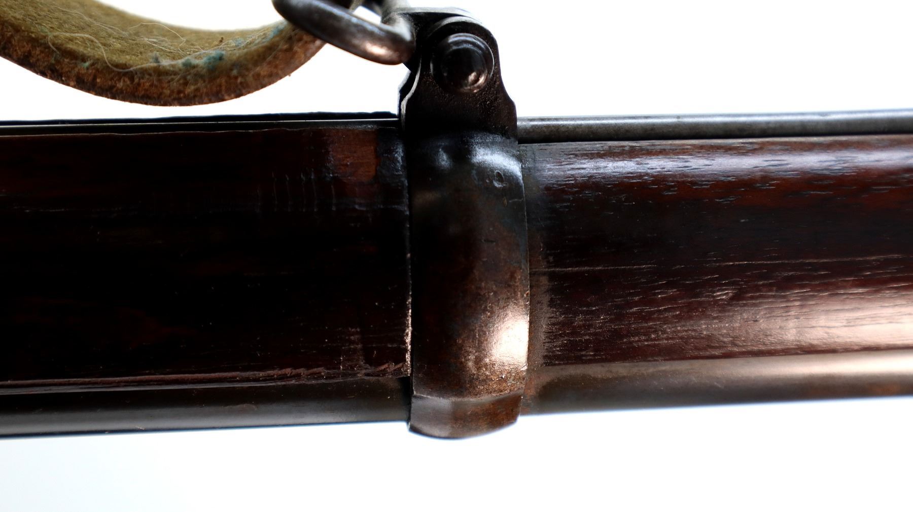 Main Description: Manufactured by Enfield 1862. Blade front sight with ramp, adjustable u notched ladder rear sight, blued finish, lock marked Crown VR with checkered spur hammer that functions, nipple protector. One piece full military wood stock, straight grip, smooth brass butt plate, tang stamped with 10 HFB, roundel on right side, sling swivels with white buff leather sling, ramrod. Includes: P1853 Bayonet, silver blade with E Crown 25 Proof mark, leather and brass scabbard with Broad arrow DD 58/73.