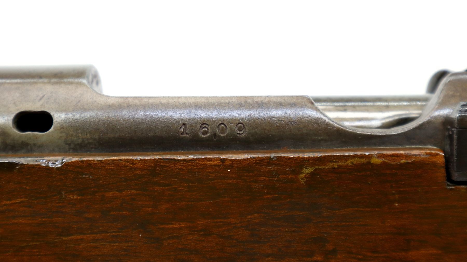 Main Description: Bolt matches. Barley corn front sight with ears and ramp, adjustable u notched ladder rear sight, turned down bolt handle. Two piece refinished full Military wood stocks, straight grip cracked behind receiver, smooth steel butt plate, sling swivels