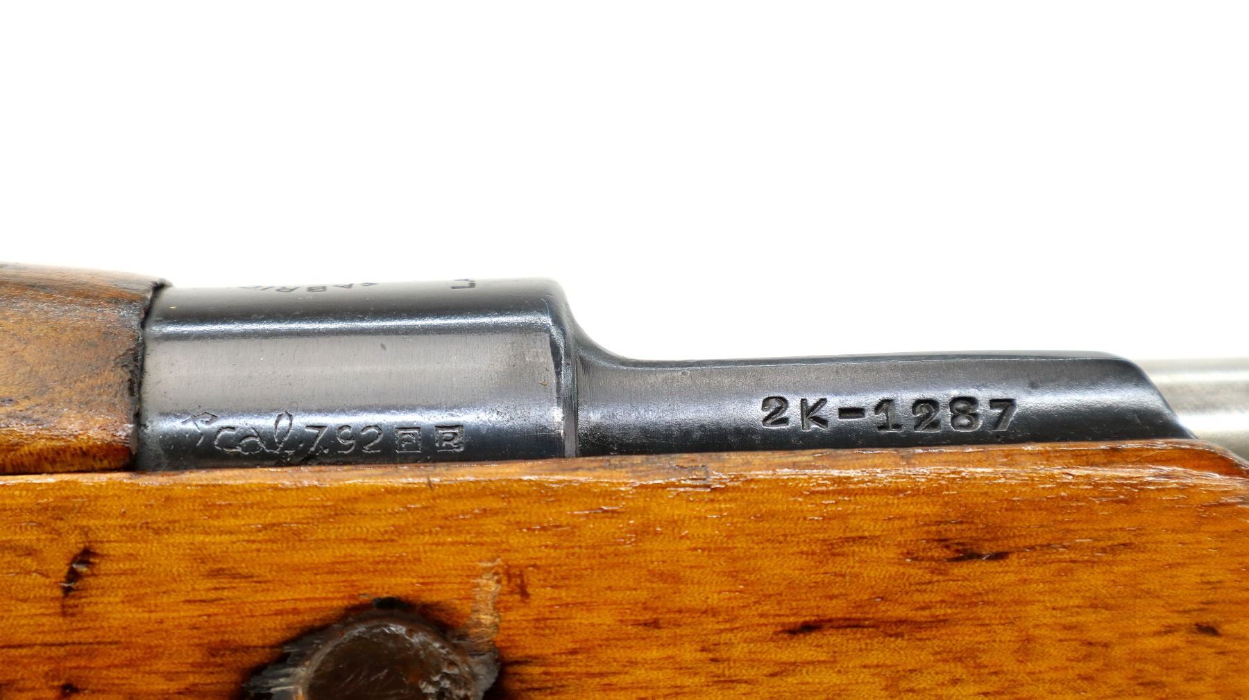Main Description: Manufactured by Lacoruna 1955, serial numbers mismatched. Blade front sight with ramp, adjustable u notched rear sight, metal has been polished and reblued with pitting underneath, silver bolt with straight handle. Two piece refinished full military wood stocks, handguard is chipped and cracked, pistol grip, smooth steel butt plate, four sling swivels, bayonet lugs
