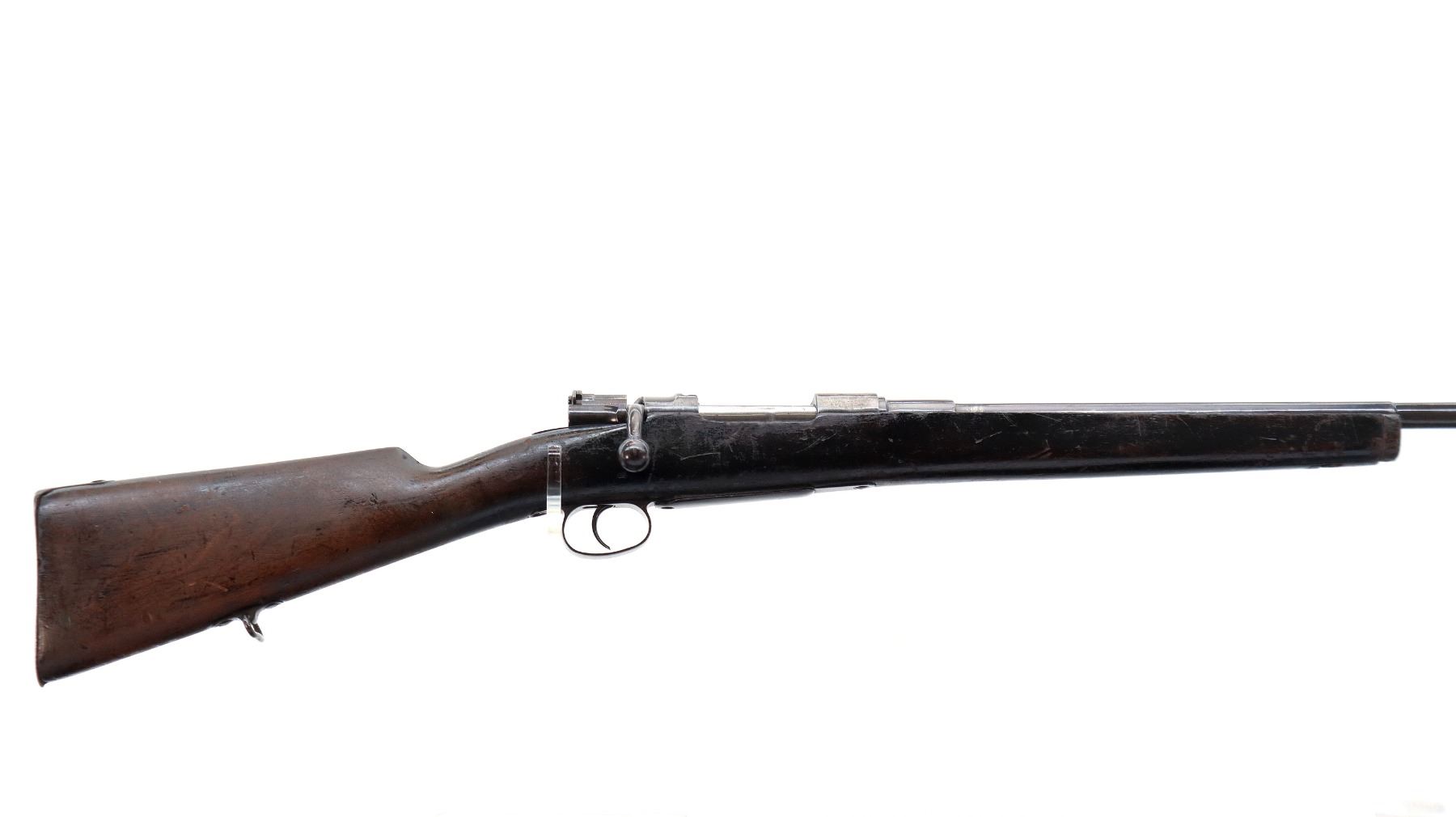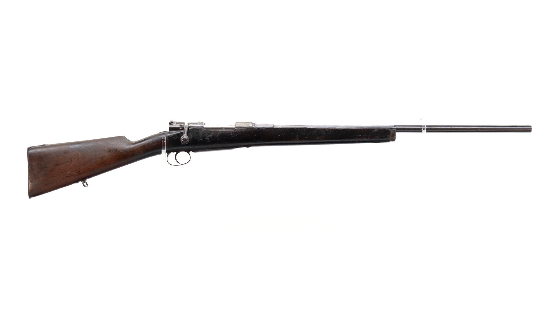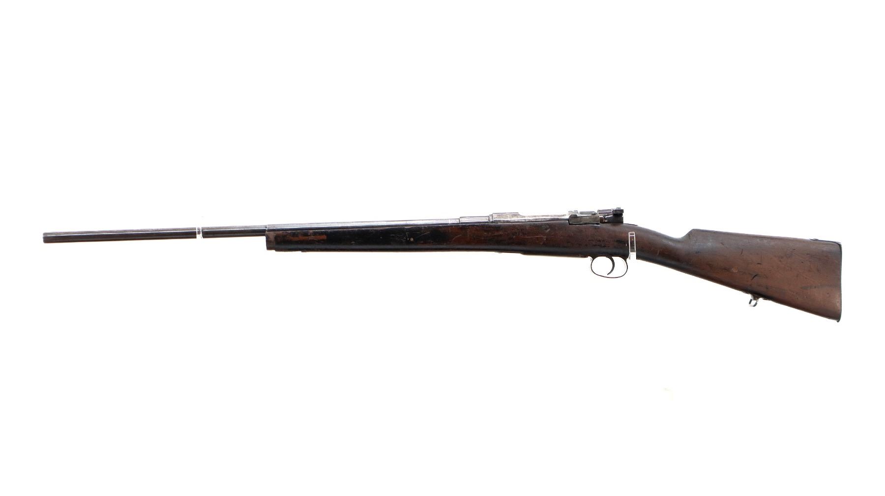 Main Description: Note: this appears to be a conversion from a Spanish Mauser to bolt action shotgun, chamber measures 28 G x 2" unsure if correct. Broken bead, blued finish, round barrel, turned down bolt handle. One piece sporterized wood stock, forend is chipped, straight grip, smooth steel butt plate, rear sling swivel only.