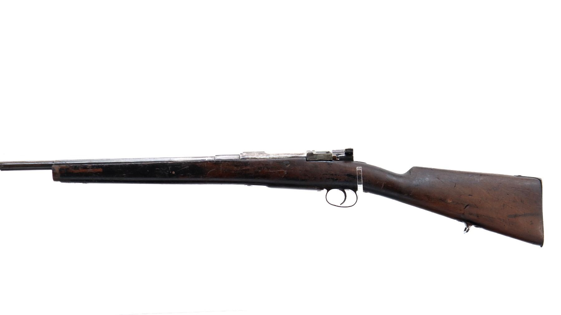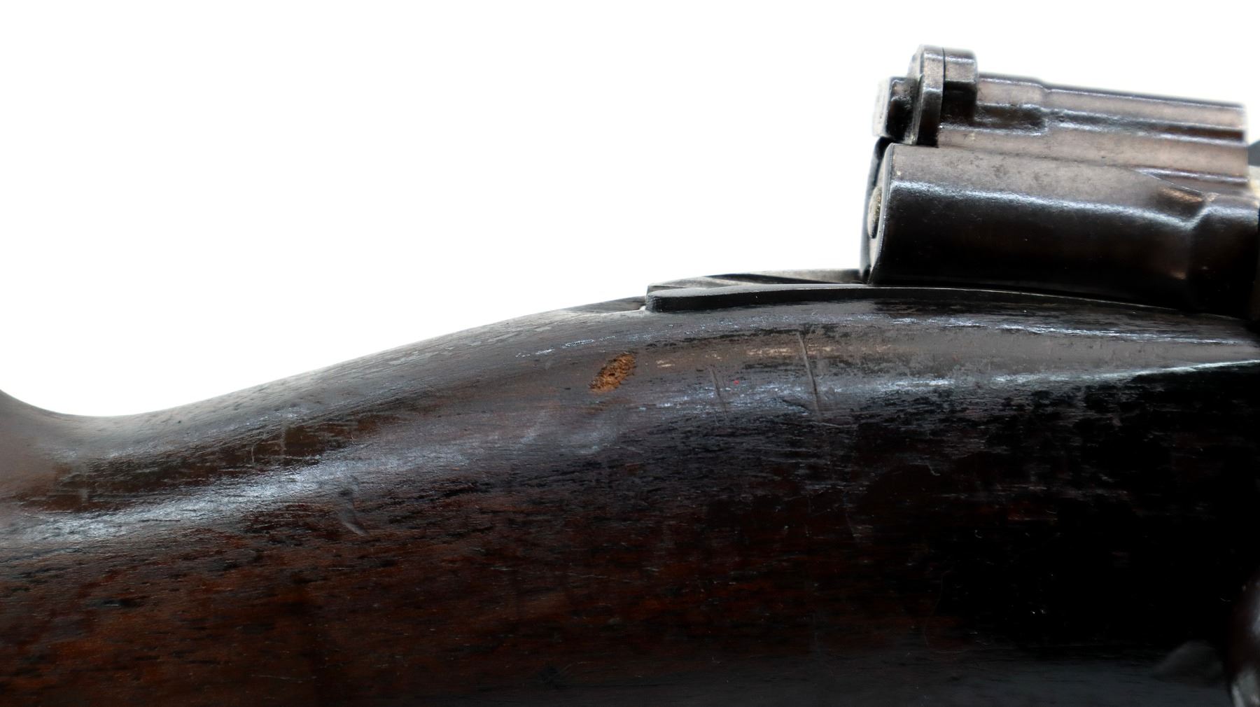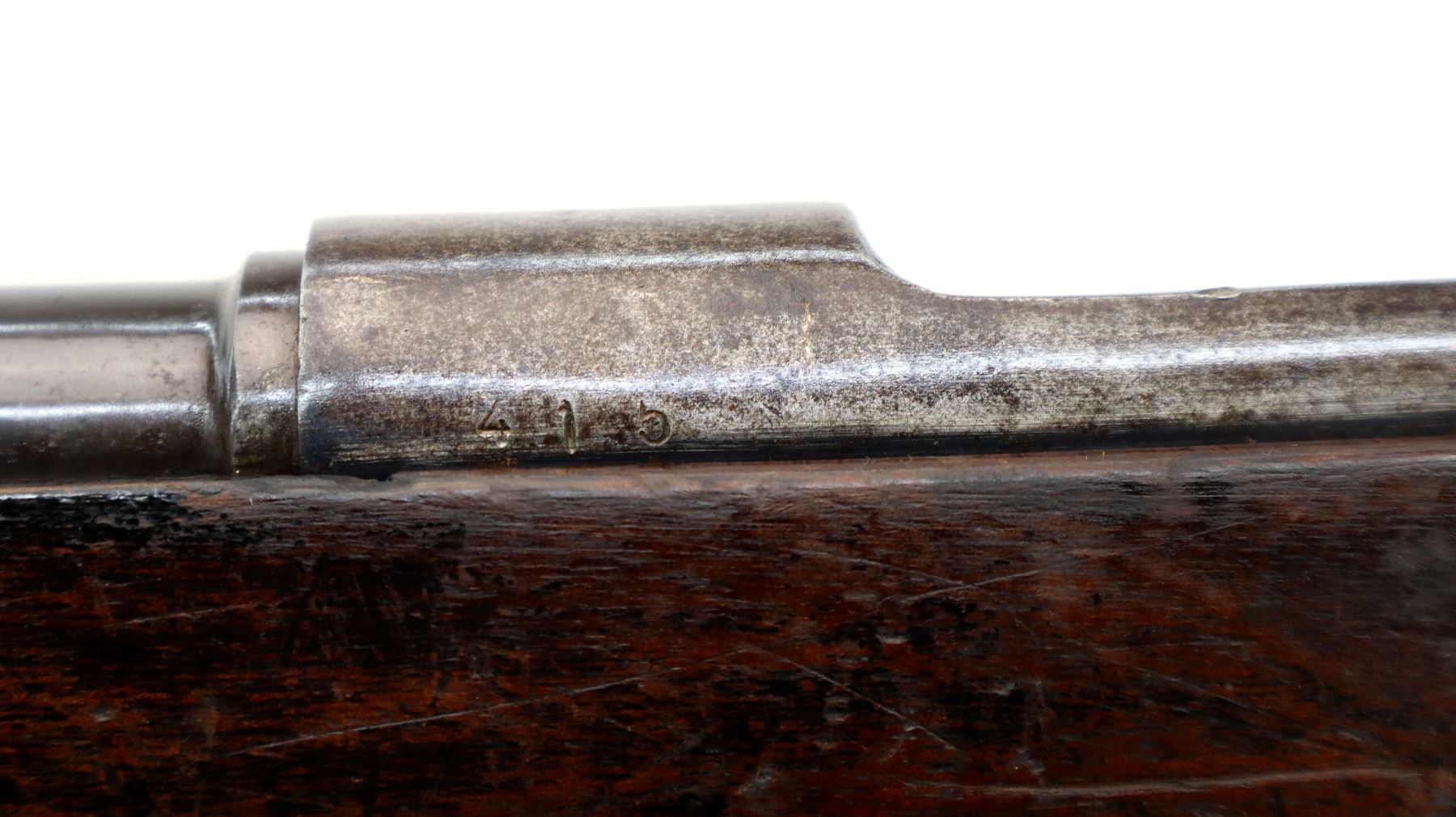 Main Description: Note: this appears to be a conversion from a Spanish Mauser to bolt action shotgun, chamber measures 28 G x 2" unsure if correct. Broken bead, blued finish, round barrel, turned down bolt handle. One piece sporterized wood stock, forend is chipped, straight grip, smooth steel butt plate, rear sling swivel only.
