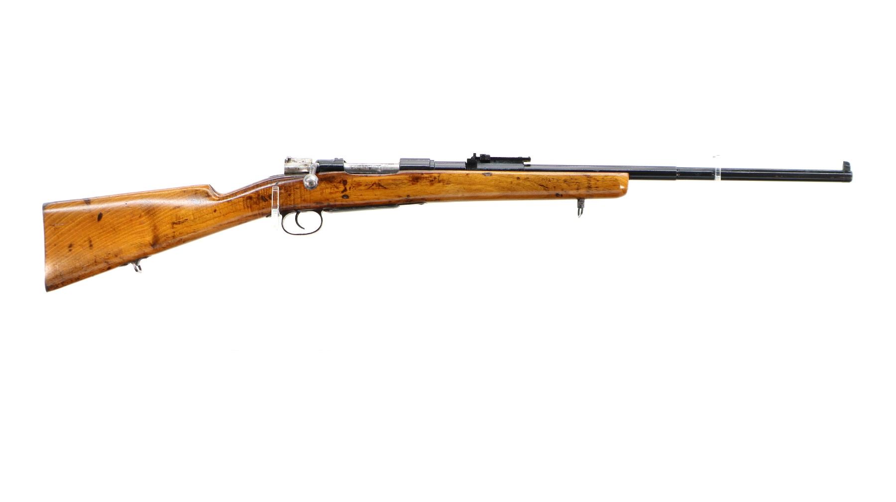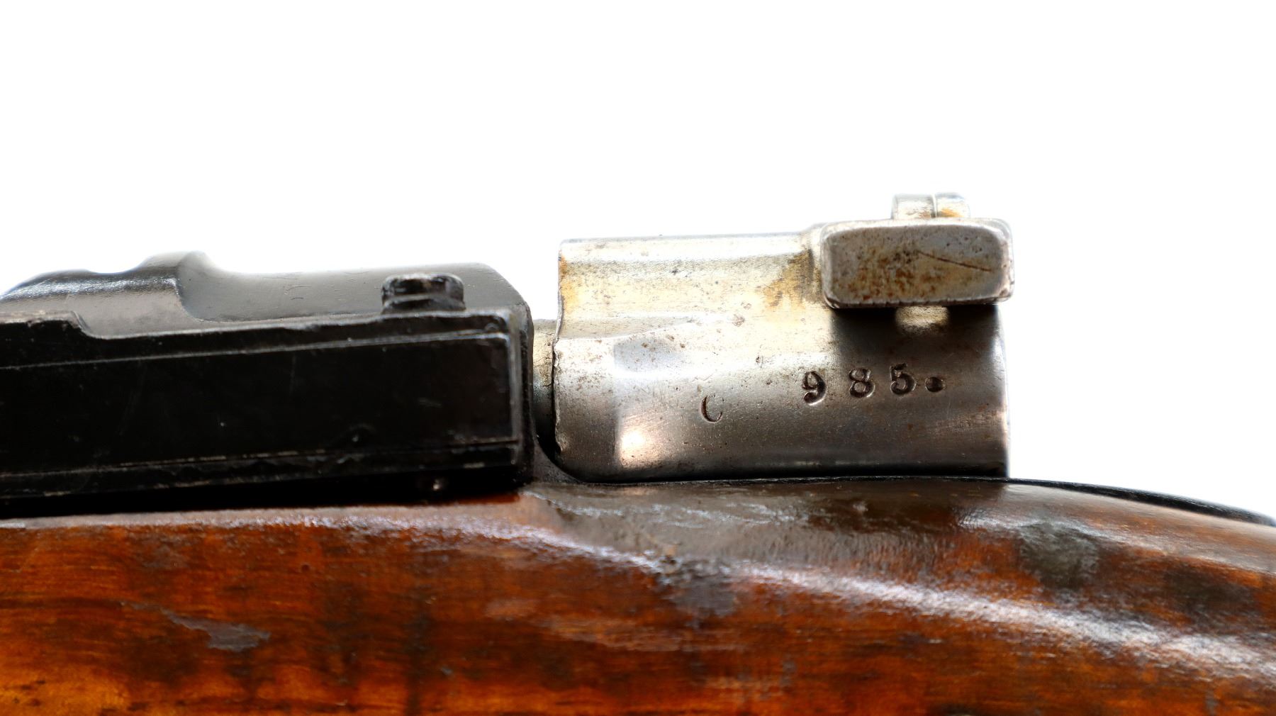 Main Description: Bolt matches. Barley corn front sight with ramp, adjustable u notched ladder rear sight, black painted metal finish, turned down bolt handle. One piece sporter wood stock, straight grip cracked behind receiver, smooth steel butt plate, sling swivels.