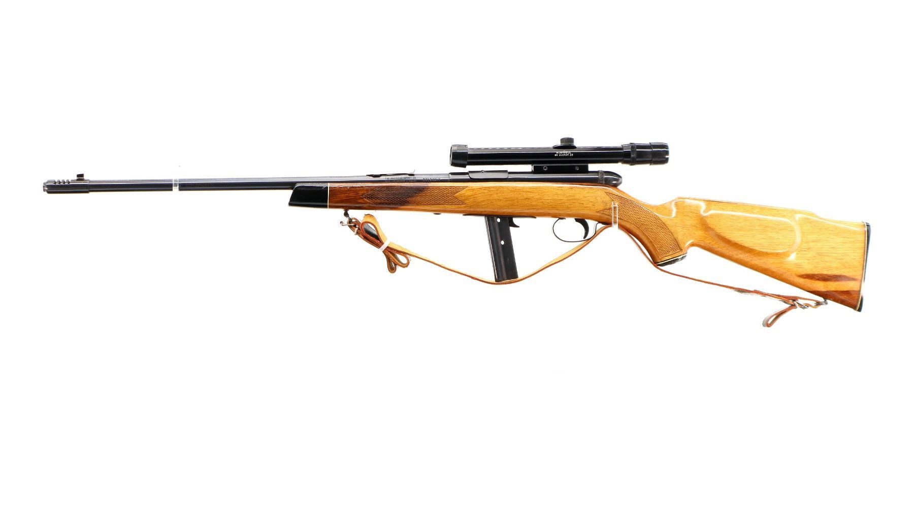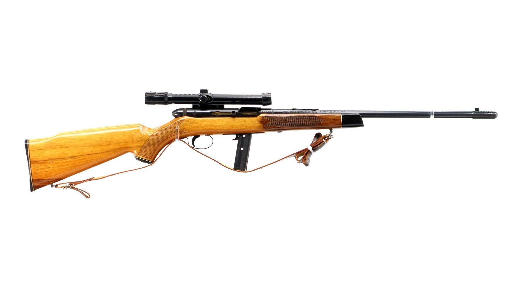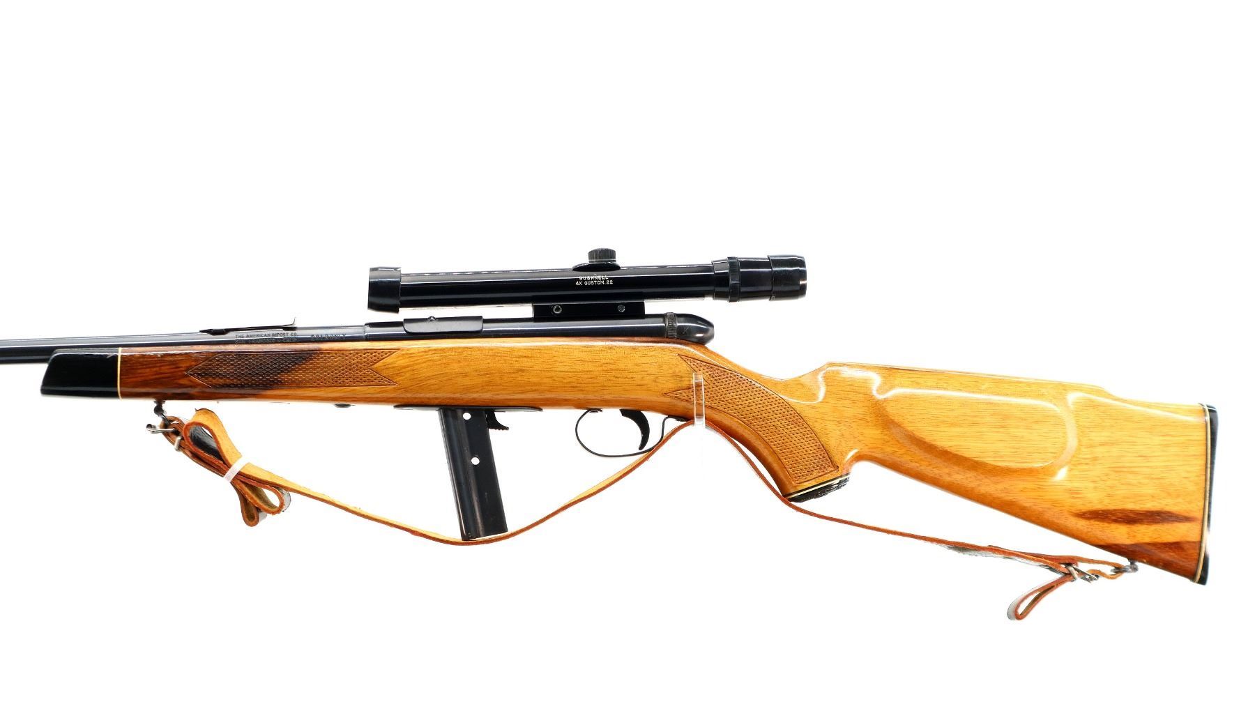 Main Description: Blade front sight, u notched rear sight missing elevator, blued finish, muzzle has ported brake installed, grooved receiver with Bushnell 4x custom 22 scope installed, clear optics with fine crosshair. One piece wood stock, black painted forend cap, checkered forearm and pistol grip, cheek rest, grooved black polymer butt plate, grip cap, sling swivels with brown leather sling.
