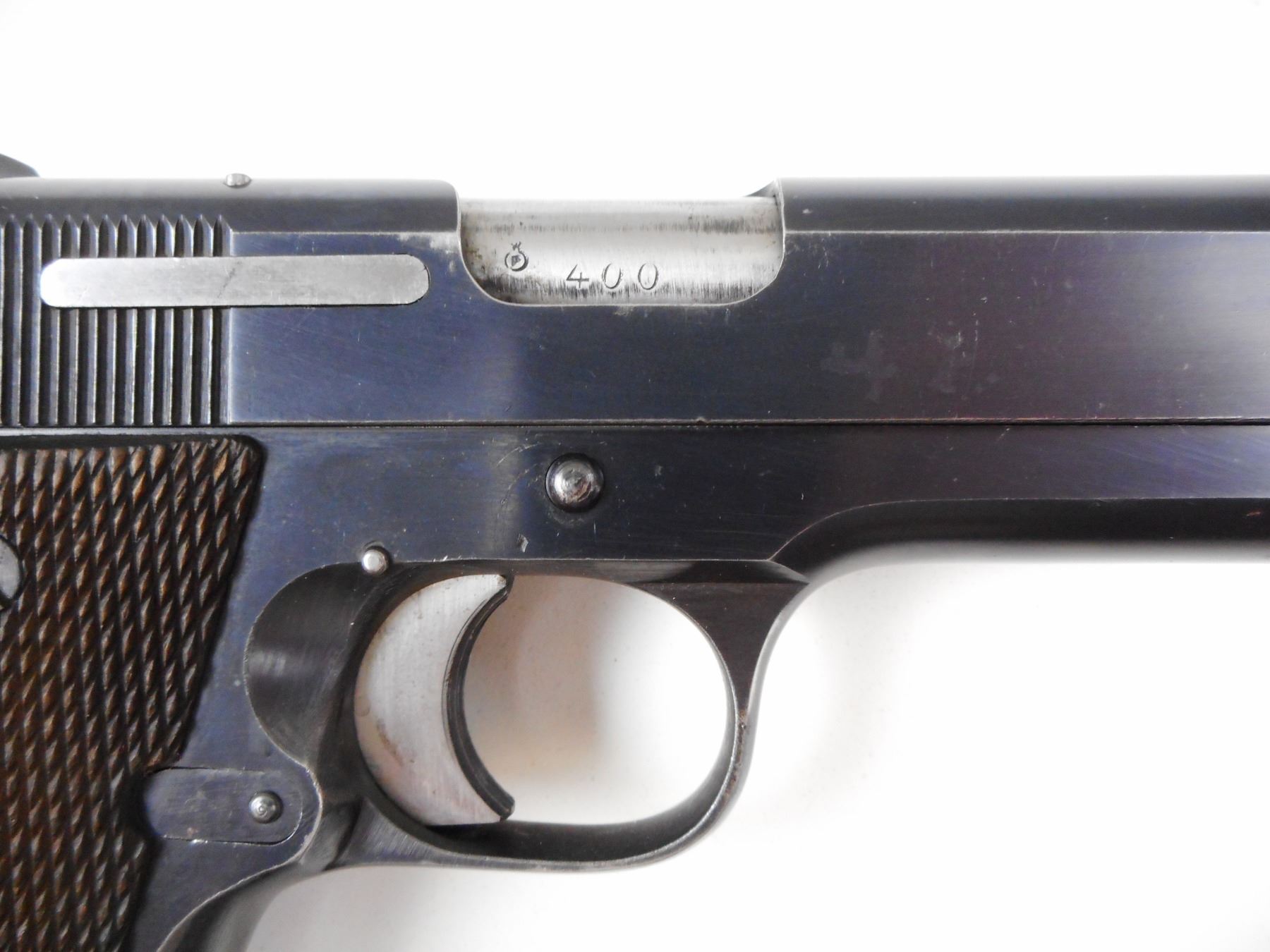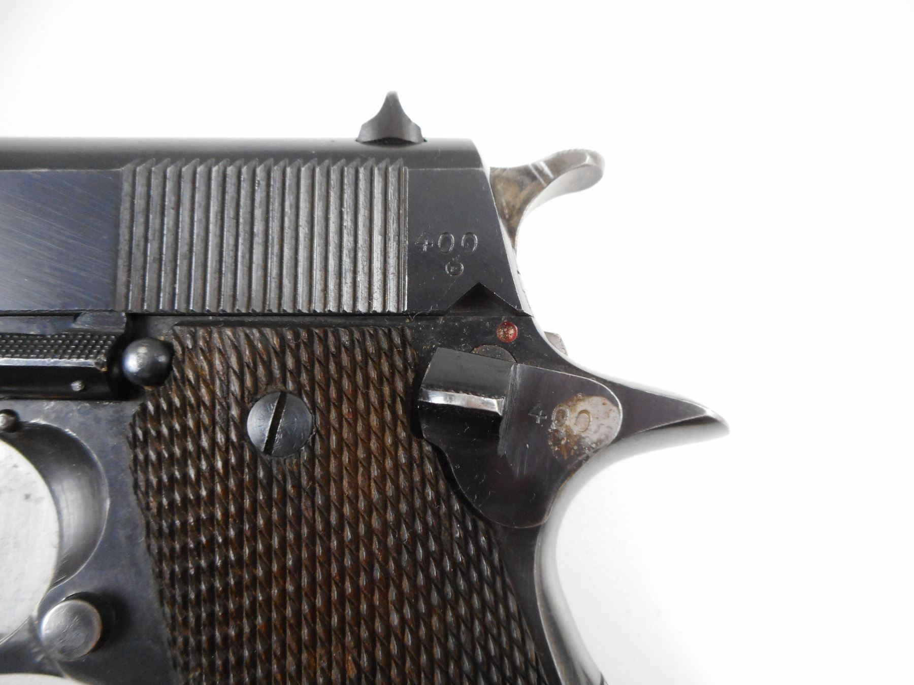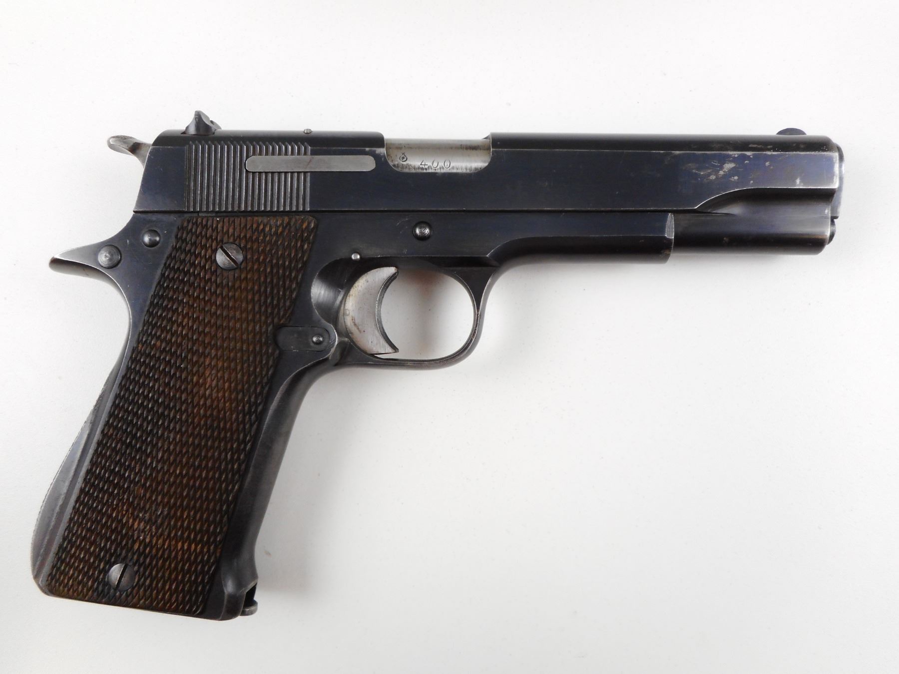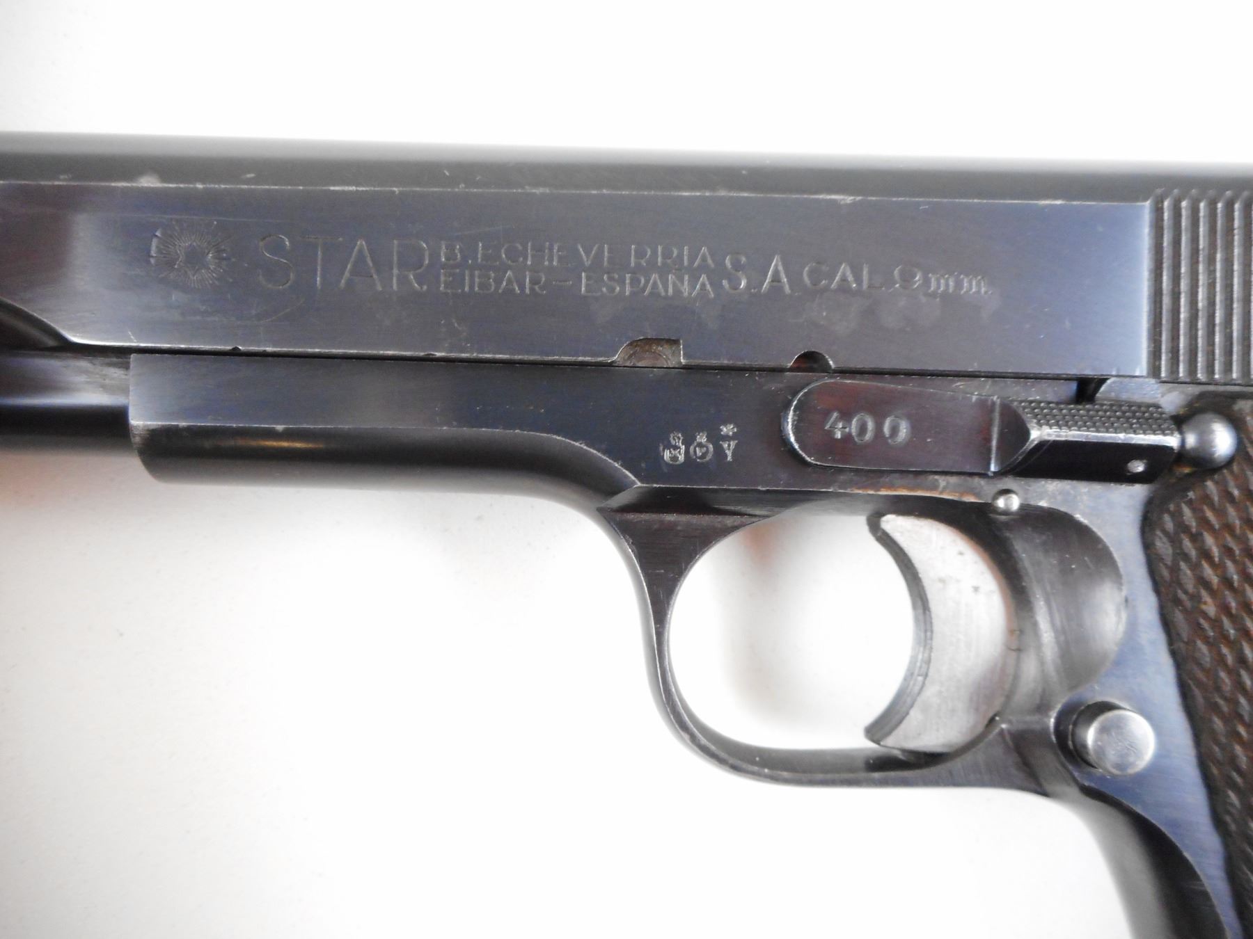 STAR , MODEL: B , CALIBER: 9MM LUGER , COMES WITH MAGAZINE, 9 SHOT CAPACITY, BLADE FRONT AND FIXED REAR SIGHTS, CHECKERED WOOD GRIP PANELS, SPANISH PROOF MARKS, SHOWS SOME HANDLING MARKS, GOOD BORE WITH SOME FROSTY ON LANDS , SERIAL # B413400 , STOCK # 4129 , ACTION: SEMI-AUTOMATIC HANDGUN , BARREL LENGTH: 127MM , CONDITION: 6/10 , CLASS: CANADIAN RESTRICTED CLASS