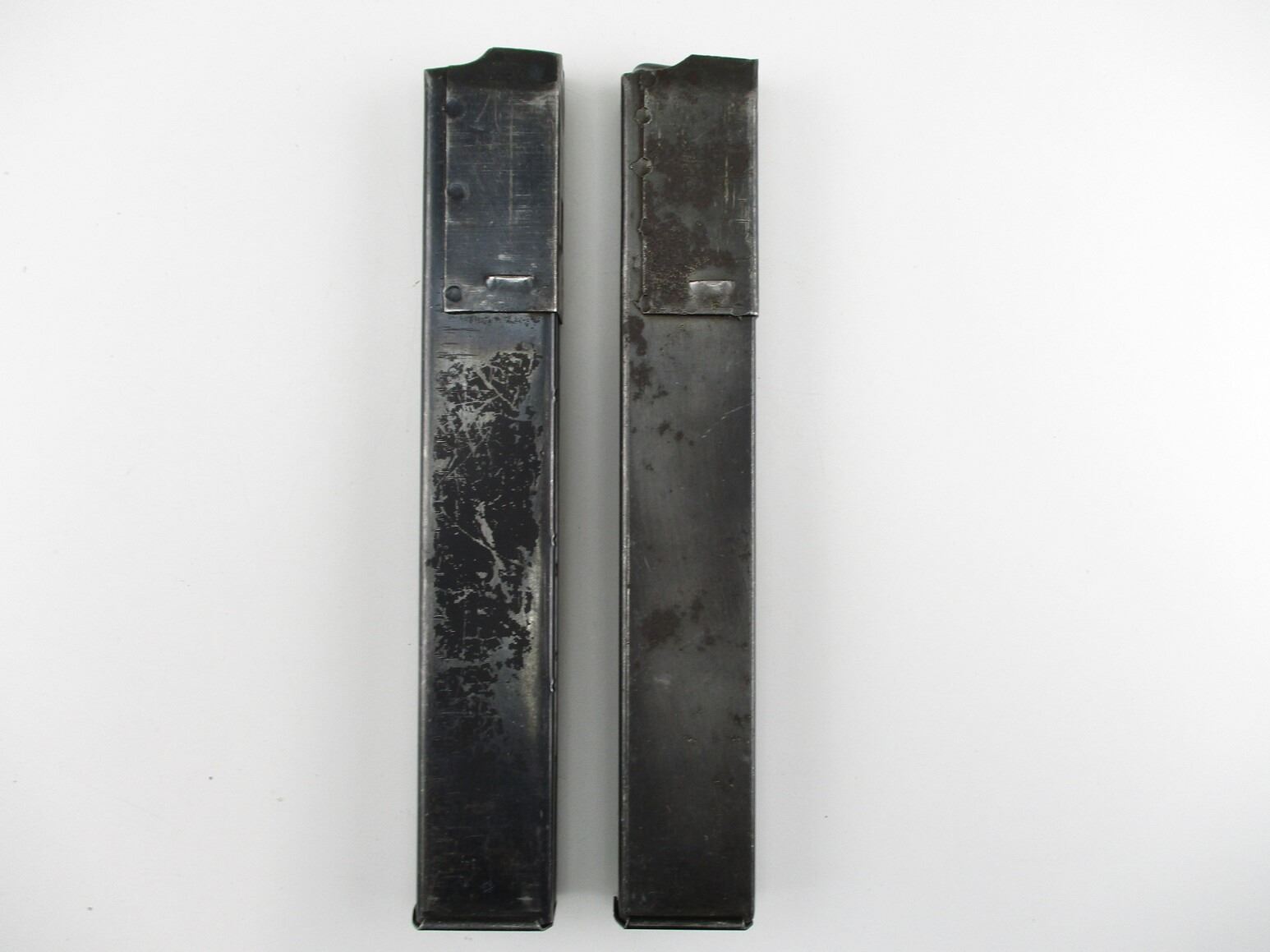 STEN SMG MAGAZINES , LOT OF 2. 9MM, 5/32 ROUND PINNED MAG, STEEL, 1 C-BROAD ARROW MARKED ON FRONT OF MAG, LB MARKED ON SIDE OF MAG, 1 MARKED "66" ON BASE, & STAR ON SIDE OF MAG. "BG" ON FLOOR PLATE.
