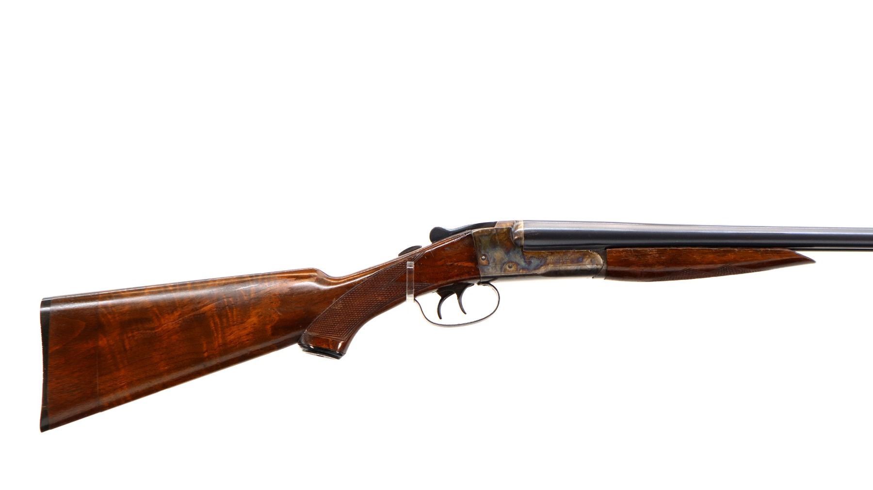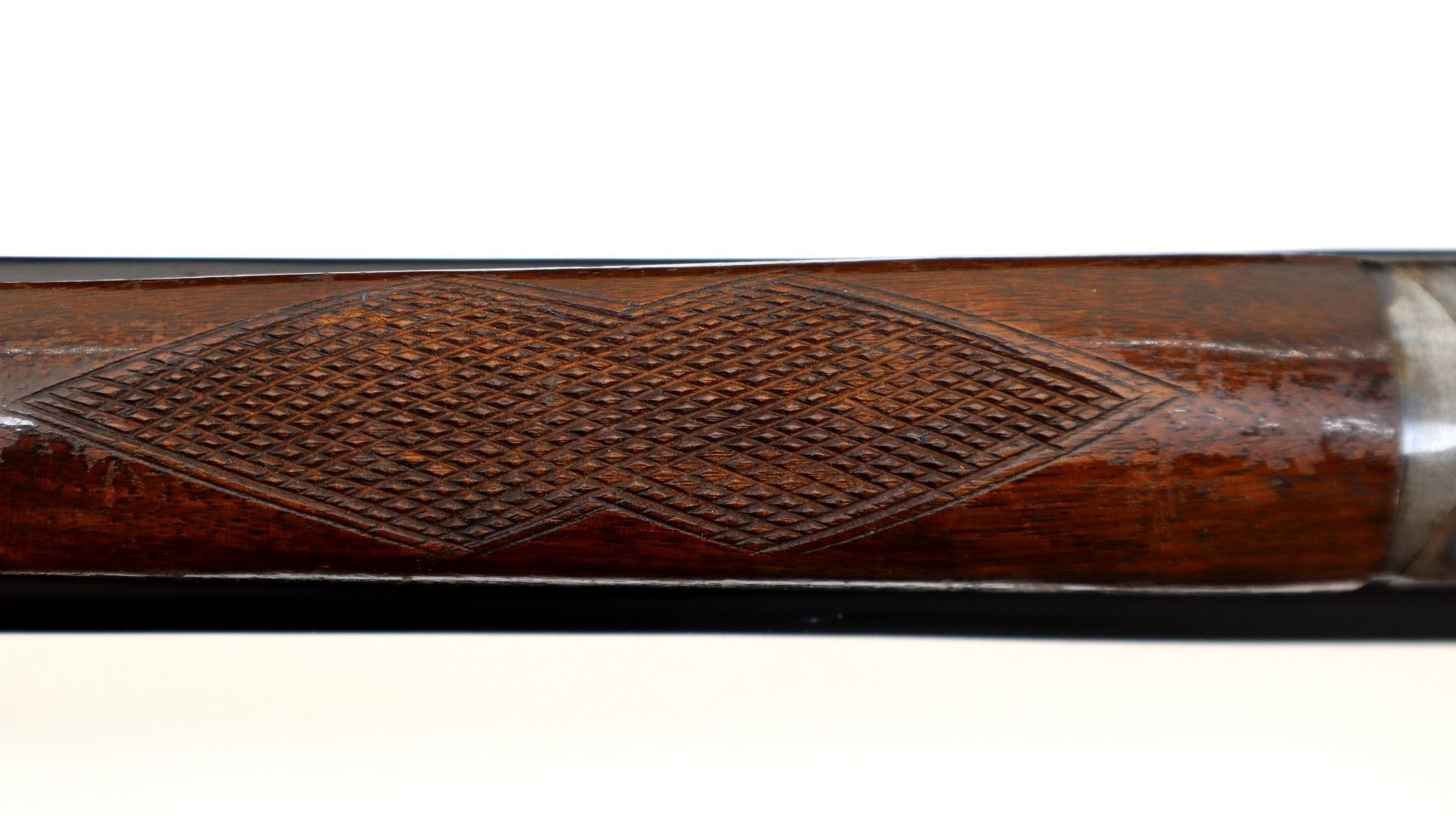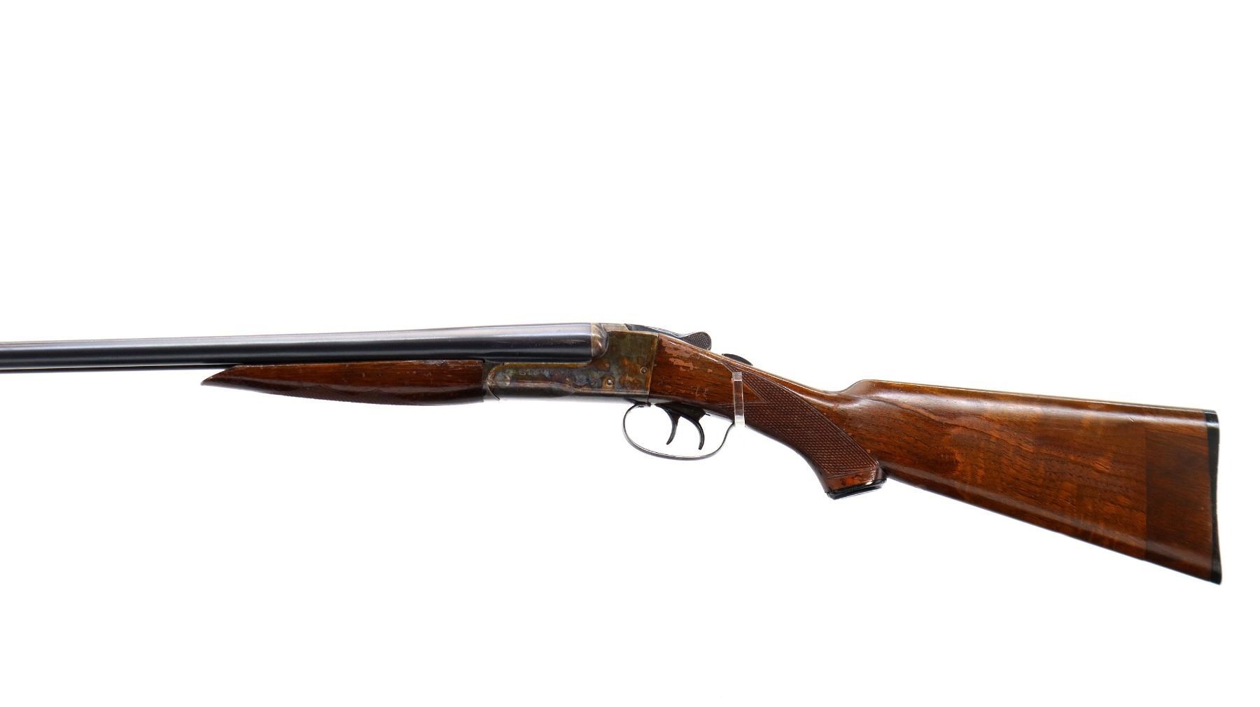 Main Description: Brass bead, blued barrels with raised rib with some lead solder showing on left side, colour case hardened receiver, automatic safety, extractor, double triggers. Two piece wood stocks, checkered forearm and pistol grip, grooved black polymer butt plate, stock has a wood extension and 14.25" LOP, grip cap