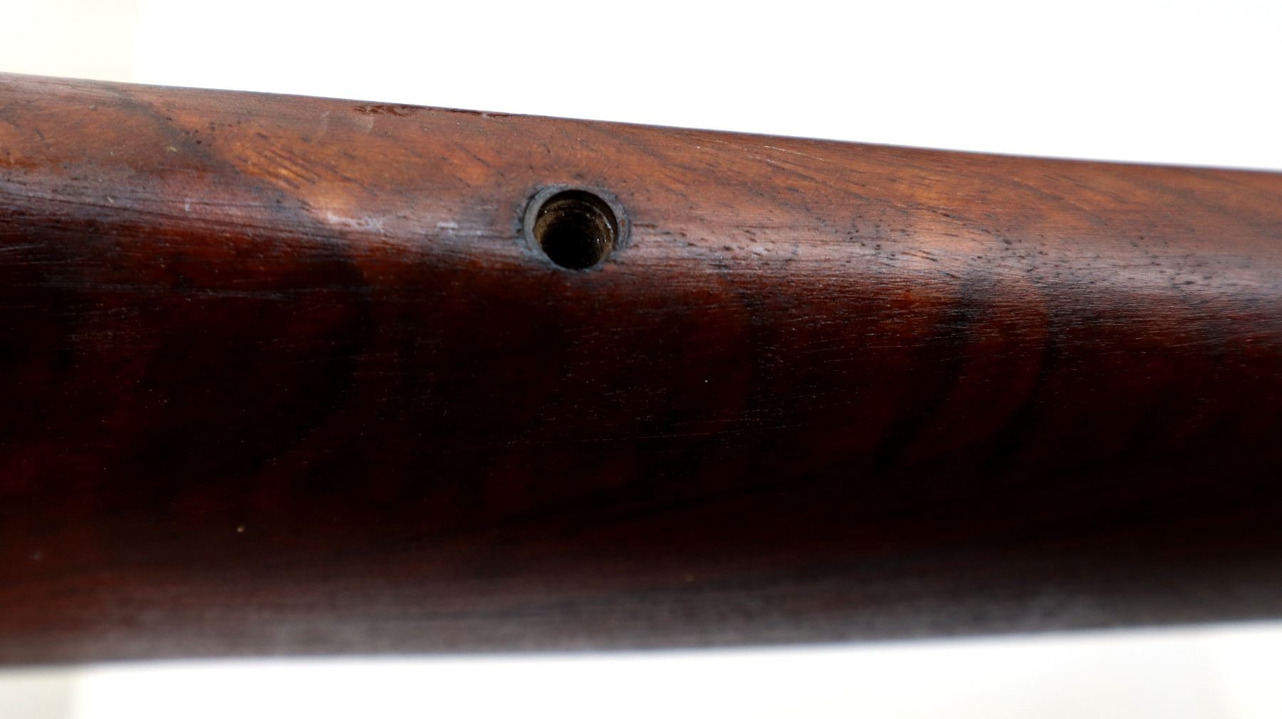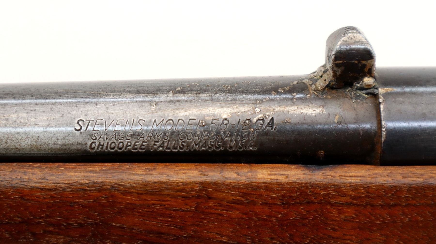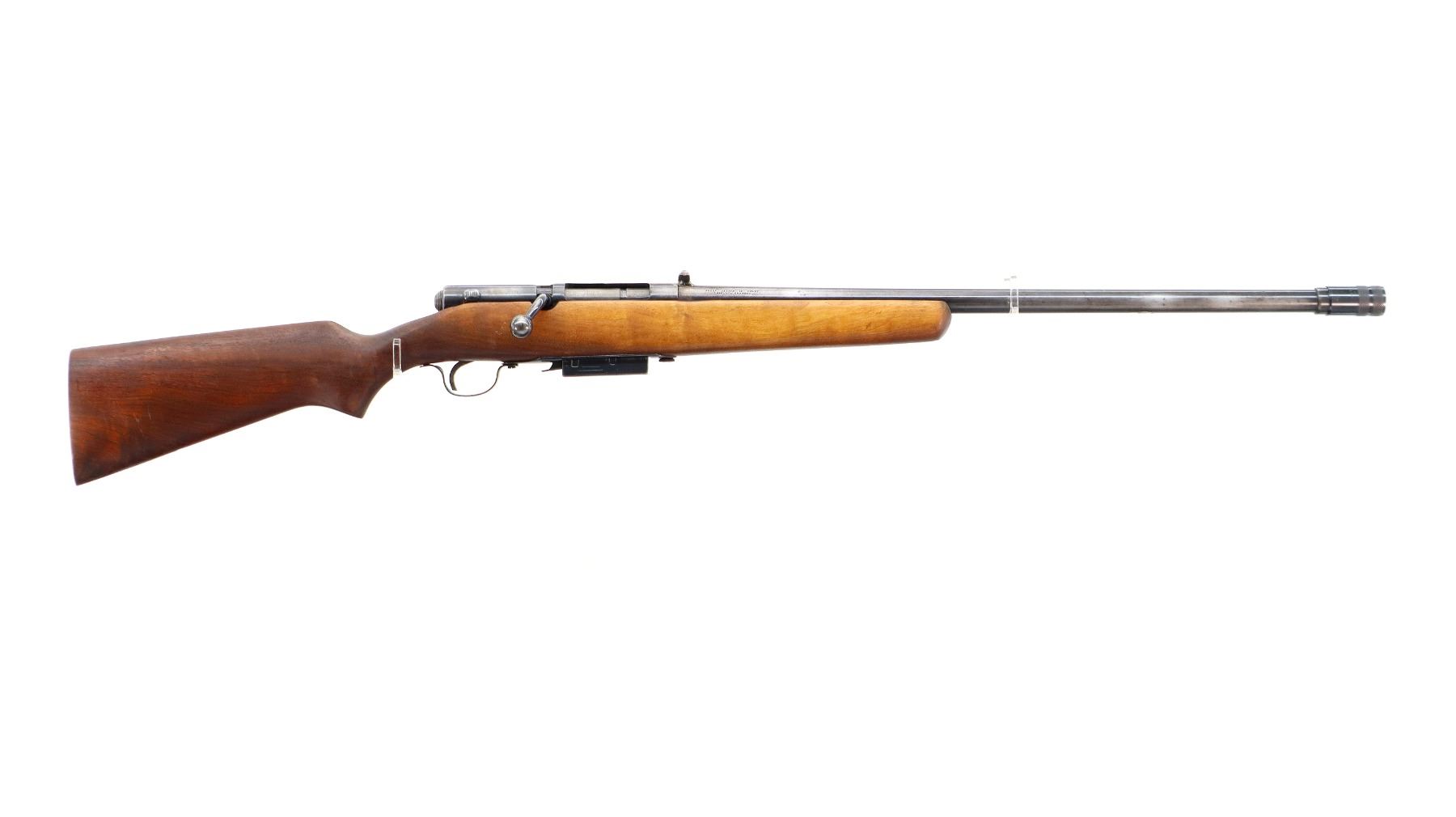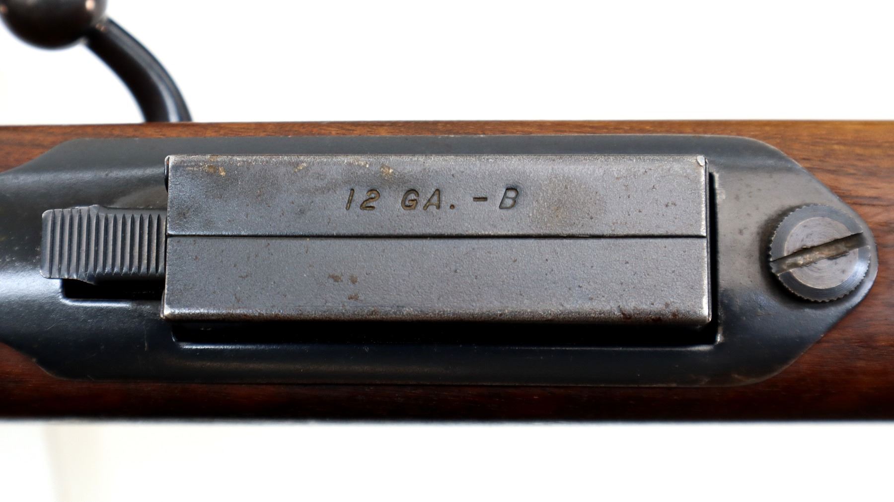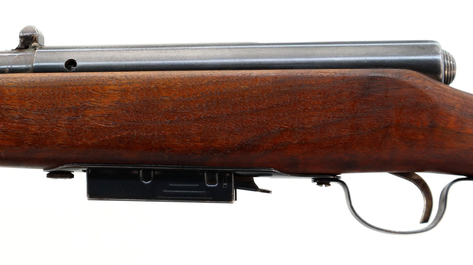 Main Description: Missing bead hole is present, lug welded on back of barrel, blued finish, smooth bolt knob. One piece wood stock, pistol grip, missing butt plate and screws, missing front and rear swivels hole is present.