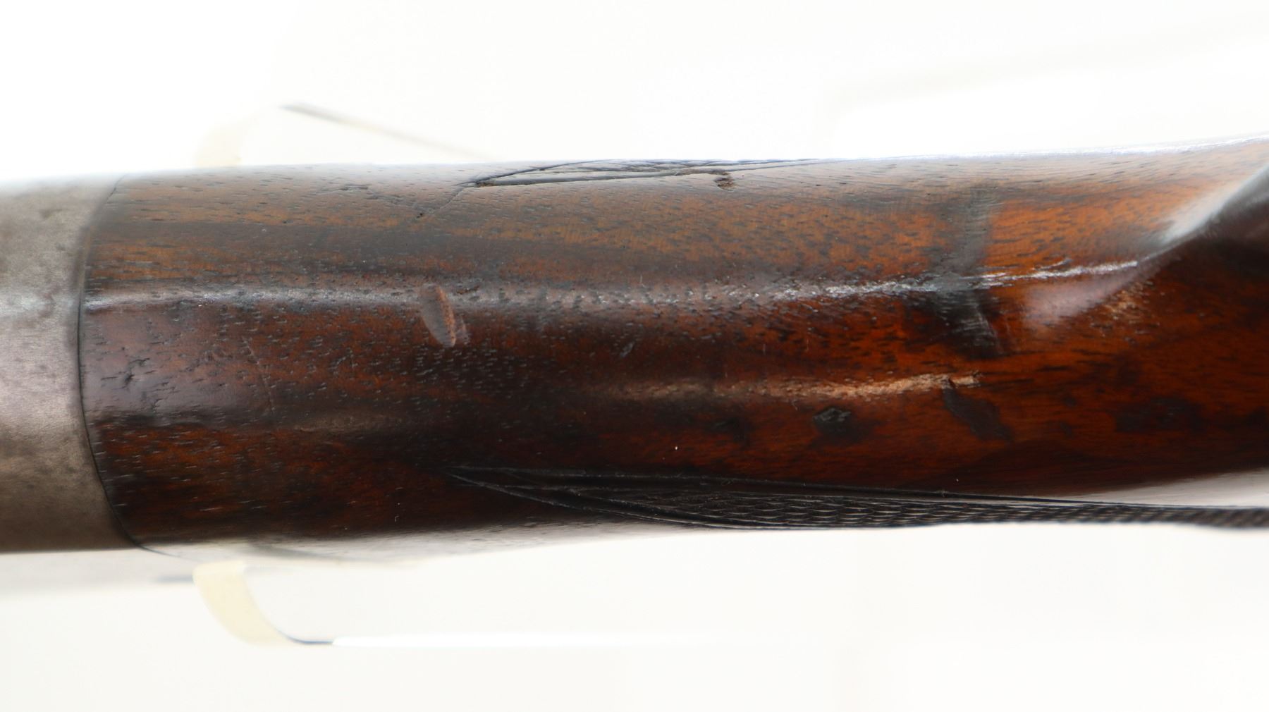 Main Description: Brass bead, round barrel. Two piece wood stocks, checkered forearm and pistol grip cracked behind trigger guard, grooved black polymer butt plate.