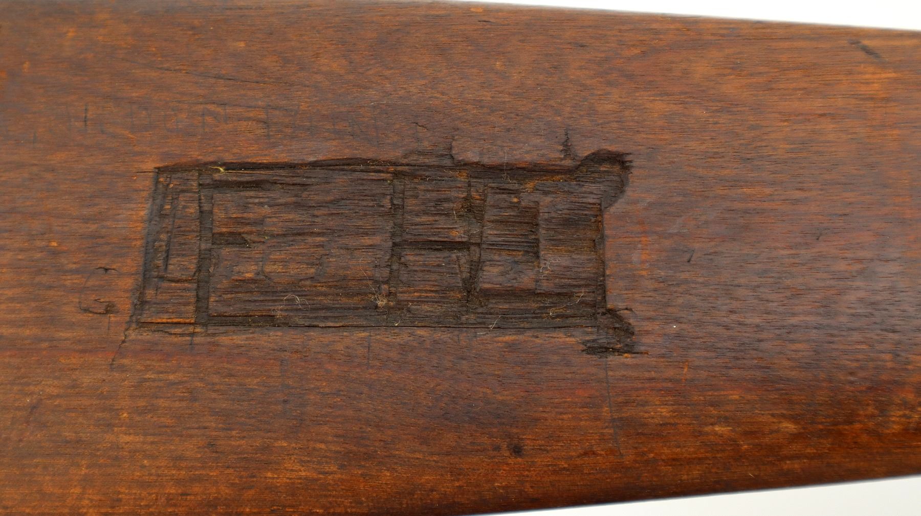 Main Description: Blade front sight, u notched rear sight, spur hammer and smooth opening lever. Two piece smooth wood stocks, forearm is chipped, straight grip, chipped cracked and repaired , smooth steel butt plate, carving on right side of stock