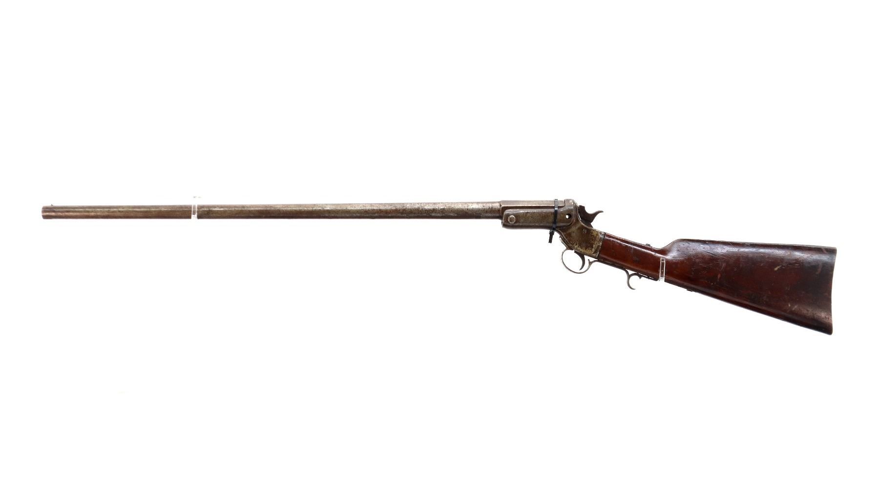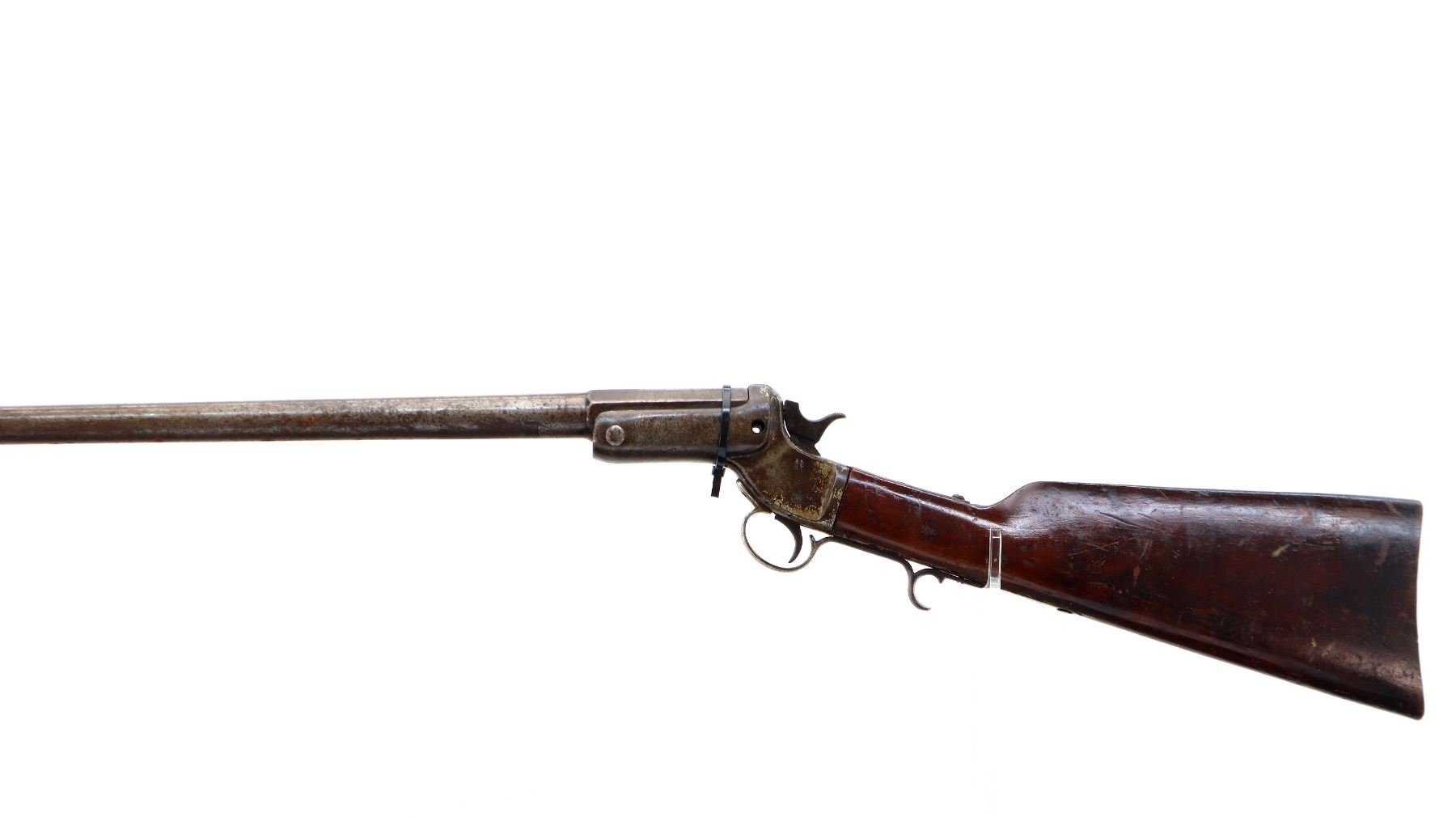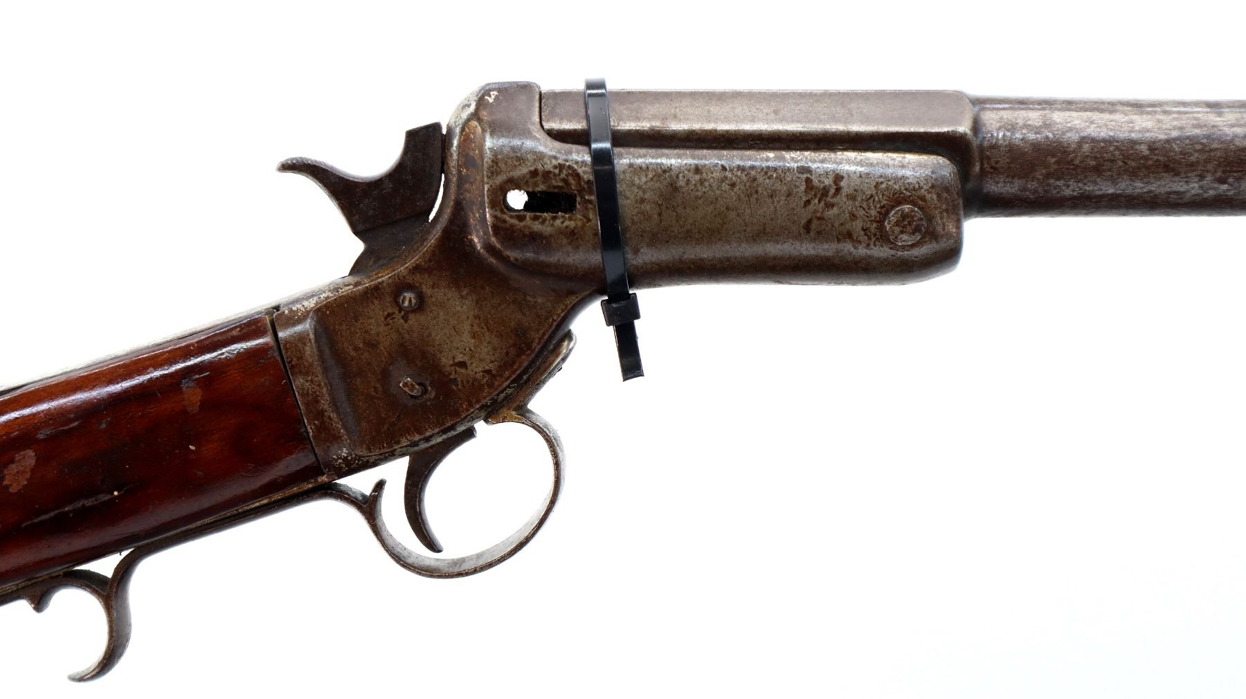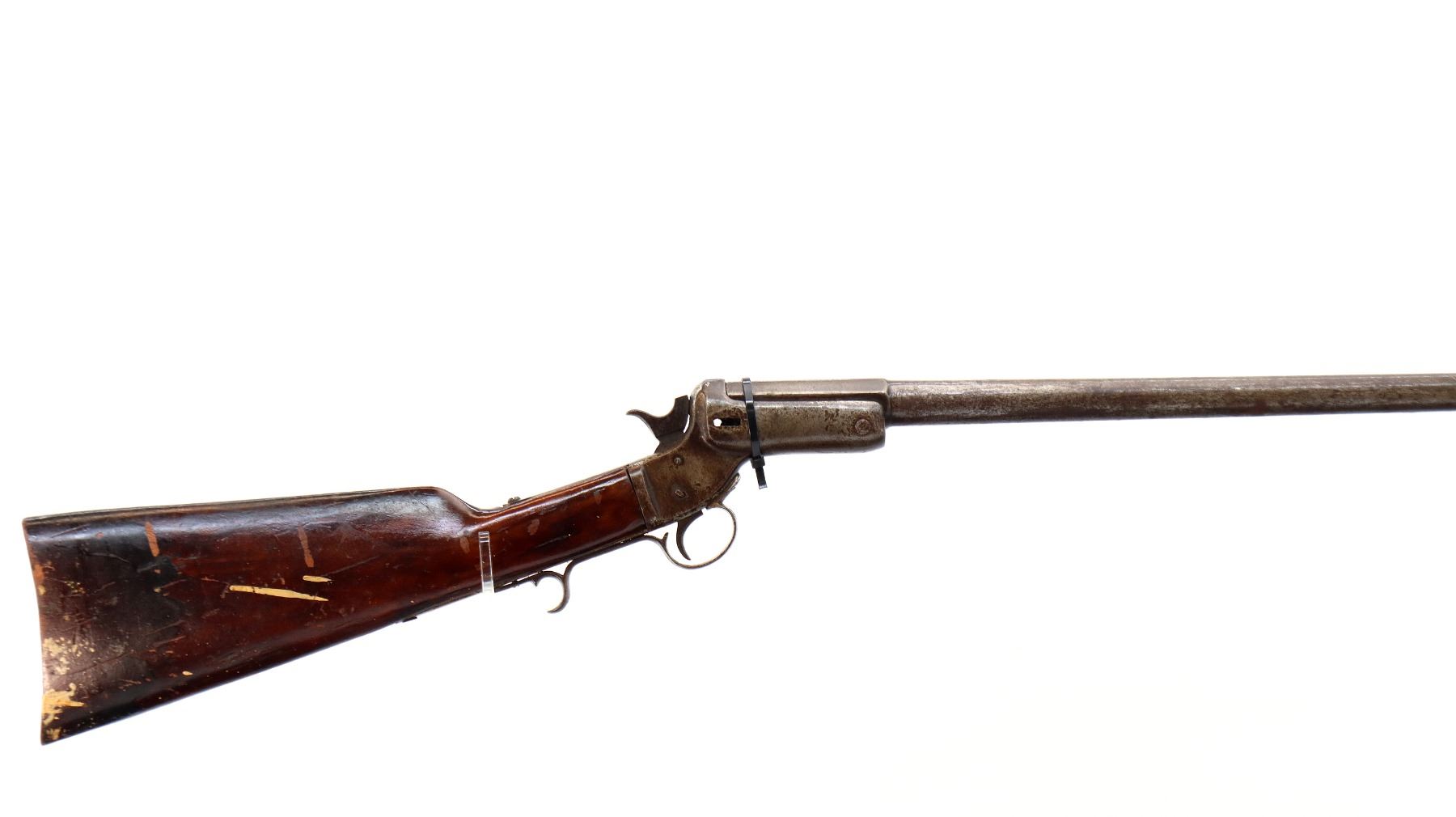 Main Description: Brass bead, round barrel, missing barrel locking latch, has a checkered spur hammer. One piece smooth wood stock, straight grip, chipped and cracked behind receiver, missing butt plate and screws, has a finger rest trigger guard.