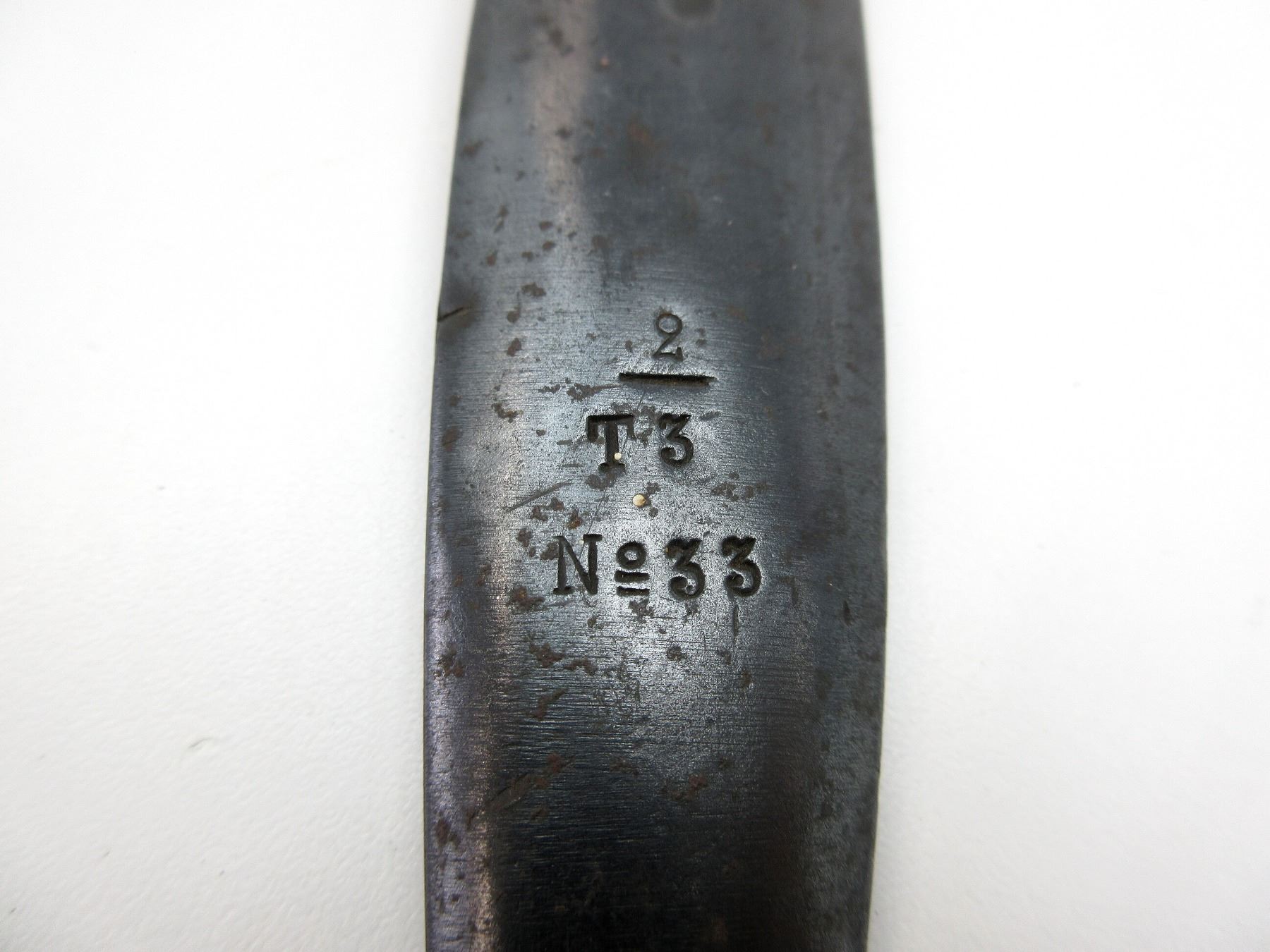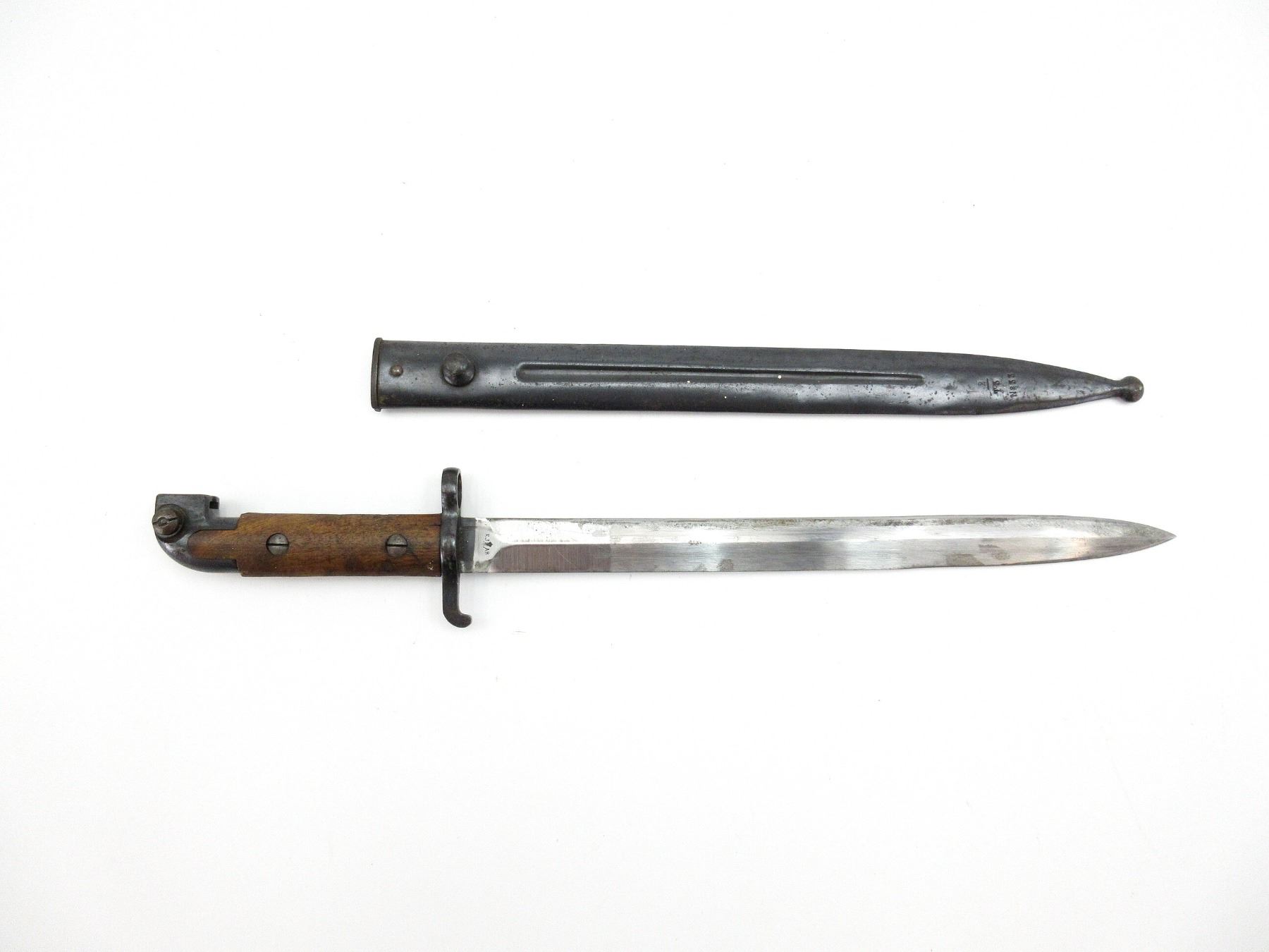 (1) FITS 6.5MM M1894/14 MAUSER CARBINES & 9MM CARL GUSTAF M1945C SUB-MG'S, RICASSO MARKED: "EJ" ANCHOR SYMBOL "AB", SPRING-LOADED CATCH RELEASE, 2-PIECE WOOD GRIP, METAL IN-BETWEEN GRIP MARKED WITH CROWN, METAL POMMEL HAS CROWN, METAL SCABBARD, NEAR THROAT MARKED WITH VARIOUS FAINT / UN-CLEAR MARKINGS, NEAR BALL-TIP MARKED: "2" OVER "T3", OVER "NO 33", BALL-TIP MARKED WITH CROWN, BLADE APPROX 13 1/8" & OAL APPROX 18 1/8". SEE PHOTOS.