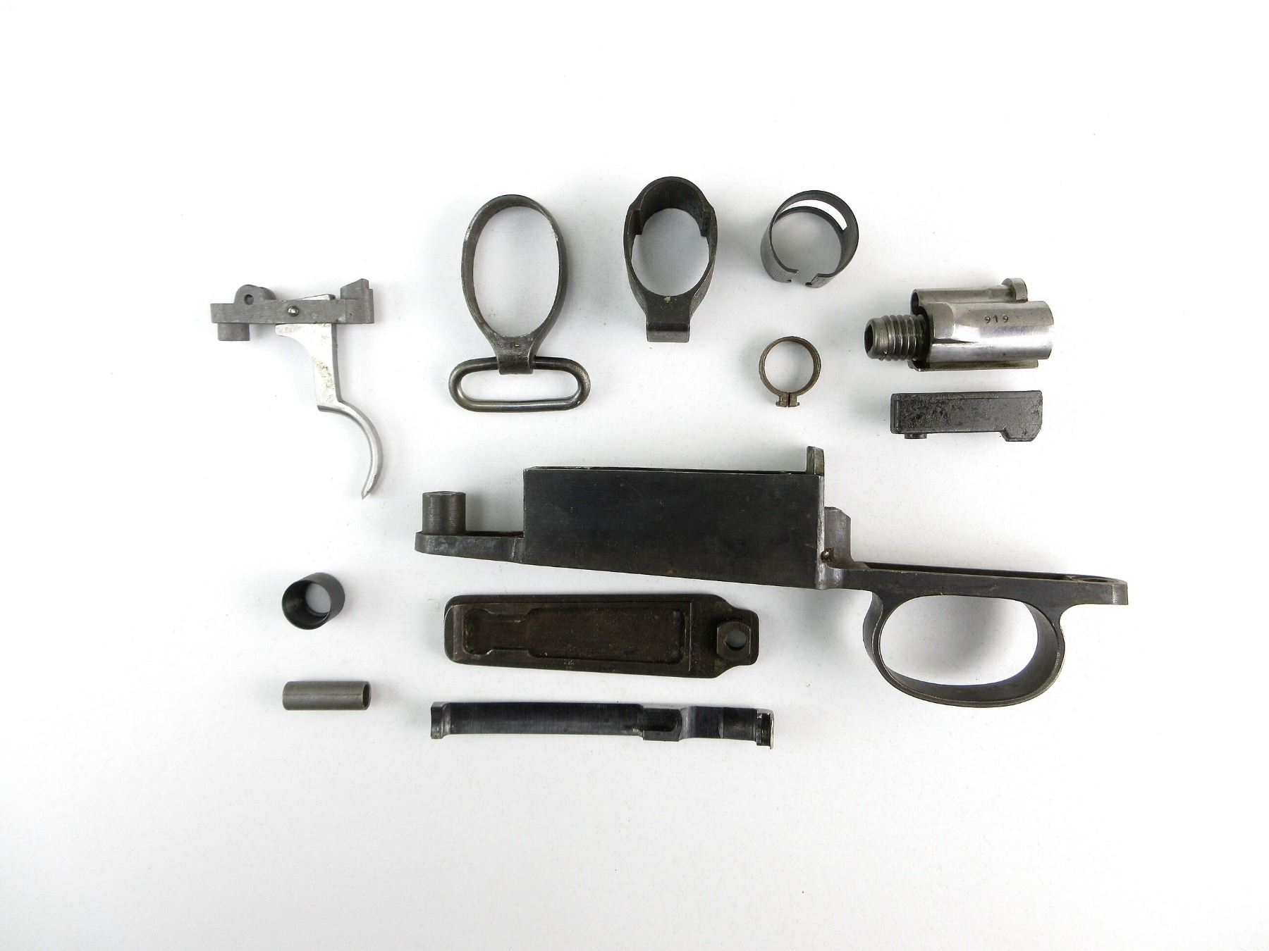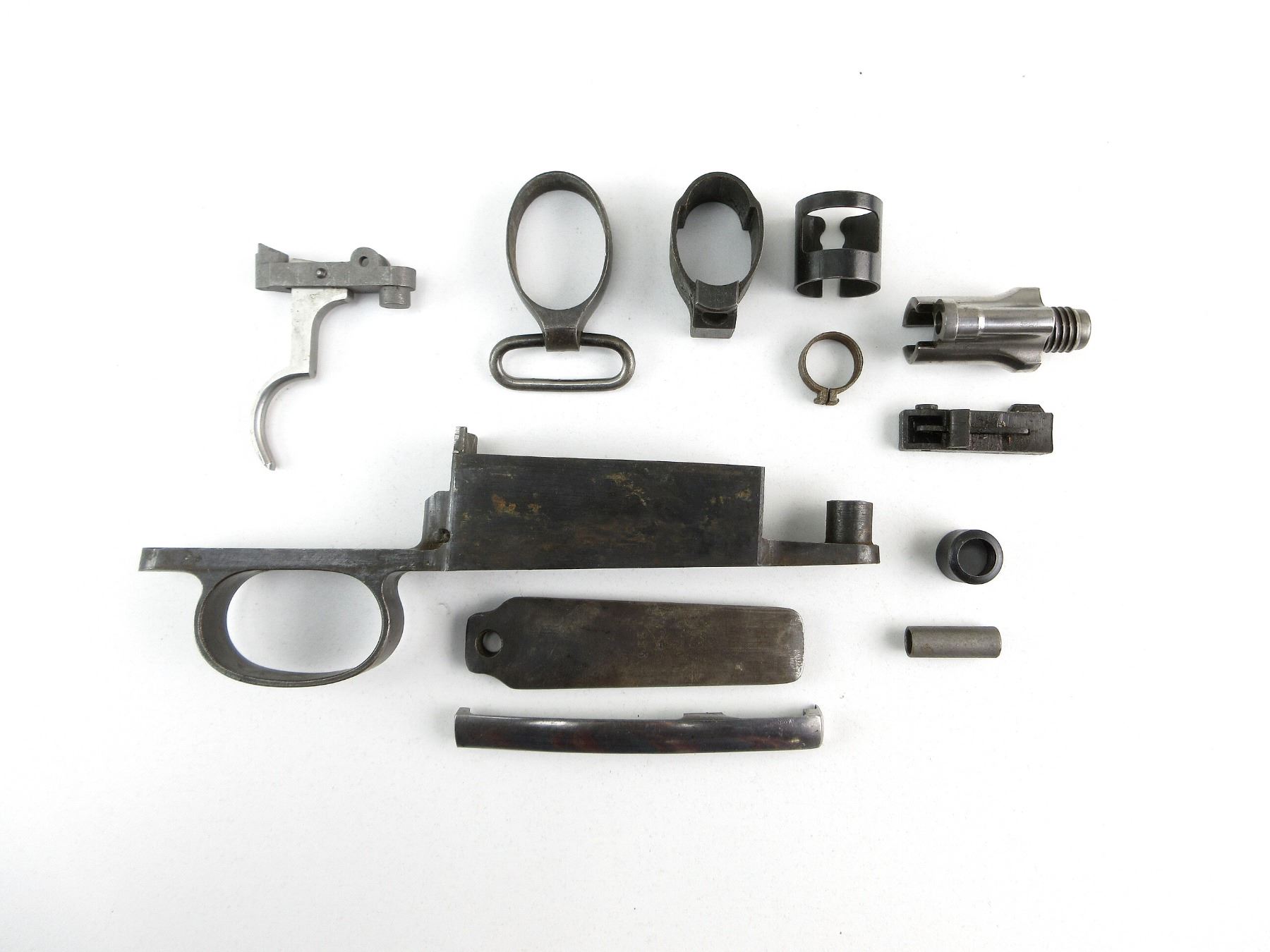 LOT INCLUDES; (1) TRIGGER GUARD, BLUED STEEL CONSTRUCTION, MARKED: "255", WITH CROWN, (1) BOLT SLEEVE, MARKED: "919", (1) EXTRACTOR, (1) TRIGGER, WITH VARIOUS BARREL BANDS, FLOOR PLATE, ETC. SEE PHOTOS.