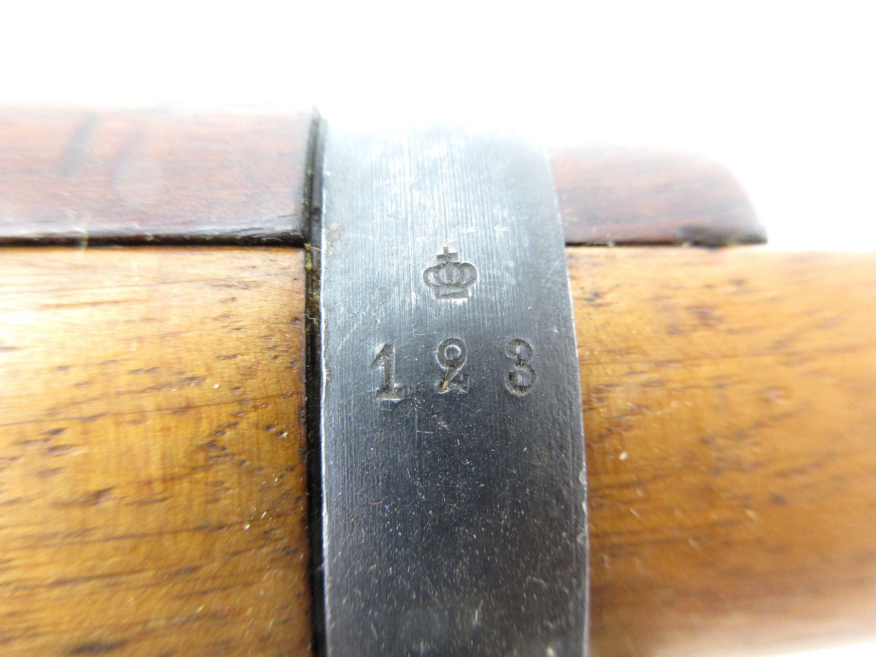 (1) WOOD RIFLE STOCK WITH HAND GUARD, STOCK MARKED: "L?", METAL BUTT PLATE MARKED: "?" OVER CROWN OVER "859", METAL FITTING WITH CROWN, METAL BARREL BANDS, BAND AT MUZZLE MARKED: CROWN OVER "498", MIDDLE BAND MARKED: CROWN OVER"123", METAL SLING SWIVELS, OAL APPROX. 45". MAY REQUIRE FITTING. SEE PHOTOS.