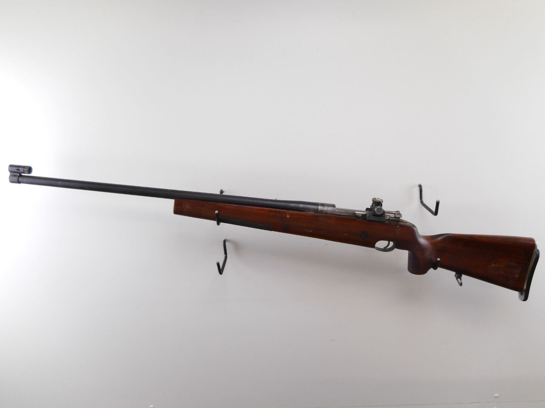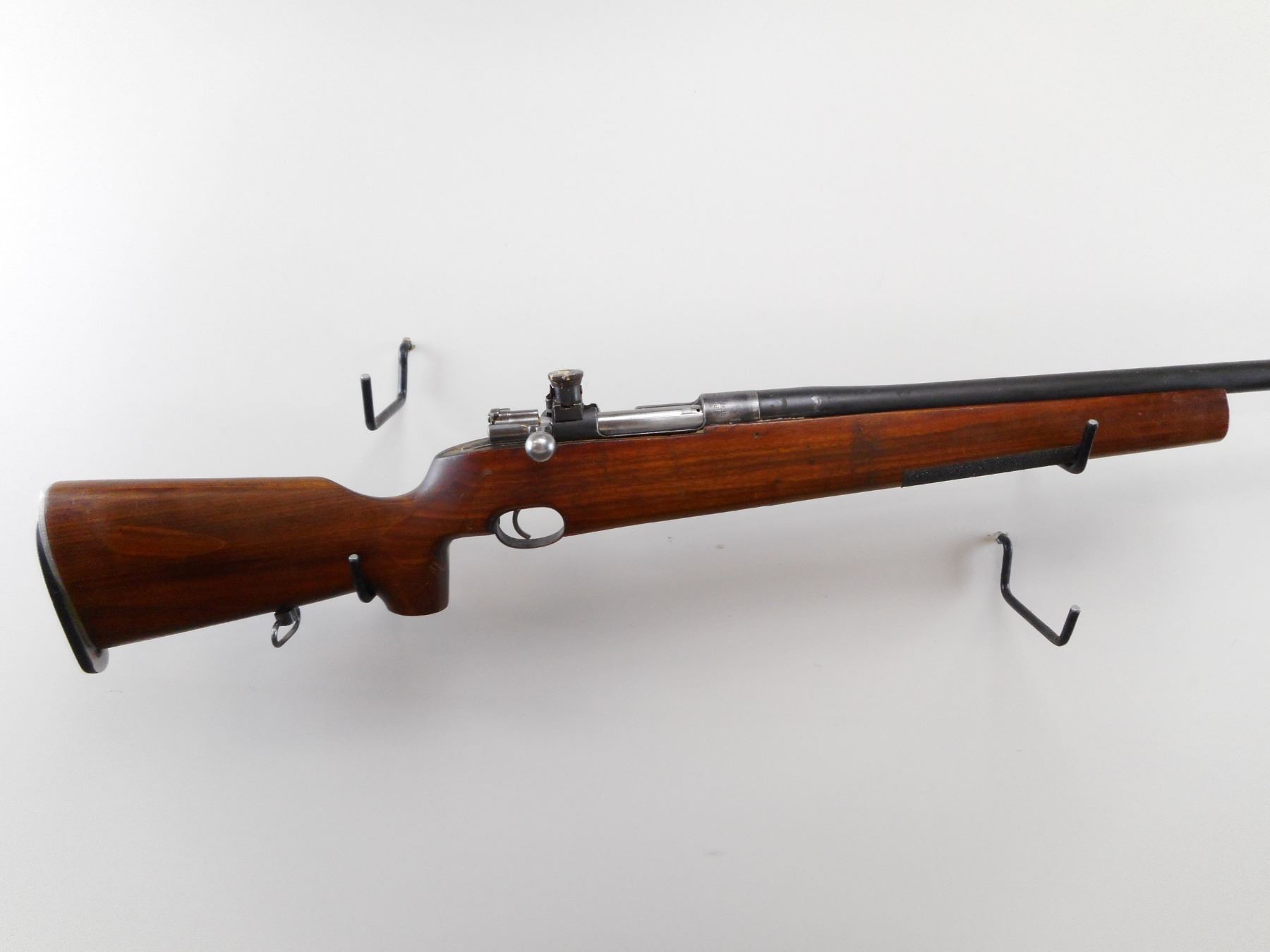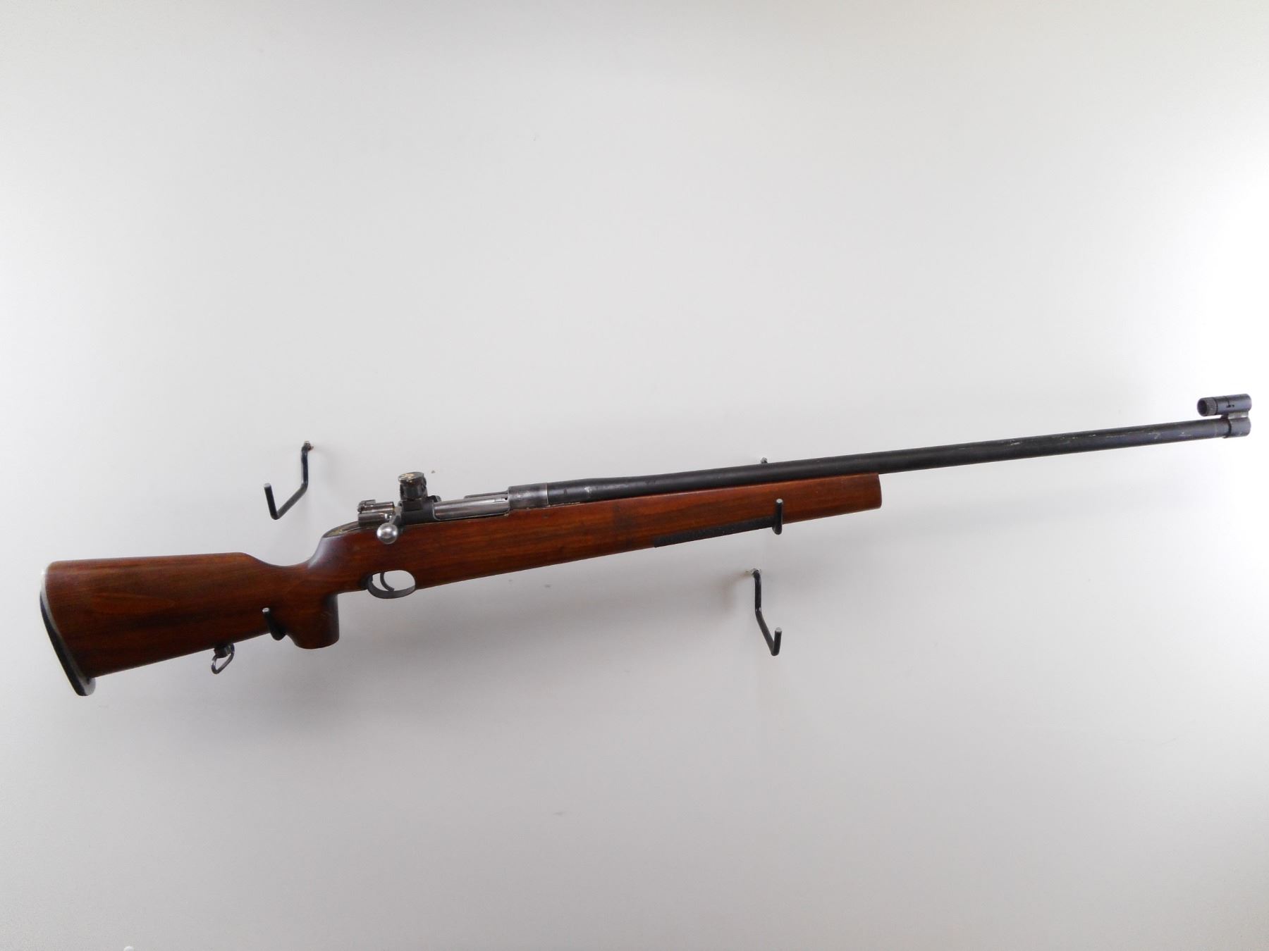 SWEDISH MAUSER , MODEL: CG80 , CALIBER: 6.5 X 55 SWEDISH MAUSER , MADE BY CARL GUSTAF 1904. BORE IS VERY GOOD. HEAVY BULL BARREL. GLOBE FRONT SIGHT. ADJUSTABEL REAR PEEP SIGHT. ***RIGHT HAND STRAIGHT BOLT HANDLE. ONE PIECE LEFT HAND STOCK.*** TEXTURED TAPE ON FOREARM. ALUMINUM HAND RAIL. PALM SWELL. ADJUSTABLE BLACK RUBBER BUTT PLATE. REAR SLING SWIVEL. STEEL FLOOR PLATE AND TRIGGER GUARD. METAL FINISH SHOWS SCRATCHES AND HANDLING MARKS. STOCK SHOWS SCRATCHES HANDLING MARKS AND DINGS. , SERIAL # 33587 , ACTION: BOLT ACTION RIFLE , BARREL LENGTH: 29" , CONDITION: 6/10 , CLASS: CANADIAN NON RESTRICTED CLASS