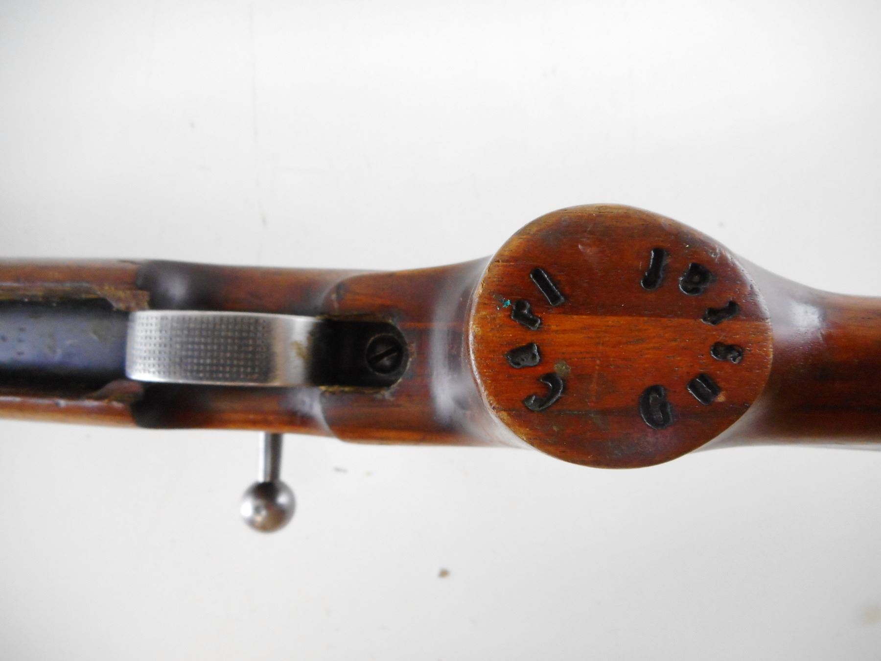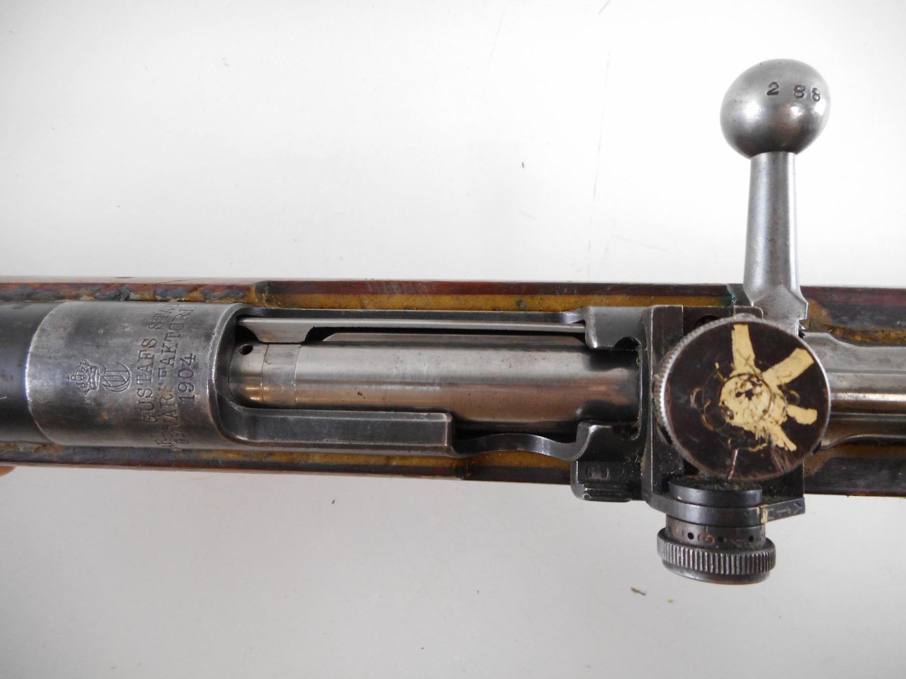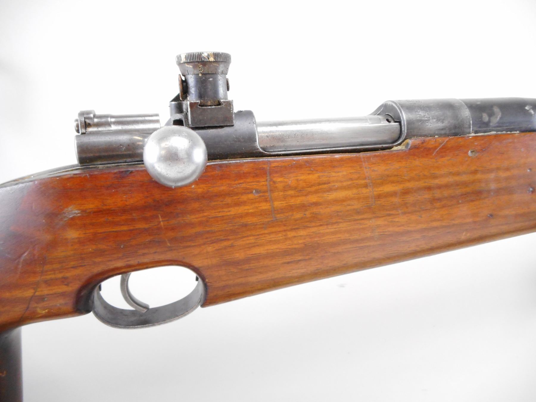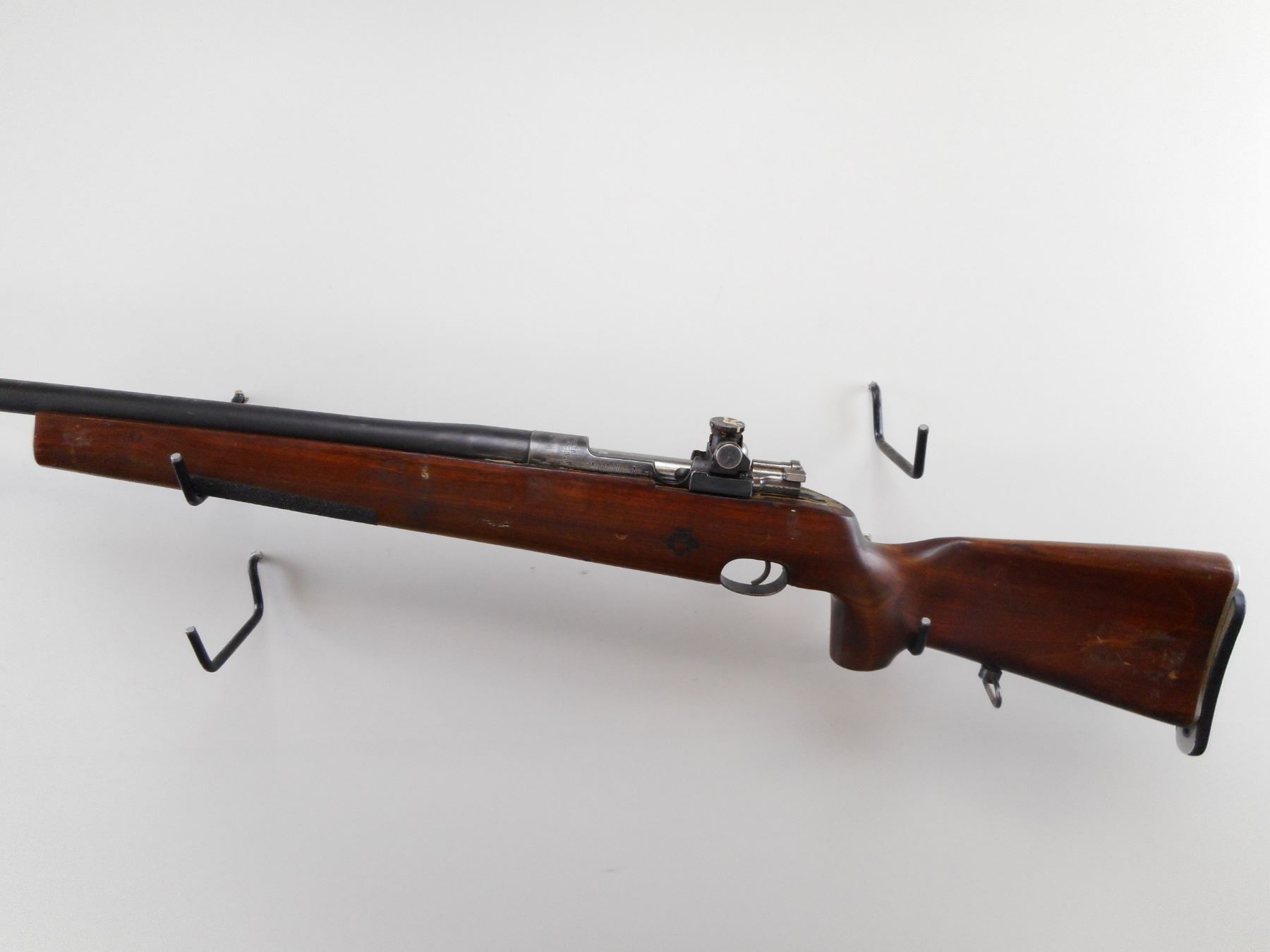 SWEDISH MAUSER , MODEL: CG80 , CALIBER: 6.5 X 55 SWEDISH MAUSER , MADE BY CARL GUSTAF 1904. BORE IS VERY GOOD. HEAVY BULL BARREL. GLOBE FRONT SIGHT. ADJUSTABEL REAR PEEP SIGHT. ***RIGHT HAND STRAIGHT BOLT HANDLE. ONE PIECE LEFT HAND STOCK.*** TEXTURED TAPE ON FOREARM. ALUMINUM HAND RAIL. PALM SWELL. ADJUSTABLE BLACK RUBBER BUTT PLATE. REAR SLING SWIVEL. STEEL FLOOR PLATE AND TRIGGER GUARD. METAL FINISH SHOWS SCRATCHES AND HANDLING MARKS. STOCK SHOWS SCRATCHES HANDLING MARKS AND DINGS. , SERIAL # 33587 , ACTION: BOLT ACTION RIFLE , BARREL LENGTH: 29" , CONDITION: 6/10 , CLASS: CANADIAN NON RESTRICTED CLASS