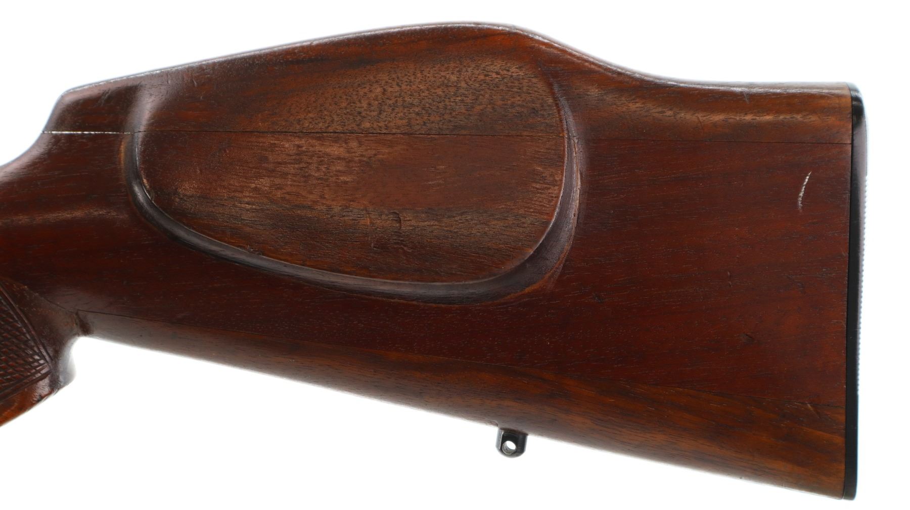Main Description: Manufactured by Husqvarna 1913, serial numbered to match. Blade front sight with ramp, adjustable target rear sight, blued finish, receiver drilled and tapped with plug screws installed, rear receiver bridge and bolt handle have been modified. One piece custom wood stock with added portions which show some gaps between the parts, finger grooved forearm, checkered pistol grip, European cheek rest, grooved black polymer butt plate, swivel studs.
