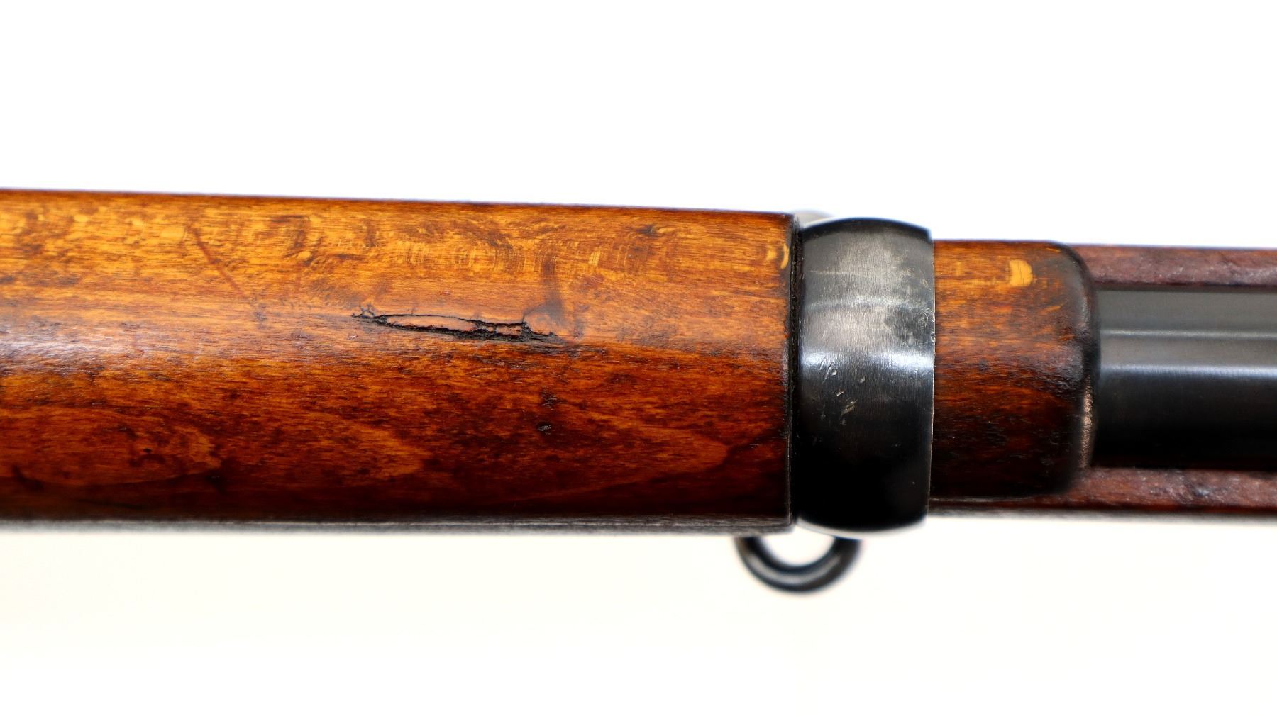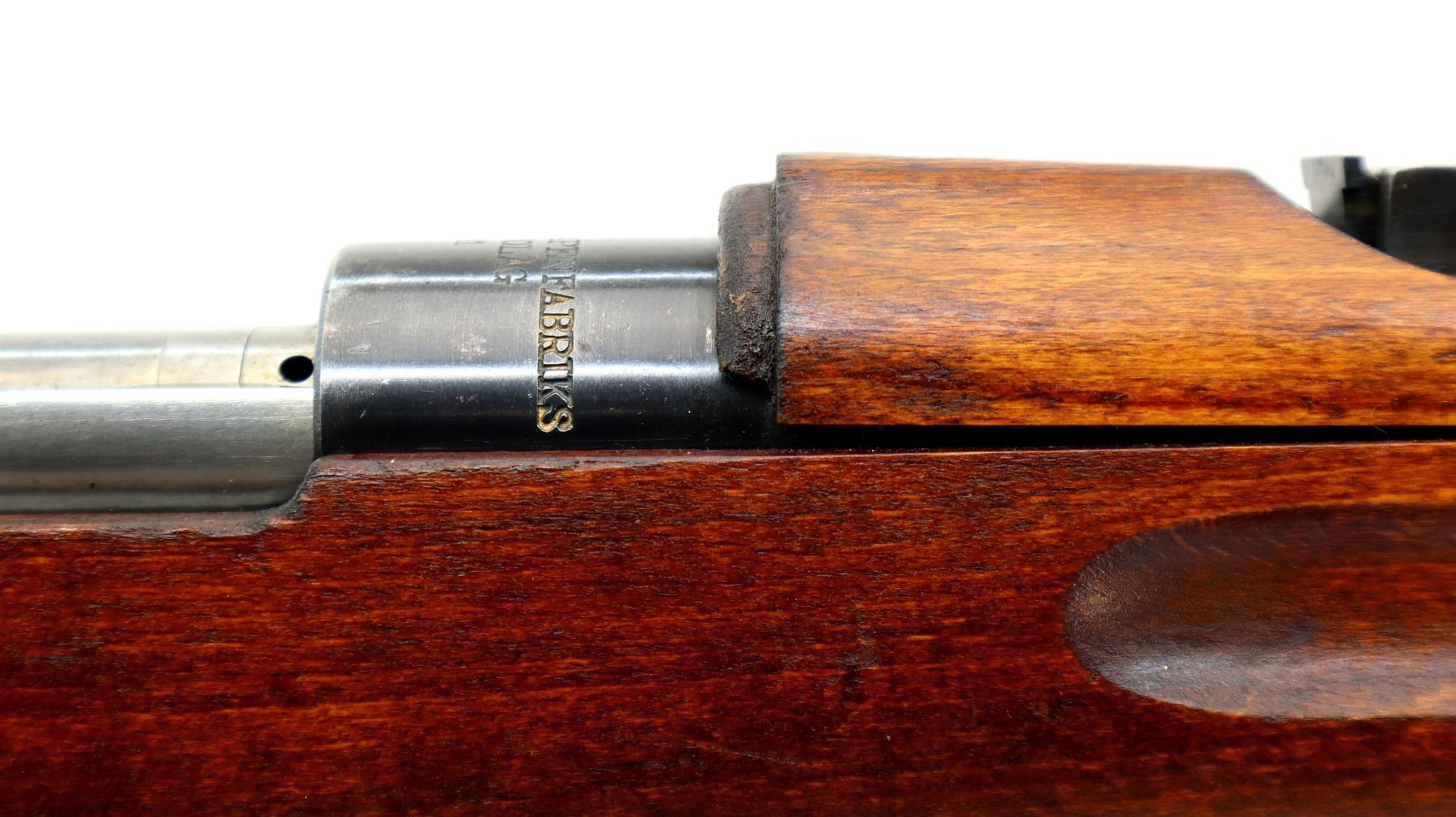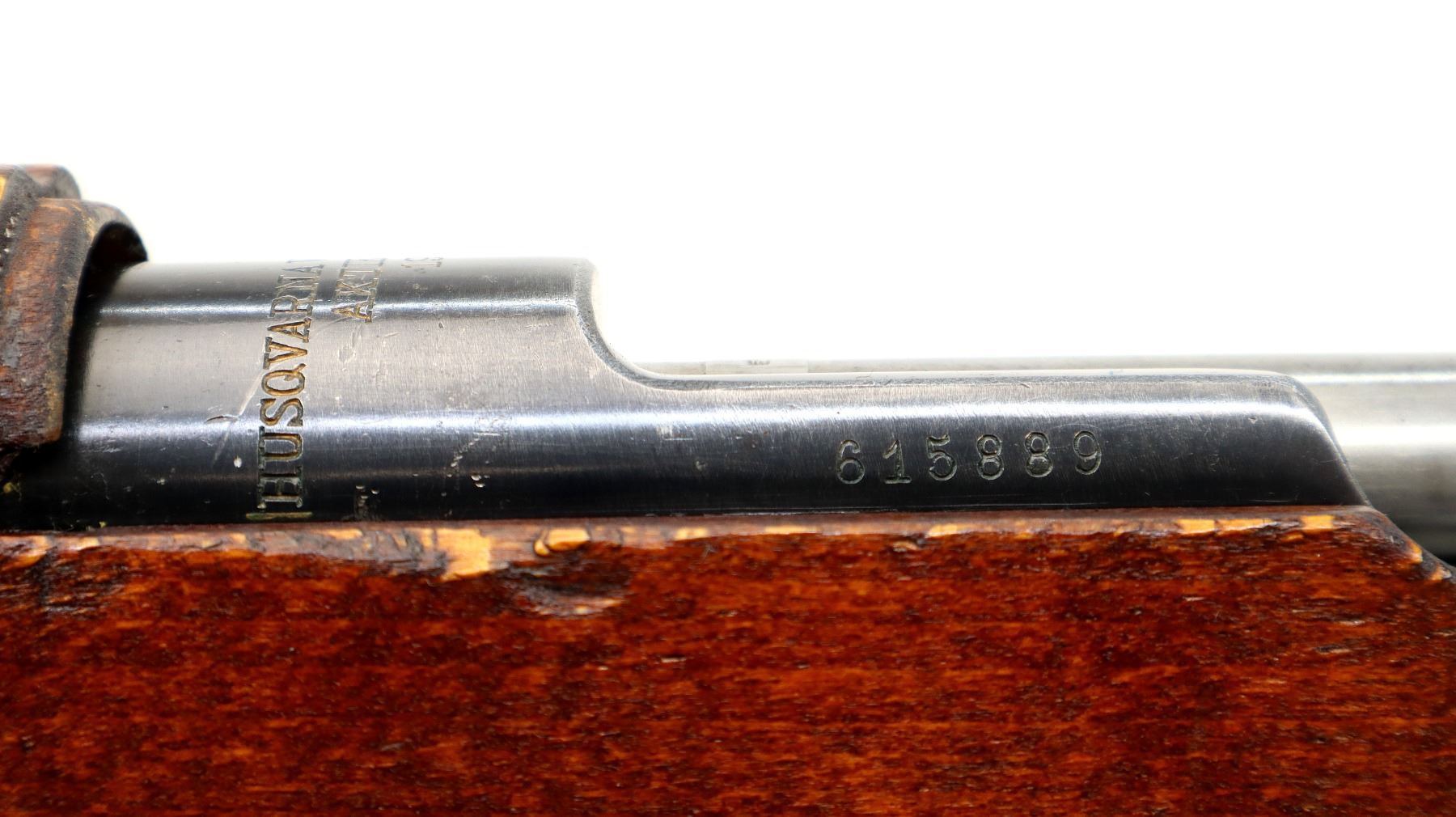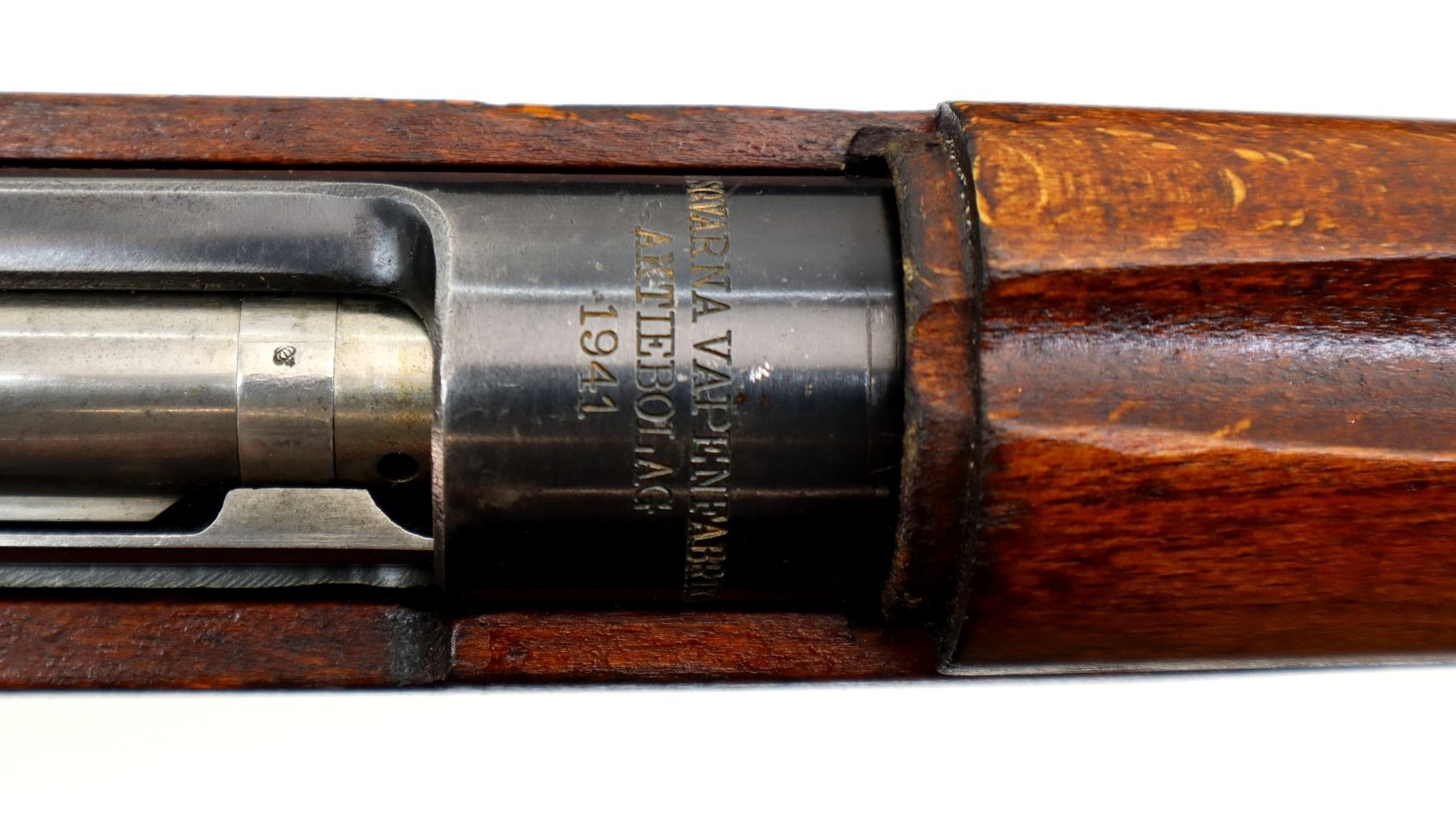 Main Description: Manufactured by Husqvarna 1941, arsenal rebuilt numbered to match. Blade front sight with ramp, adjustable u notched rear sight, blued finish, missing rear handguard ring, has a silver bolt with turned down handle. Two piece full military wood stocks, finger grooved forearm, straight grip, smooth steel butt plate, brass stock disk, sling swivels, cleaning rod, bayonet lug.