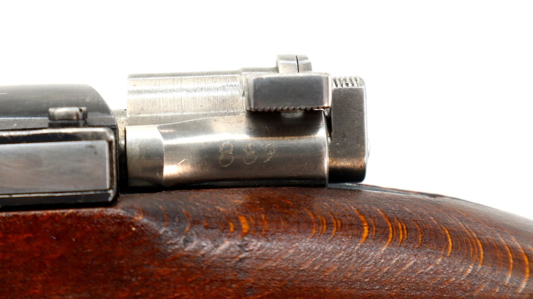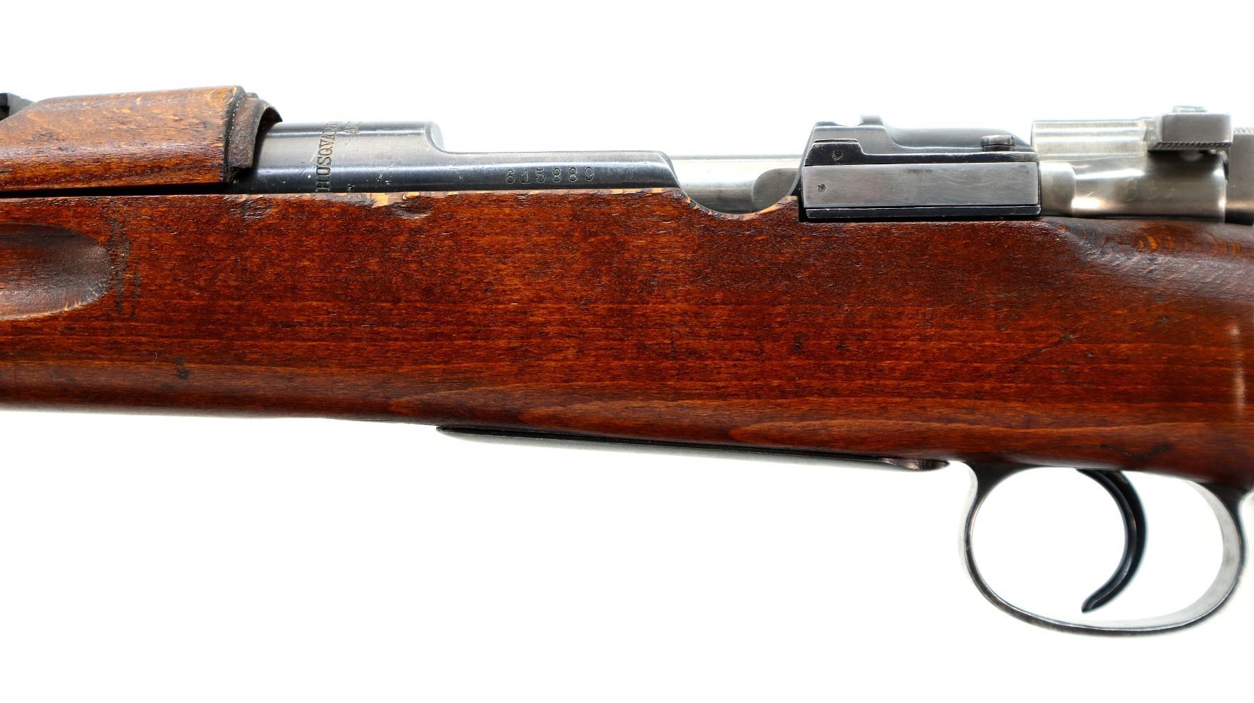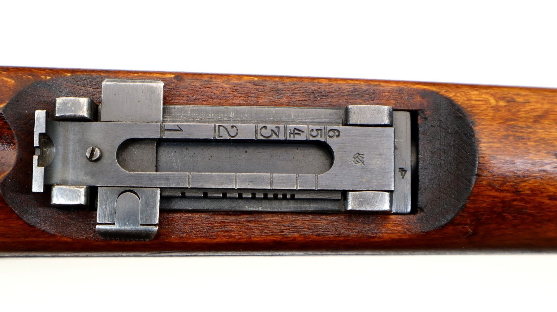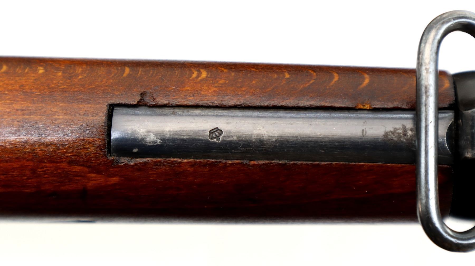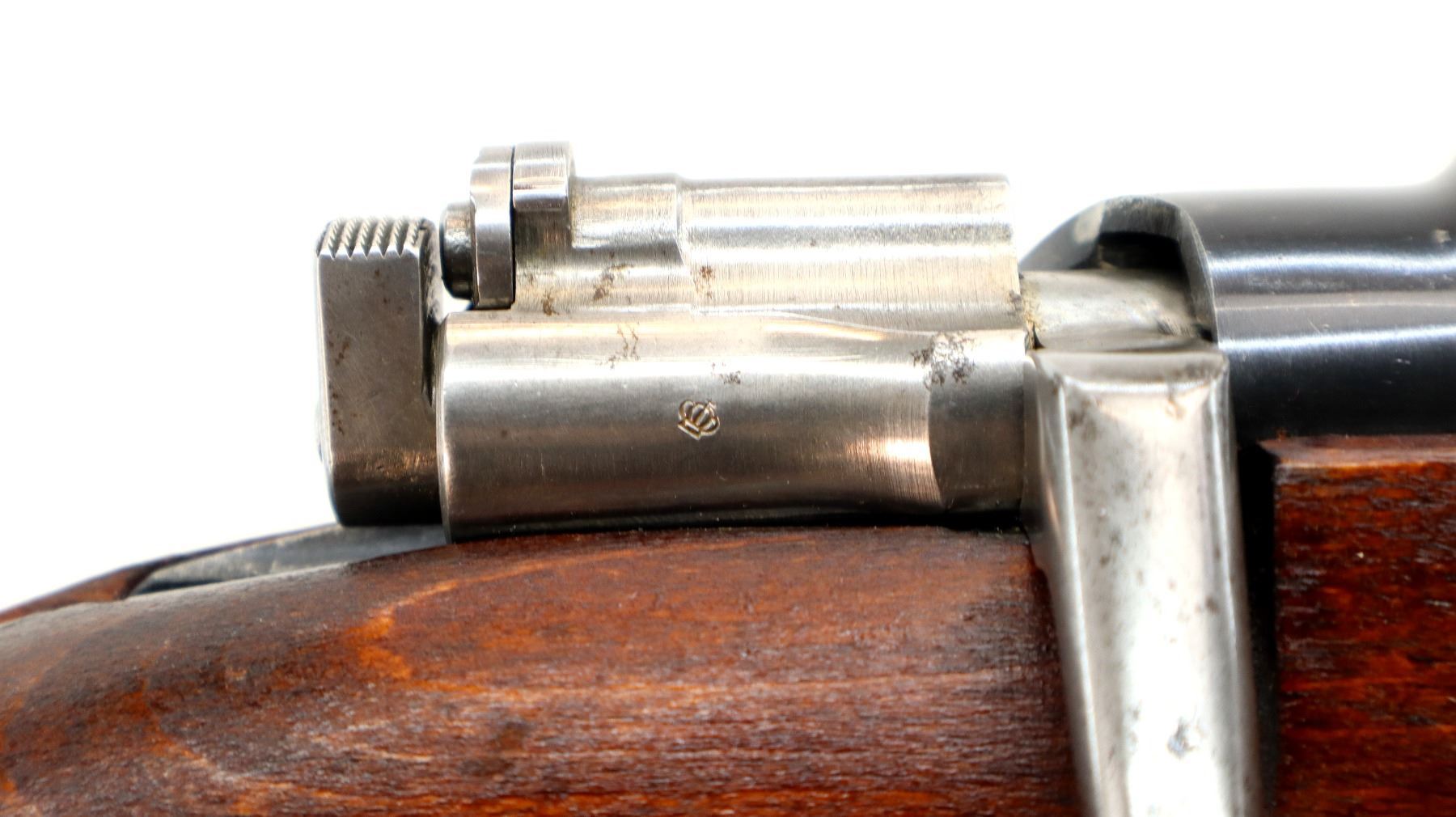 Main Description: Manufactured by Husqvarna 1941, arsenal rebuilt numbered to match. Blade front sight with ramp, adjustable u notched rear sight, blued finish, missing rear handguard ring, has a silver bolt with turned down handle. Two piece full military wood stocks, finger grooved forearm, straight grip, smooth steel butt plate, brass stock disk, sling swivels, cleaning rod, bayonet lug.