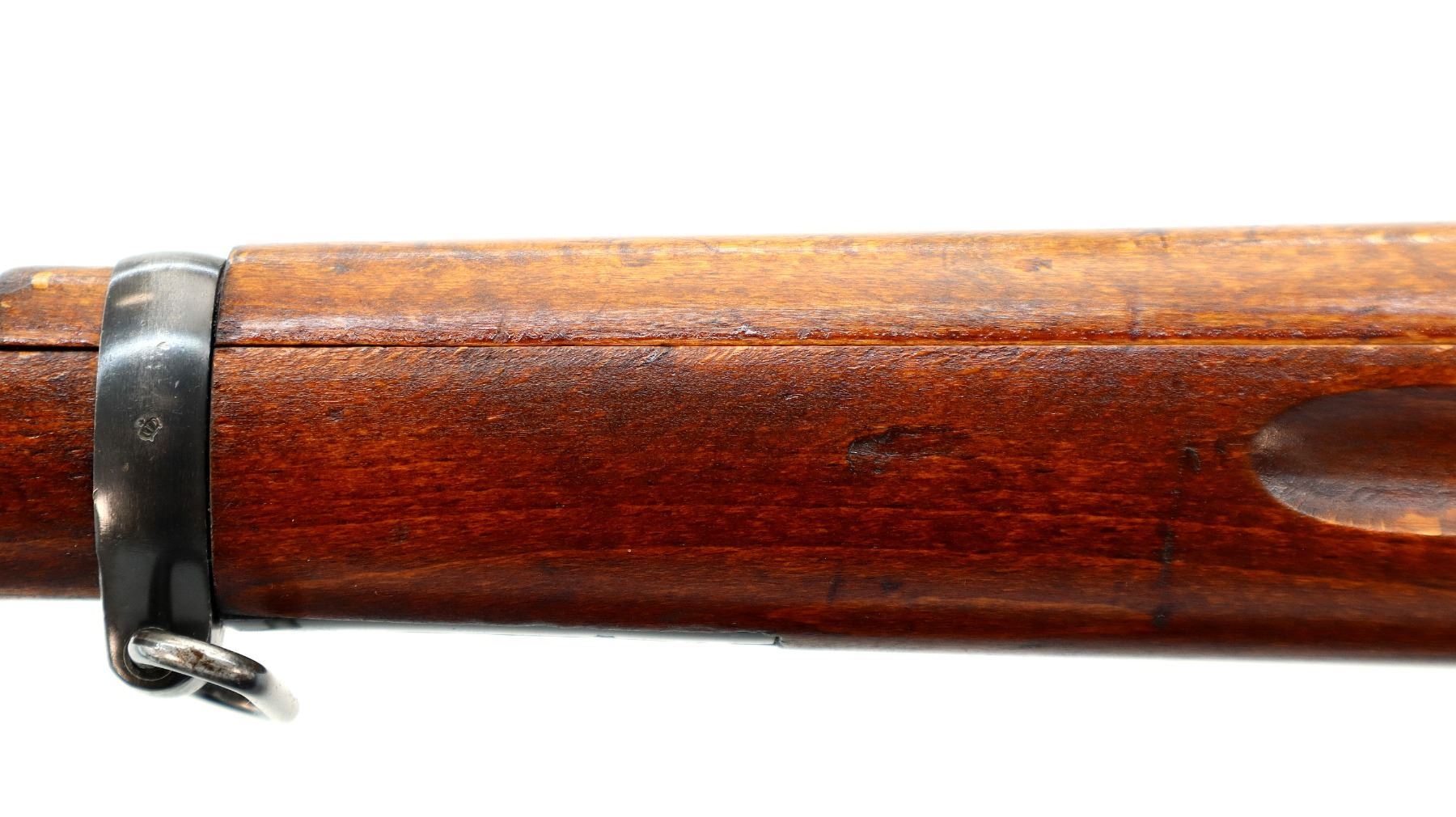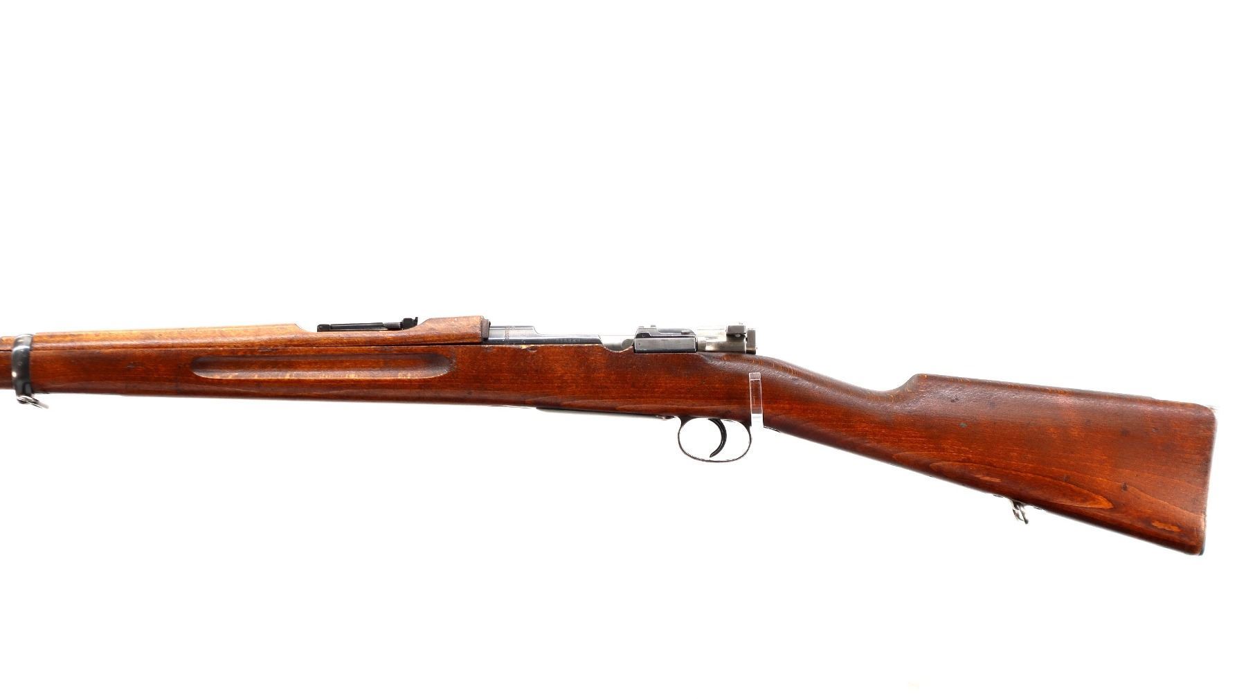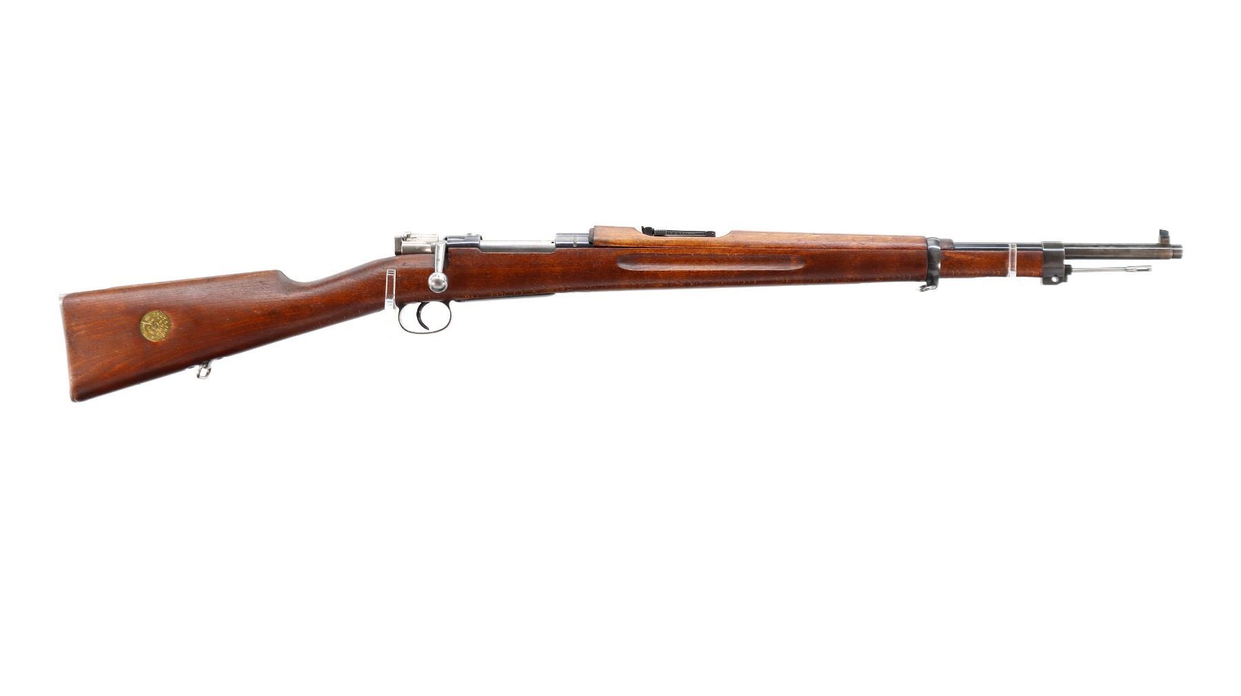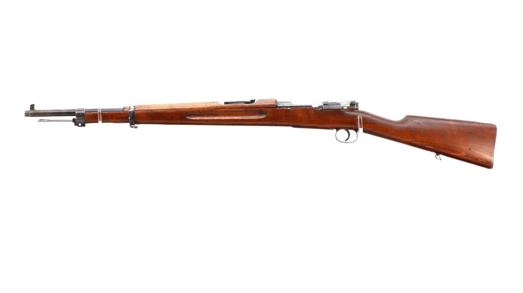 Main Description: Manufactured by Husqvarna 1941, arsenal rebuilt numbered to match. Blade front sight with ramp, adjustable u notched rear sight, blued finish, missing rear handguard ring, has a silver bolt with turned down handle. Two piece full military wood stocks, finger grooved forearm, straight grip, smooth steel butt plate, brass stock disk, sling swivels, cleaning rod, bayonet lug.