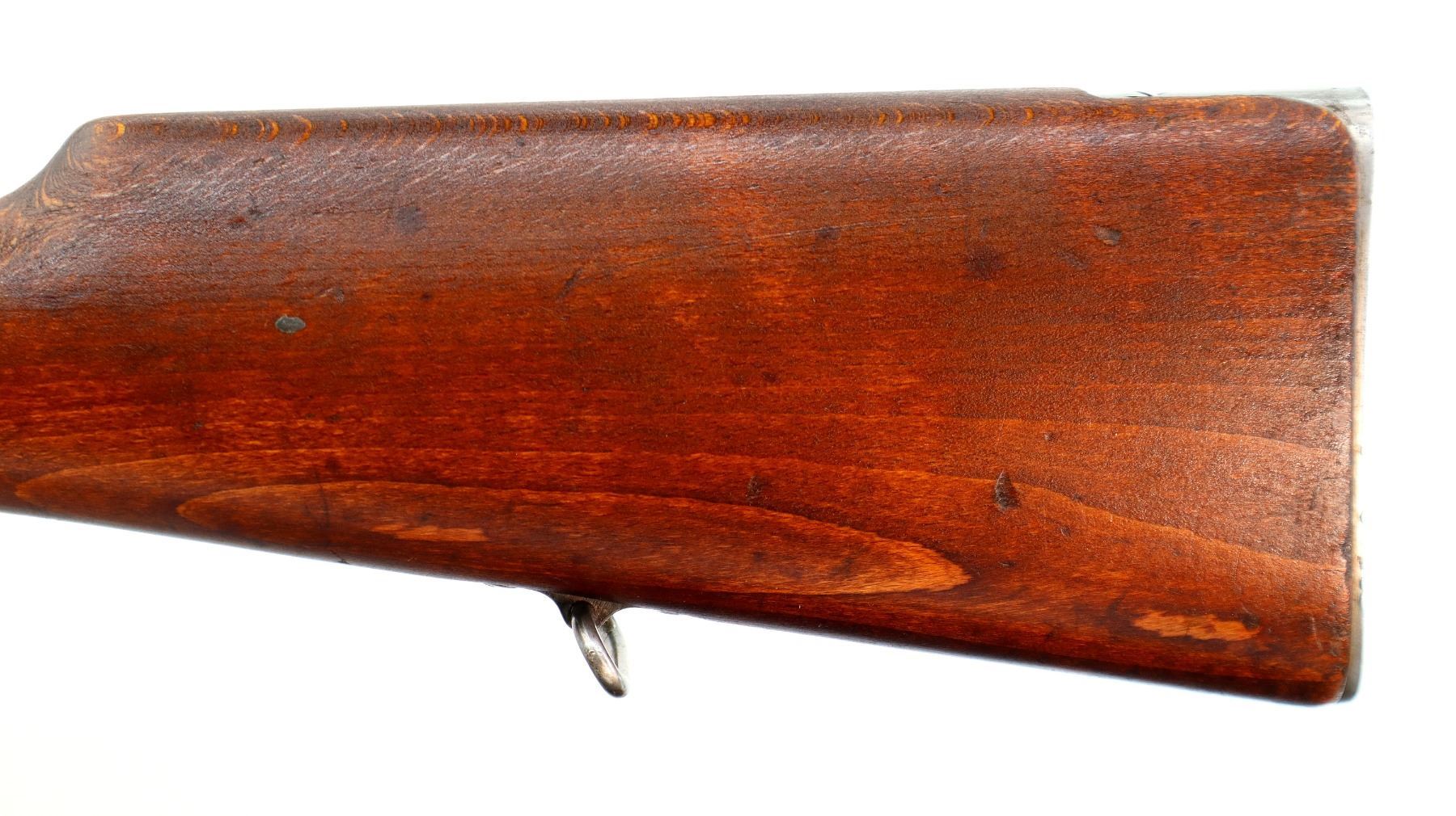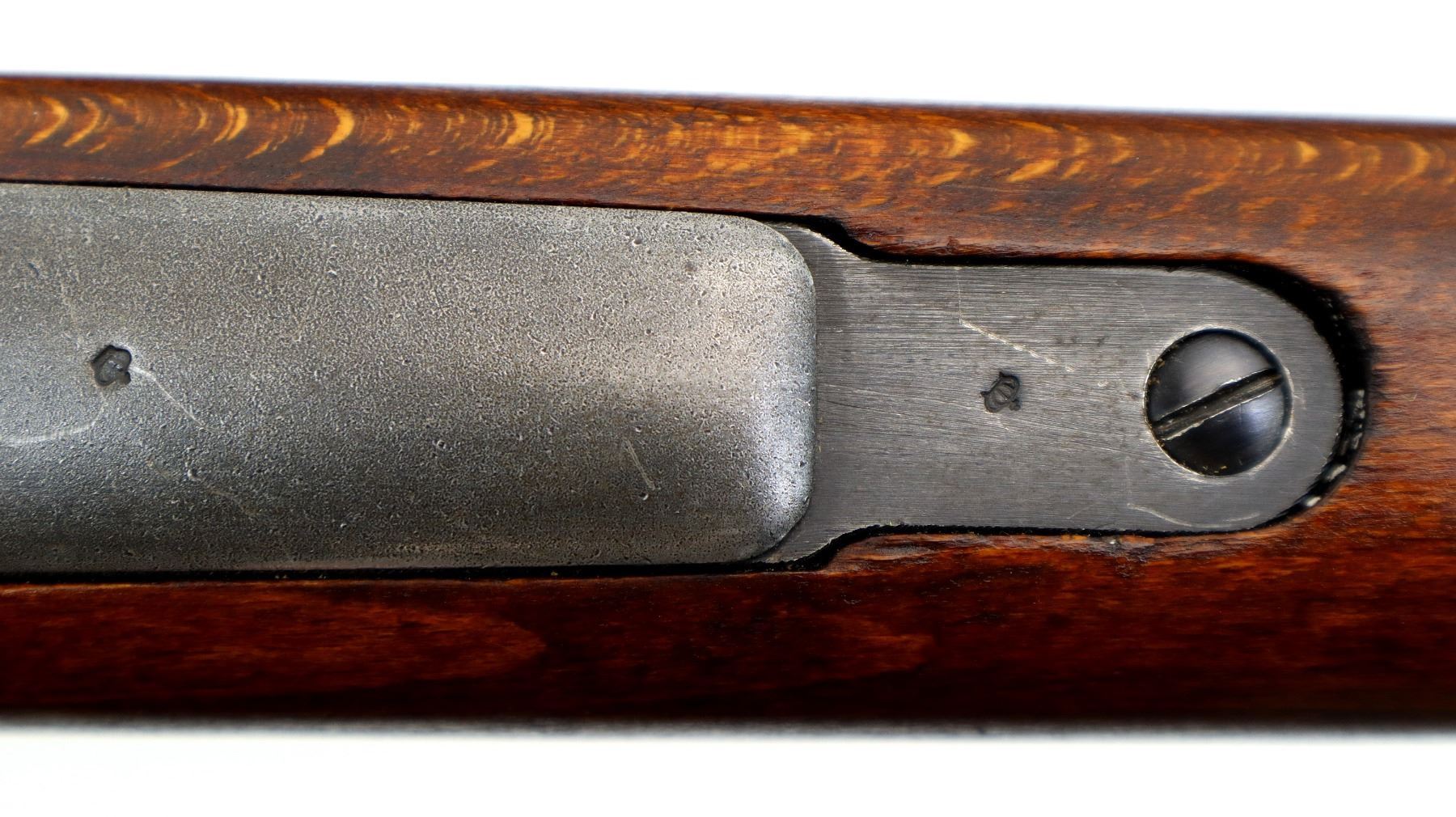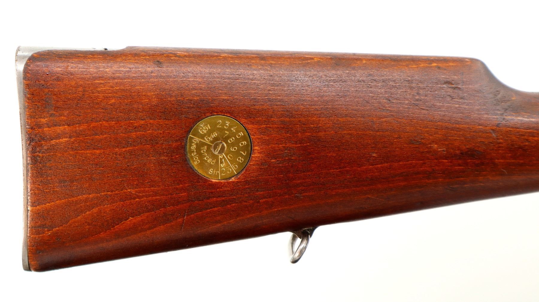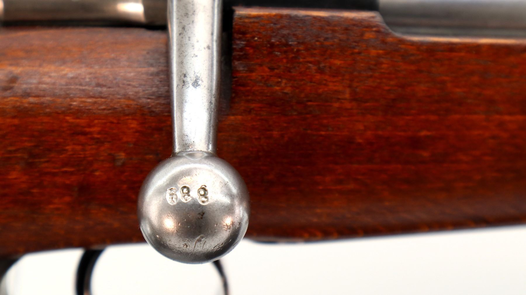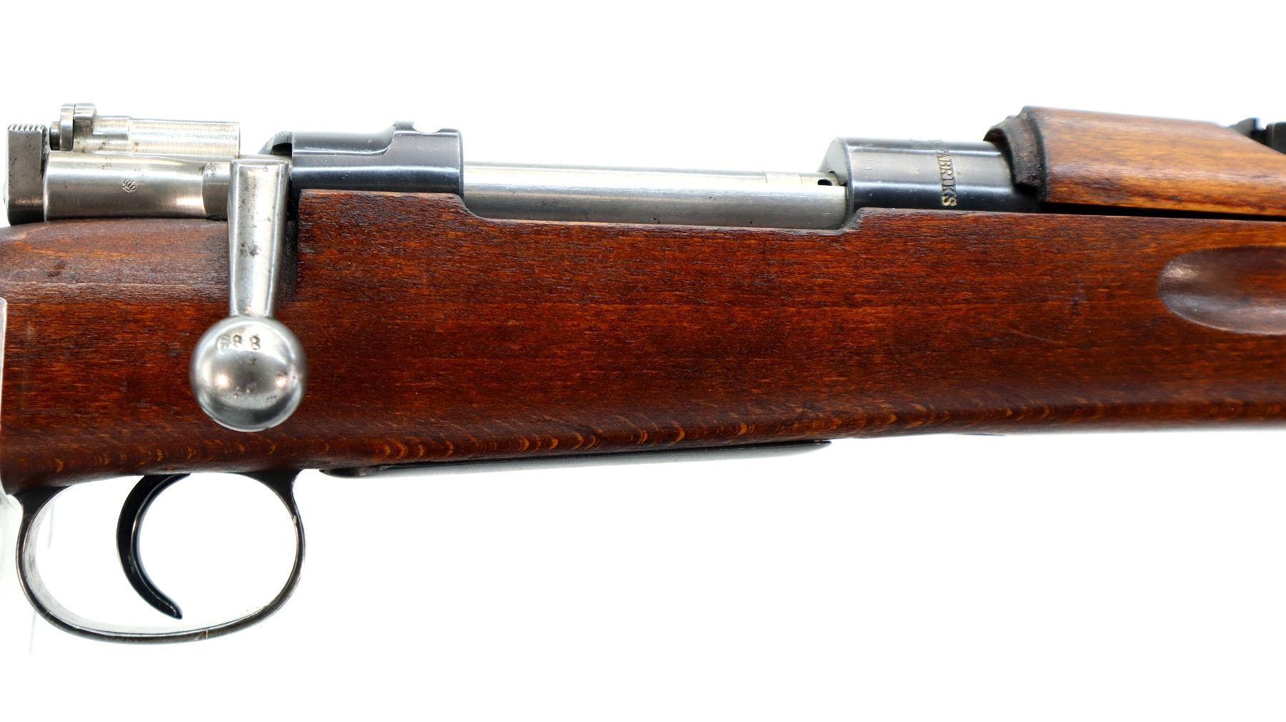Main Description: Manufactured by Husqvarna 1941, arsenal rebuilt numbered to match. Blade front sight with ramp, adjustable u notched rear sight, blued finish, missing rear handguard ring, has a silver bolt with turned down handle. Two piece full military wood stocks, finger grooved forearm, straight grip, smooth steel butt plate, brass stock disk, sling swivels, cleaning rod, bayonet lug.