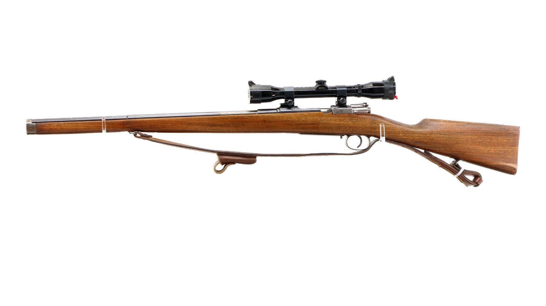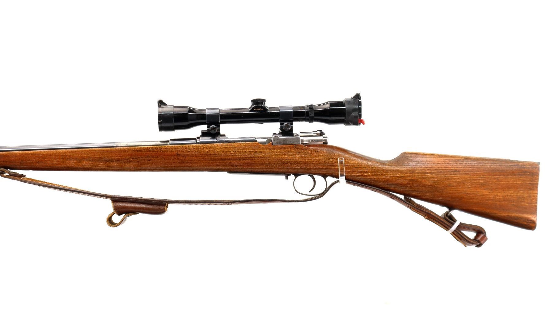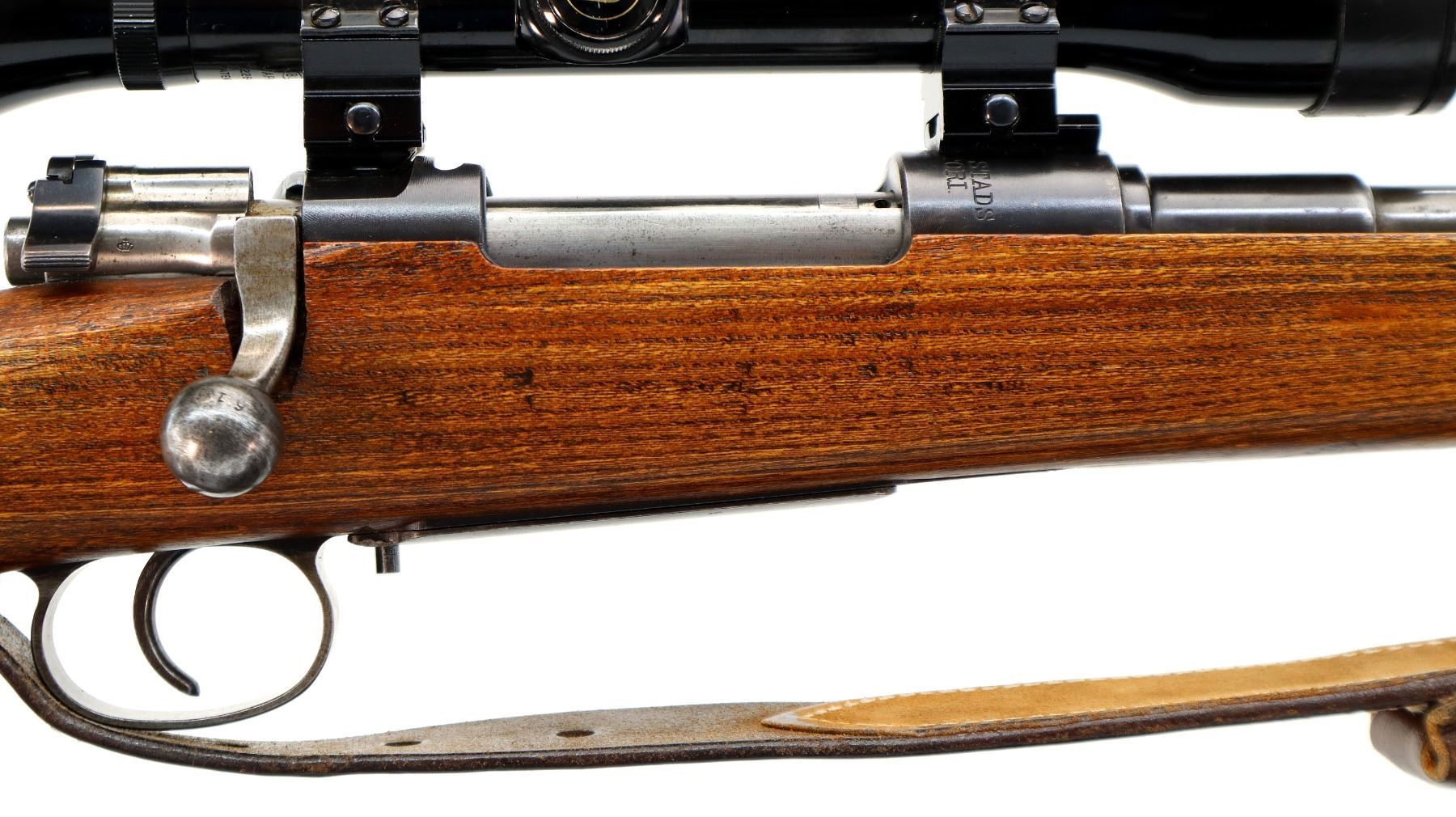 Main Description: Manufactured by Carl Gustafs 1916, visible numbers match. Missing front and rear sights, blued finish, receiver drilled and tapped with Bushnell Scopechief VI scope installed, clear optics with duplex crosshair. Modified low scope bolt handle and safety. One piece sporterized wood stock, straight grip, smooth steel butt plate, missing stock disk, sling swivels with brown leather sling, small crack near front swivel, steel nose cap.