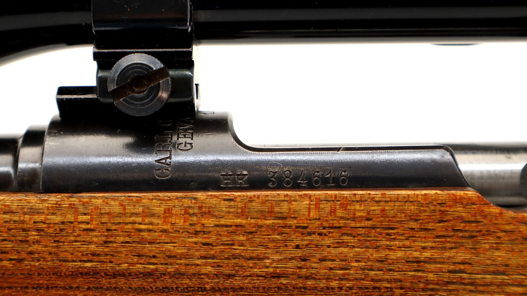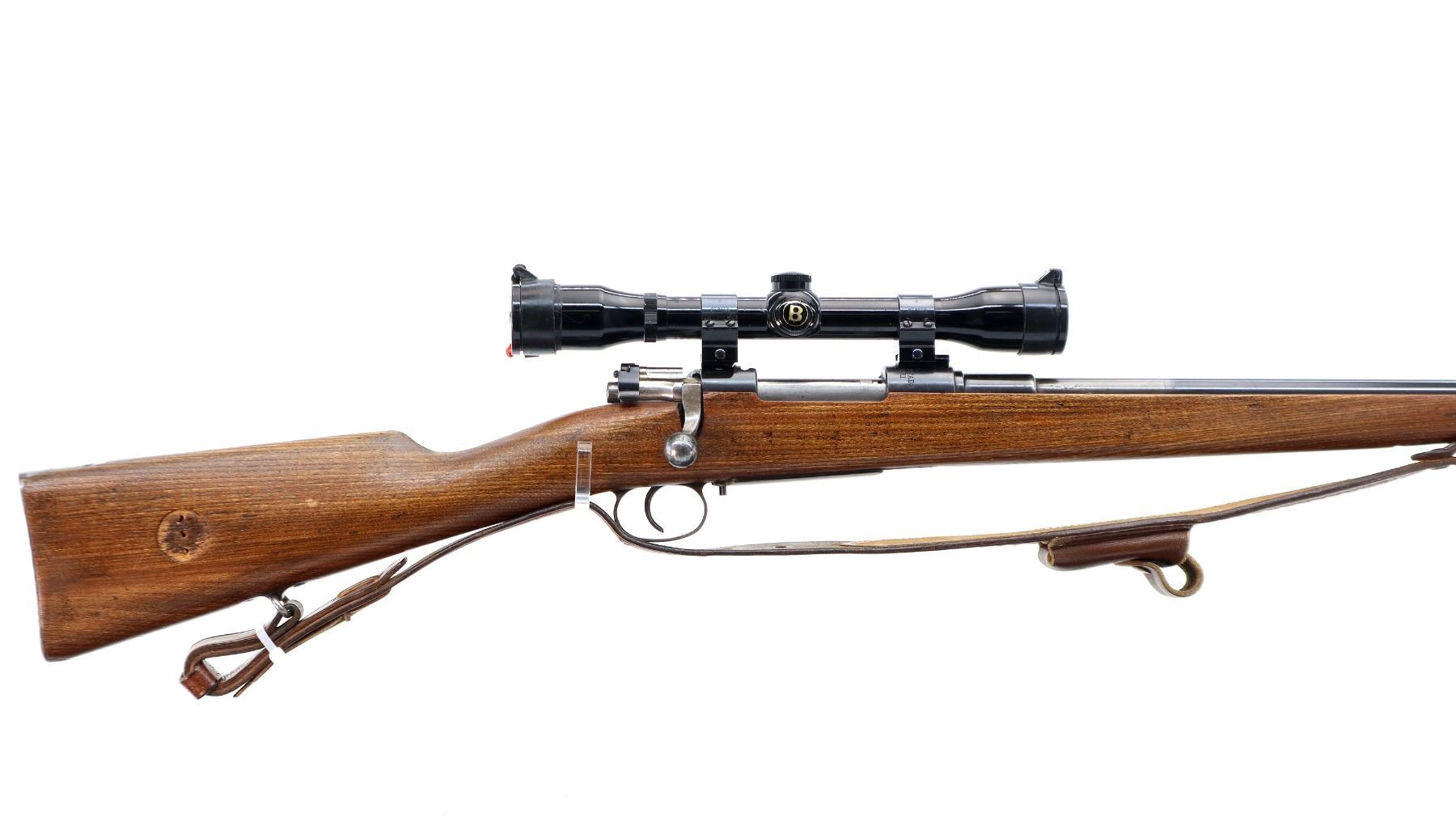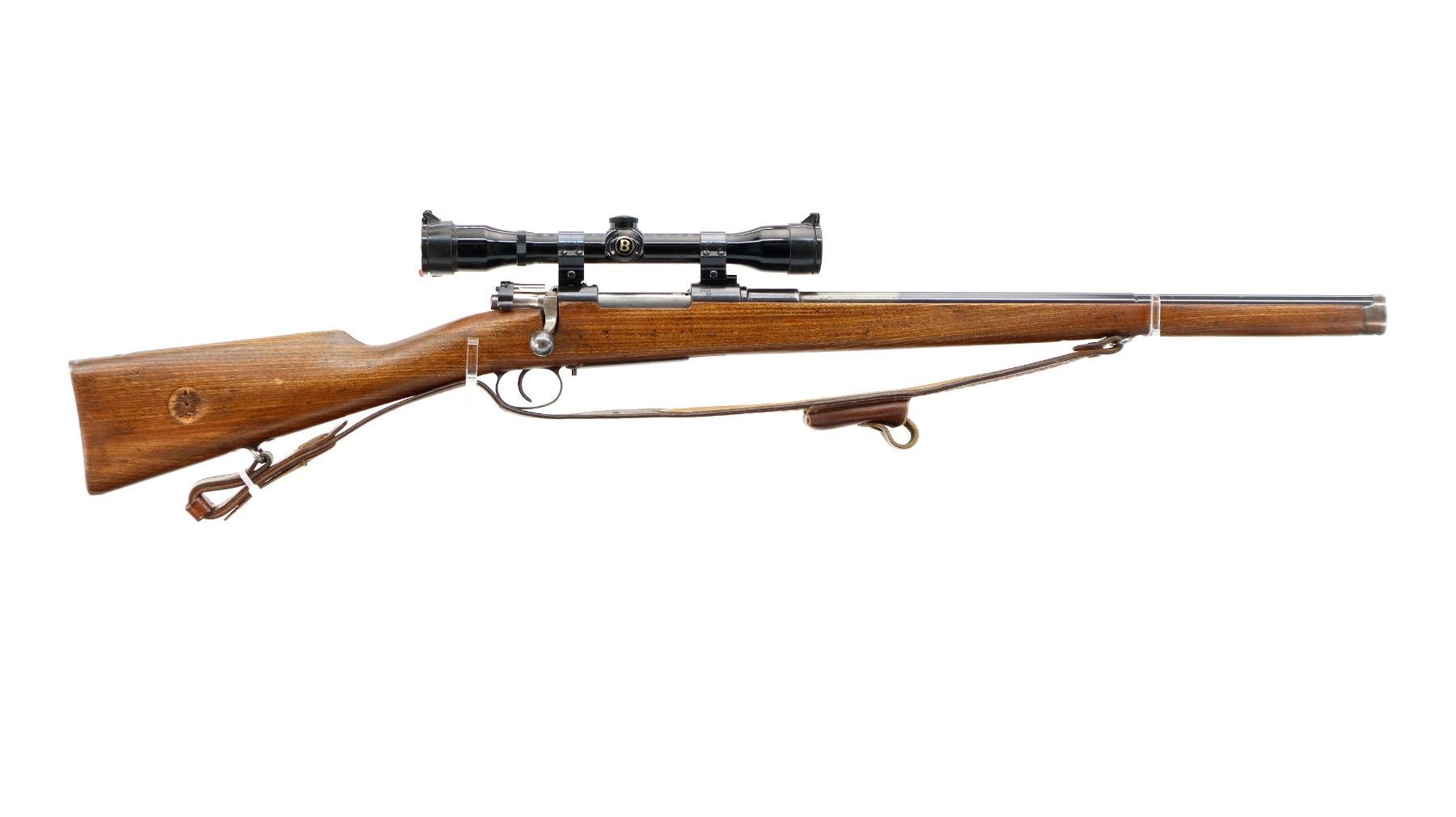 Main Description: Manufactured by Carl Gustafs 1916, visible numbers match. Missing front and rear sights, blued finish, receiver drilled and tapped with Bushnell Scopechief VI scope installed, clear optics with duplex crosshair. Modified low scope bolt handle and safety. One piece sporterized wood stock, straight grip, smooth steel butt plate, missing stock disk, sling swivels with brown leather sling, small crack near front swivel, steel nose cap.