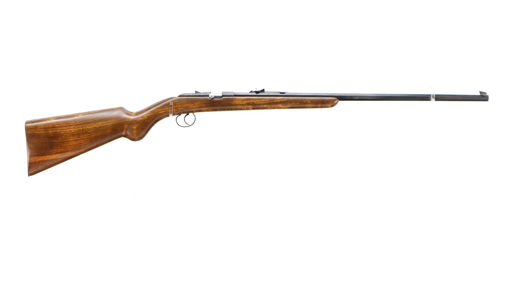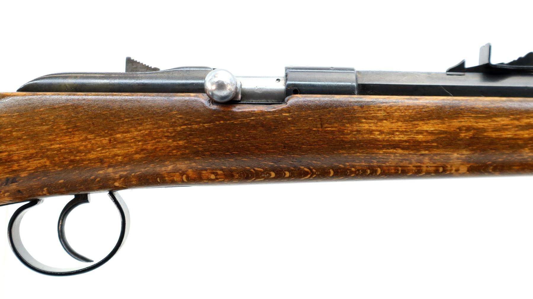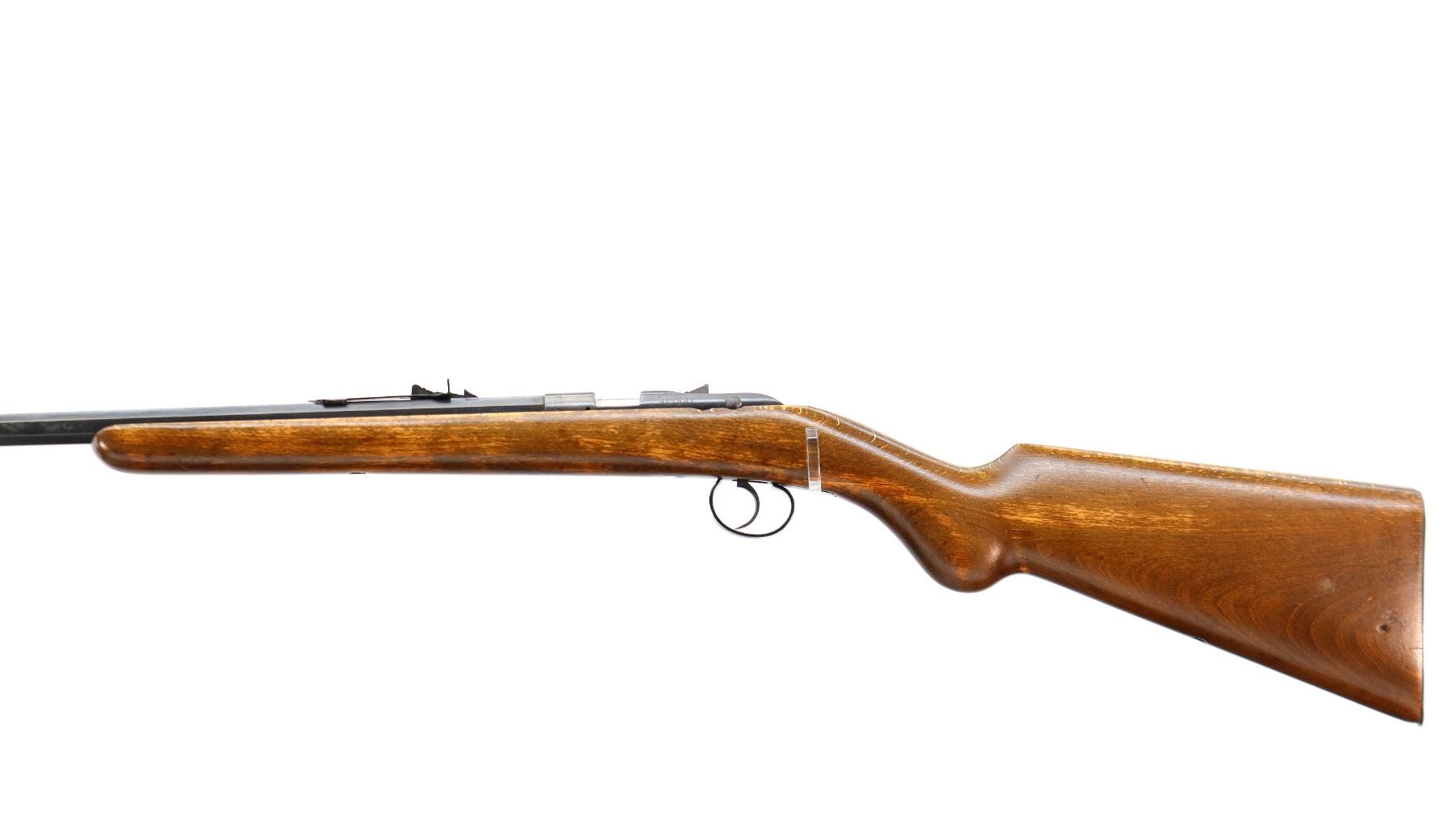 Main Description: Blade front sight, adjustable u notched rear sight, blued finish, octagon barrel, straight bolt handle. One piece wood stock, pistol grip, smooth steel butt plate, missing rear swivel hole is present. Has no front swivel.