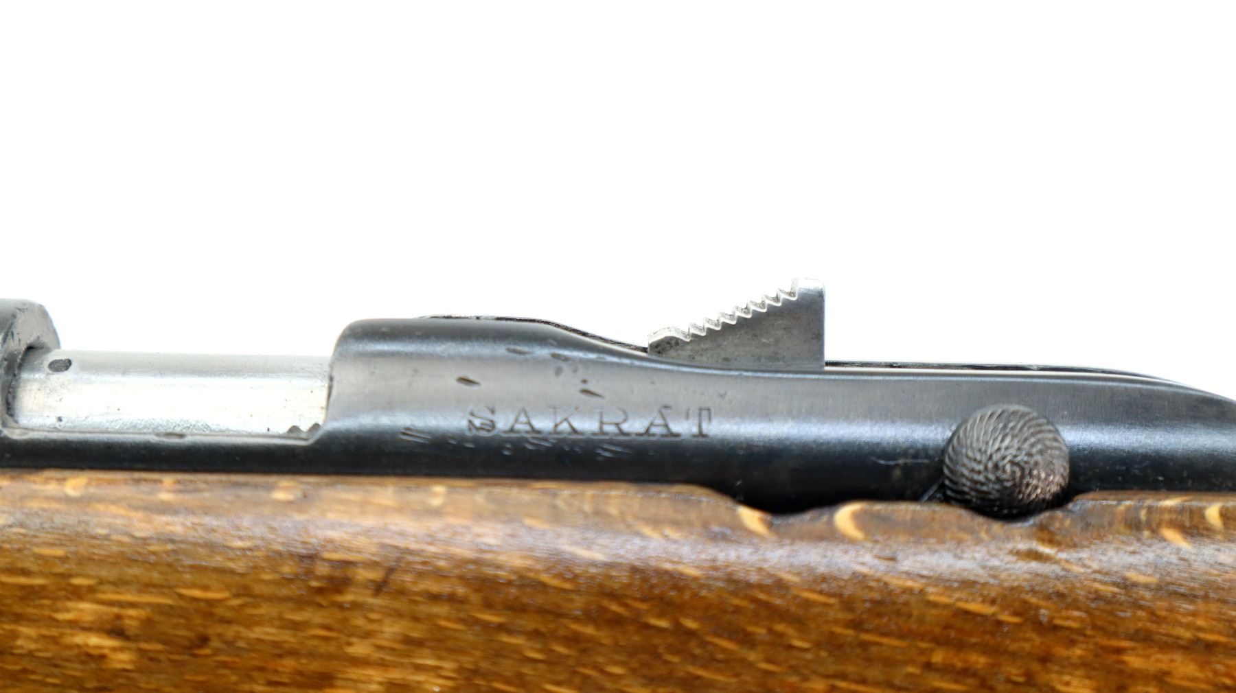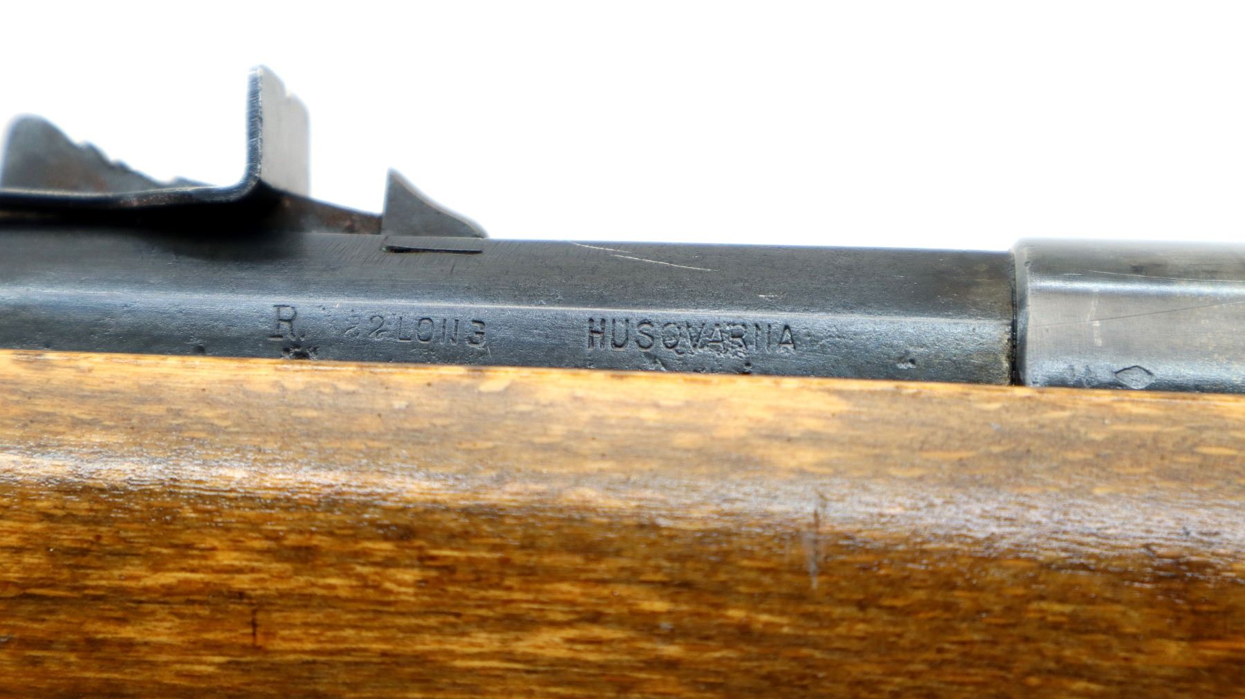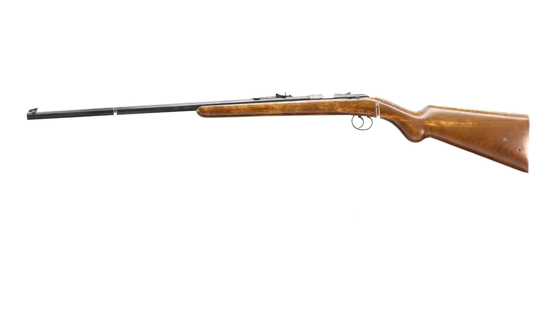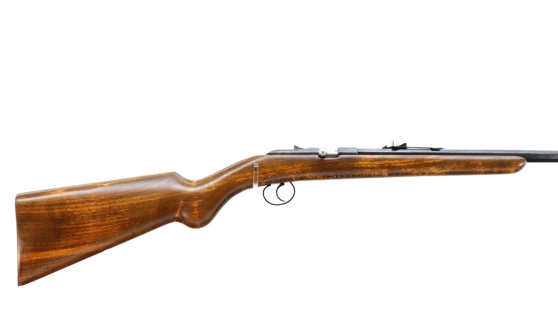 Main Description: Blade front sight, adjustable u notched rear sight, blued finish, octagon barrel, straight bolt handle. One piece wood stock, pistol grip, smooth steel butt plate, missing rear swivel hole is present. Has no front swivel.