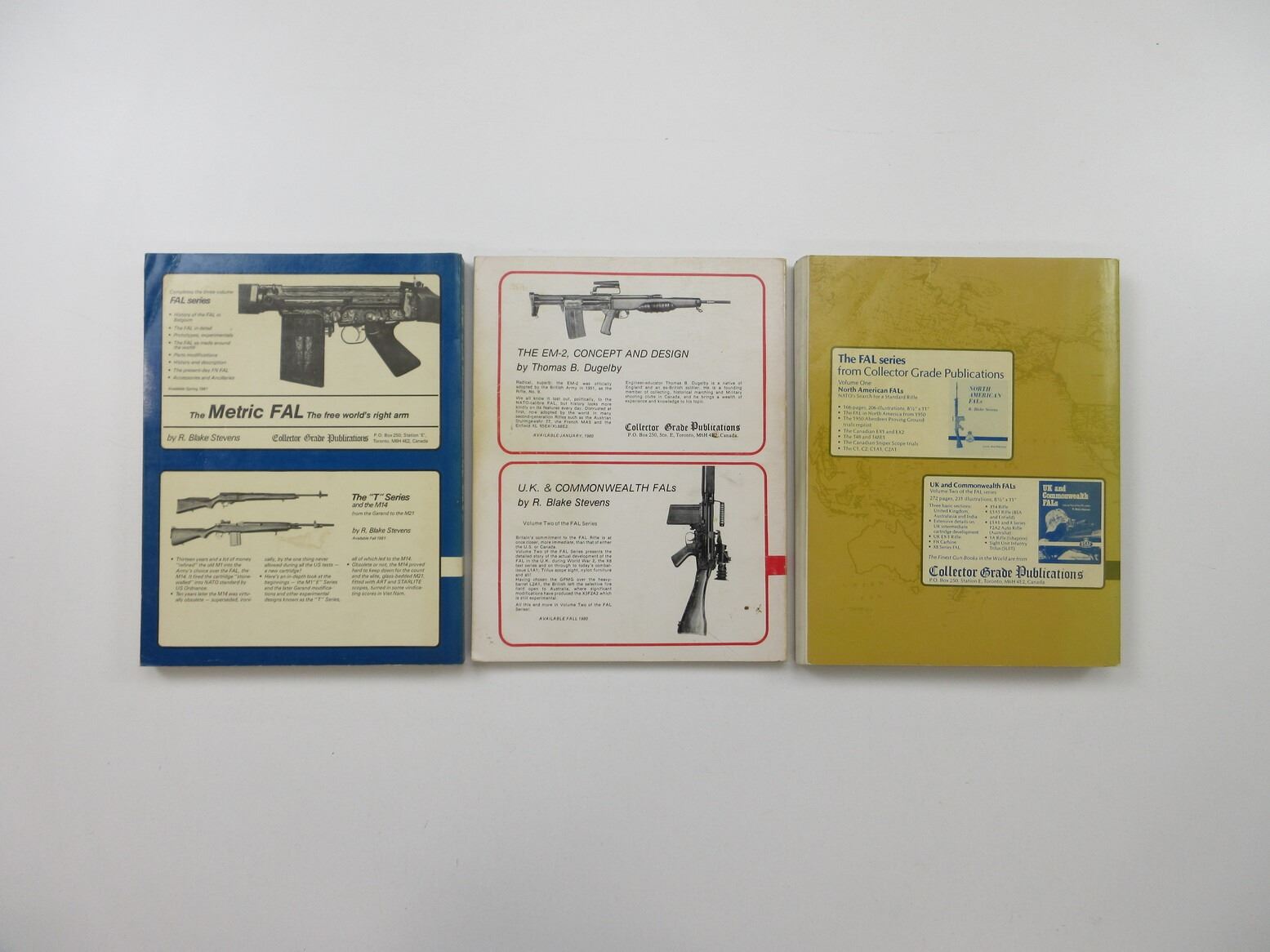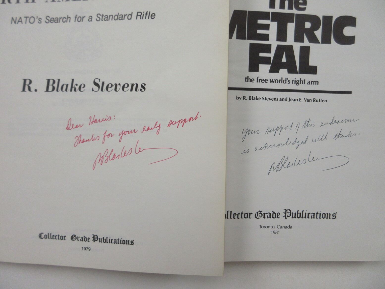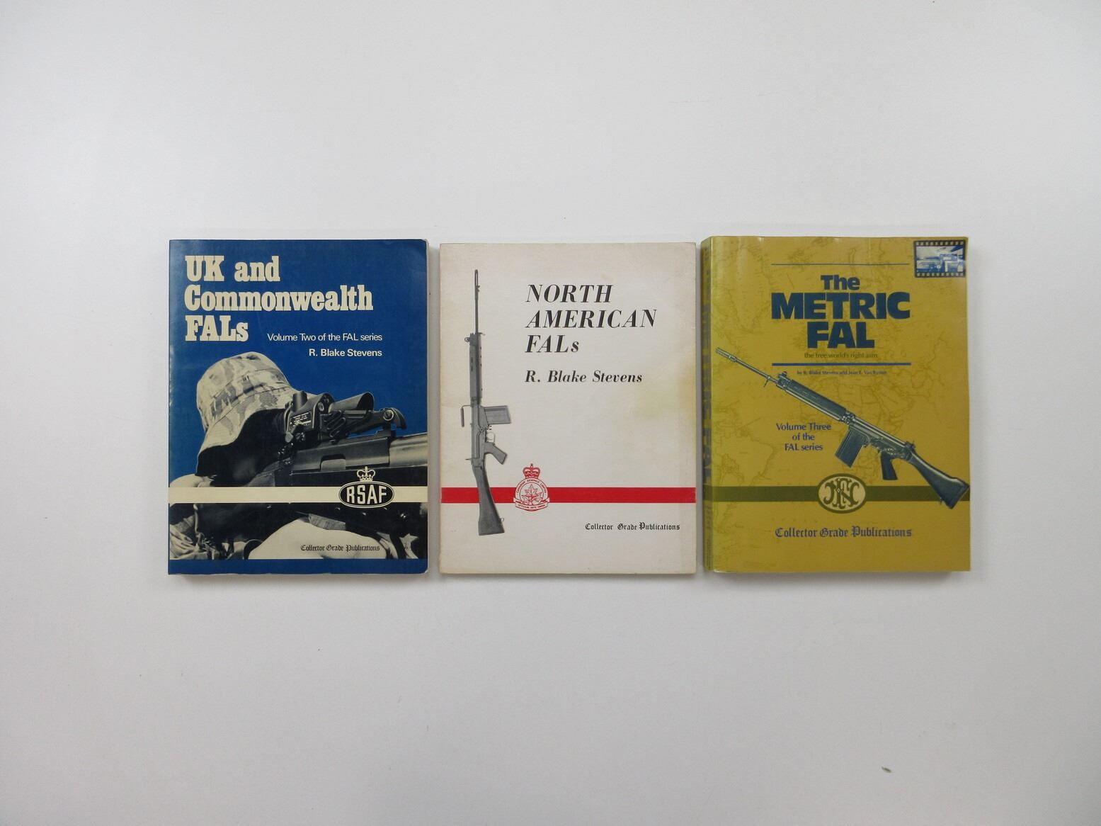 BY R. BLAKE STEVENS, HARD COVERS, LOT INCLUDES; (1) "NORTH AMERICAN FALS, VOLUME ONE", INSCRIBED & SIGNED BY AUTHOR, FIRST EDITION, ISBN: 0-88935-001-9, (1) "UK AND COMMONWEALTH FALS, VOLUME TWO", FIRST EDITION, ISBN: 0-88935-003-5 & (1) "THE METRIC FAL, THE FREE WORLD'S RIGHT ARM, VOLUME THREE", INSCRIBED & SIGNED BY AUTHOR, FIRST EDITION, ISBN: 0-88935-005-1. SEE PHOTOS.
