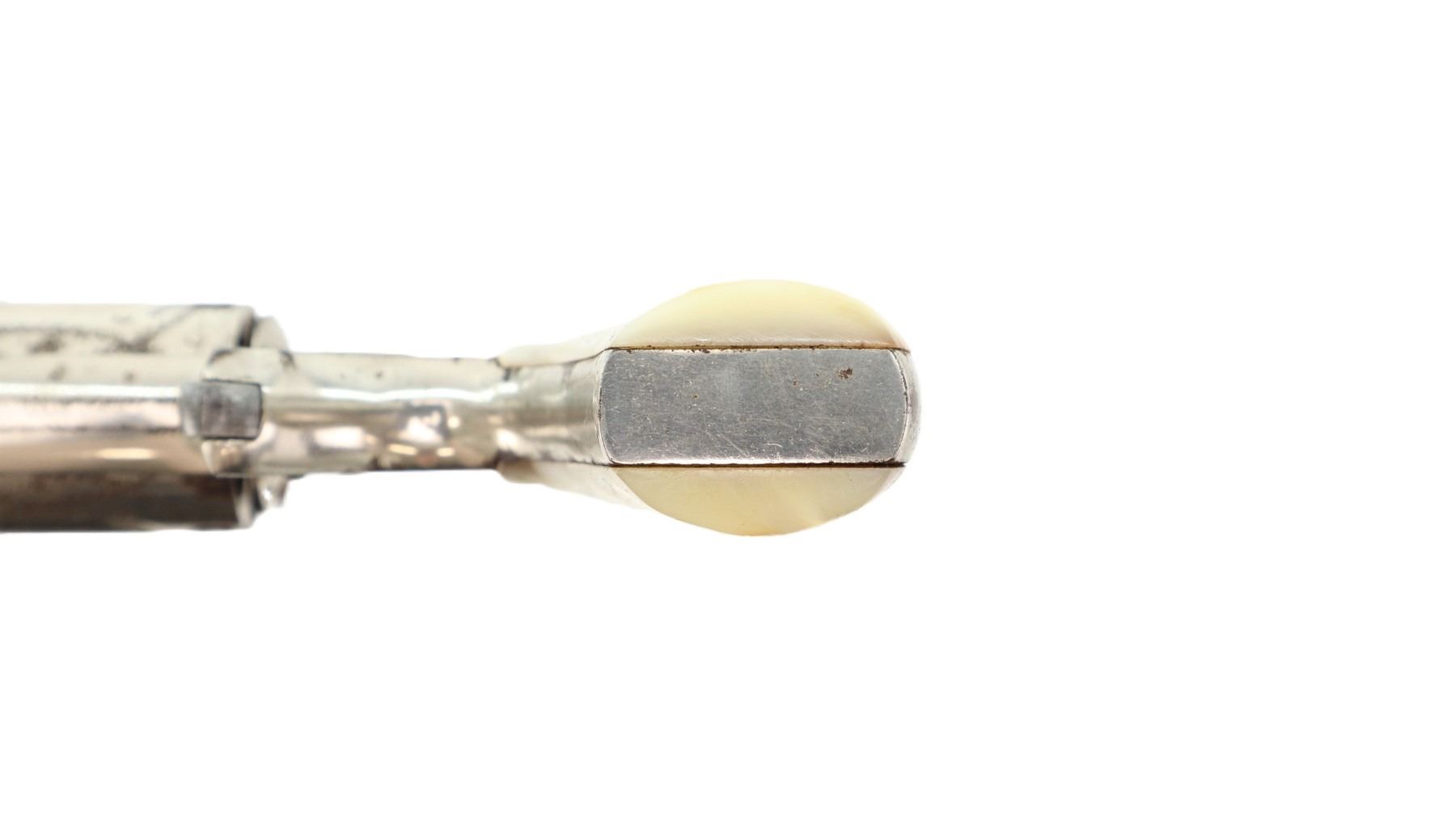 Main Description: Functions mechanically as designed, Holds cock, does not index. Blade front sight, shallow u notched rear sight, nickel finish, engraved barrel frame and cylinder, checkered spur hammer and smooth trigger. Two piece smooth Mother of Pearl grips, checkered cylinder rod.