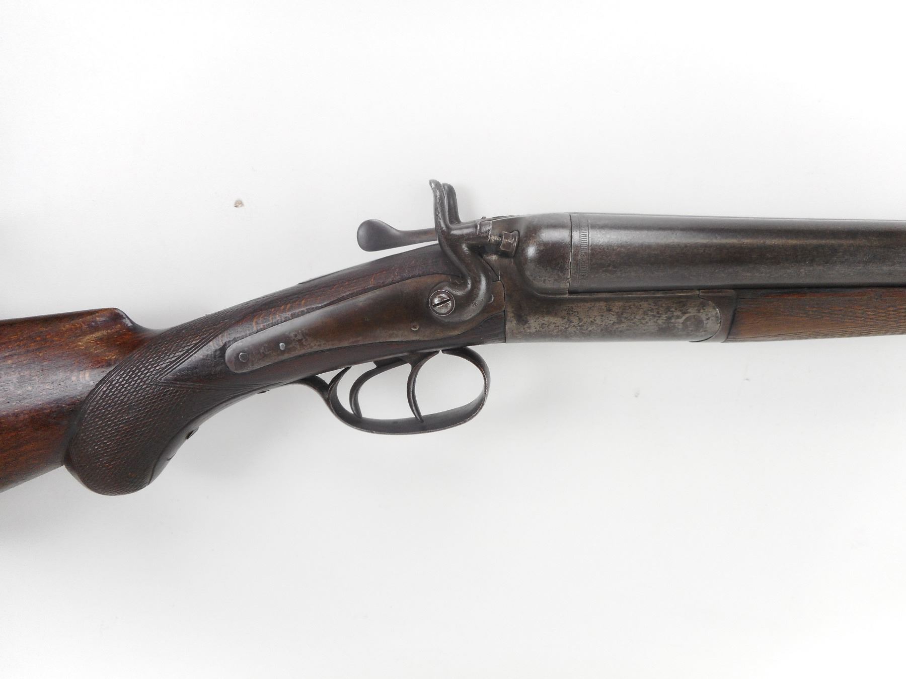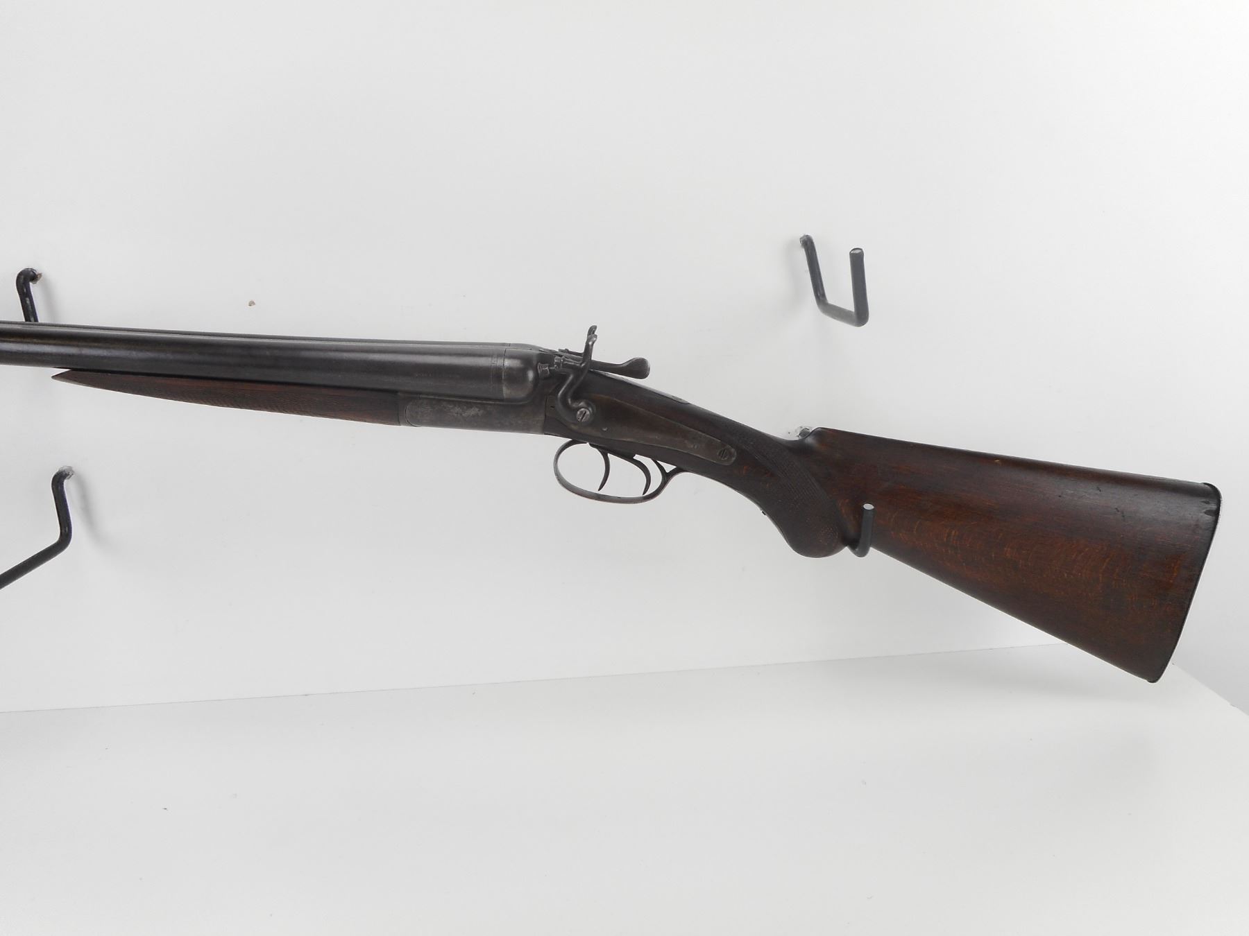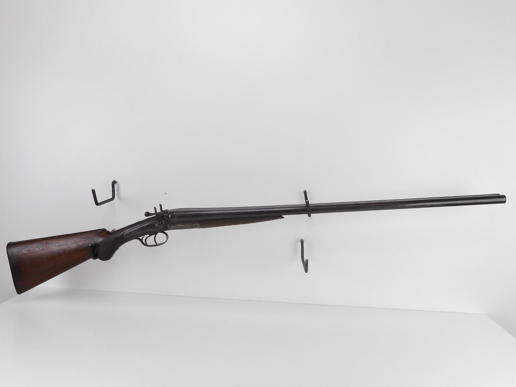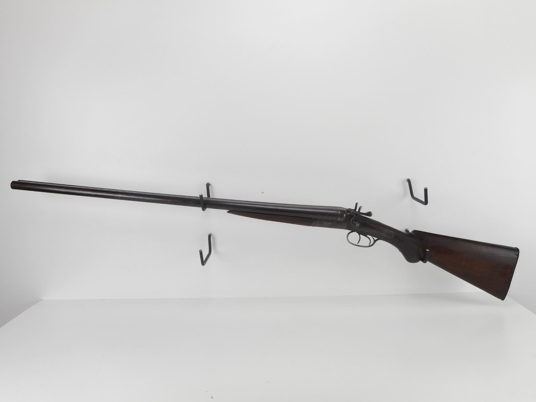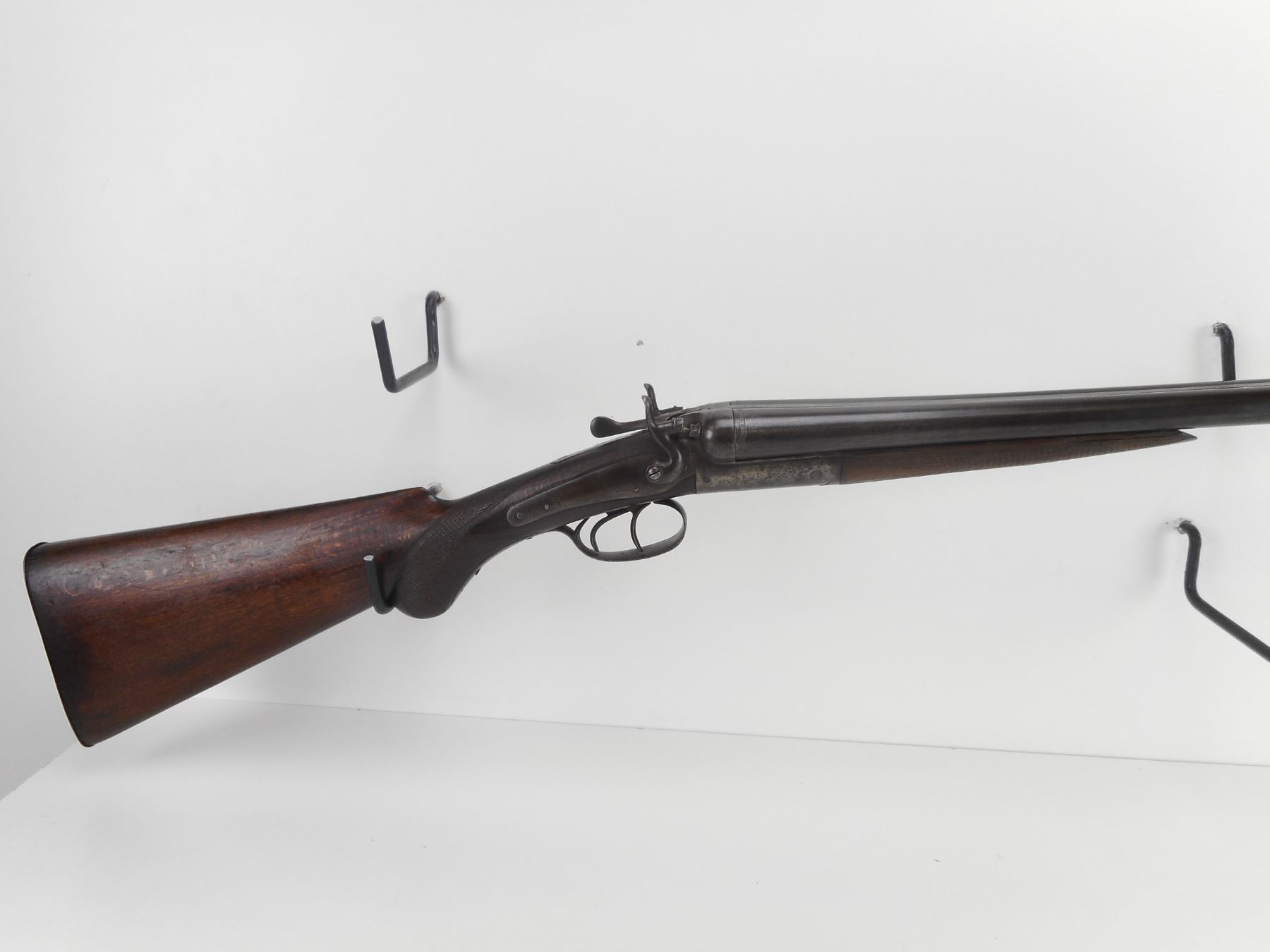 THE LIEGE UNITED GUN CO. , MODEL: SIDE BY SIDE , CALIBER: 12 GA X 2 3/4" , VERY GOOD BORE. FULL AND MODIFIED CHOKES. BEAD FRONT SIGHT. TWO PIECE CHECKERED HARDWOOD STOCK. STEEL BUTTPLATE. DUAL TRIGGERS. EXTERNAL HAMMERS. SMALL CHIP AT THE WRIST. SEVERAL CRACKS AT THE HEEL. SHOWS SOME HANDLING MARKS.BARREL LENGTH: 30", CONDITION: 5/10 , STOCK # NR10776, SERIAL # 3402, CLASS: CANADIAN NON RESTRICTED CLASS