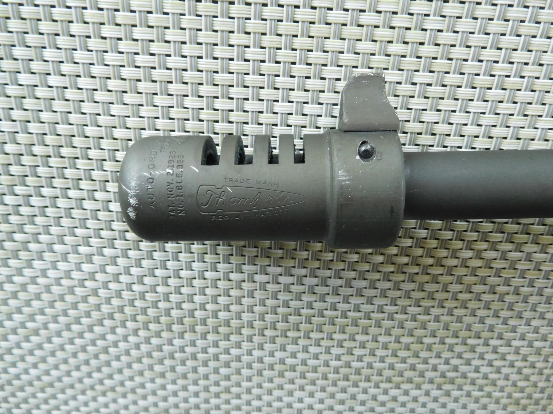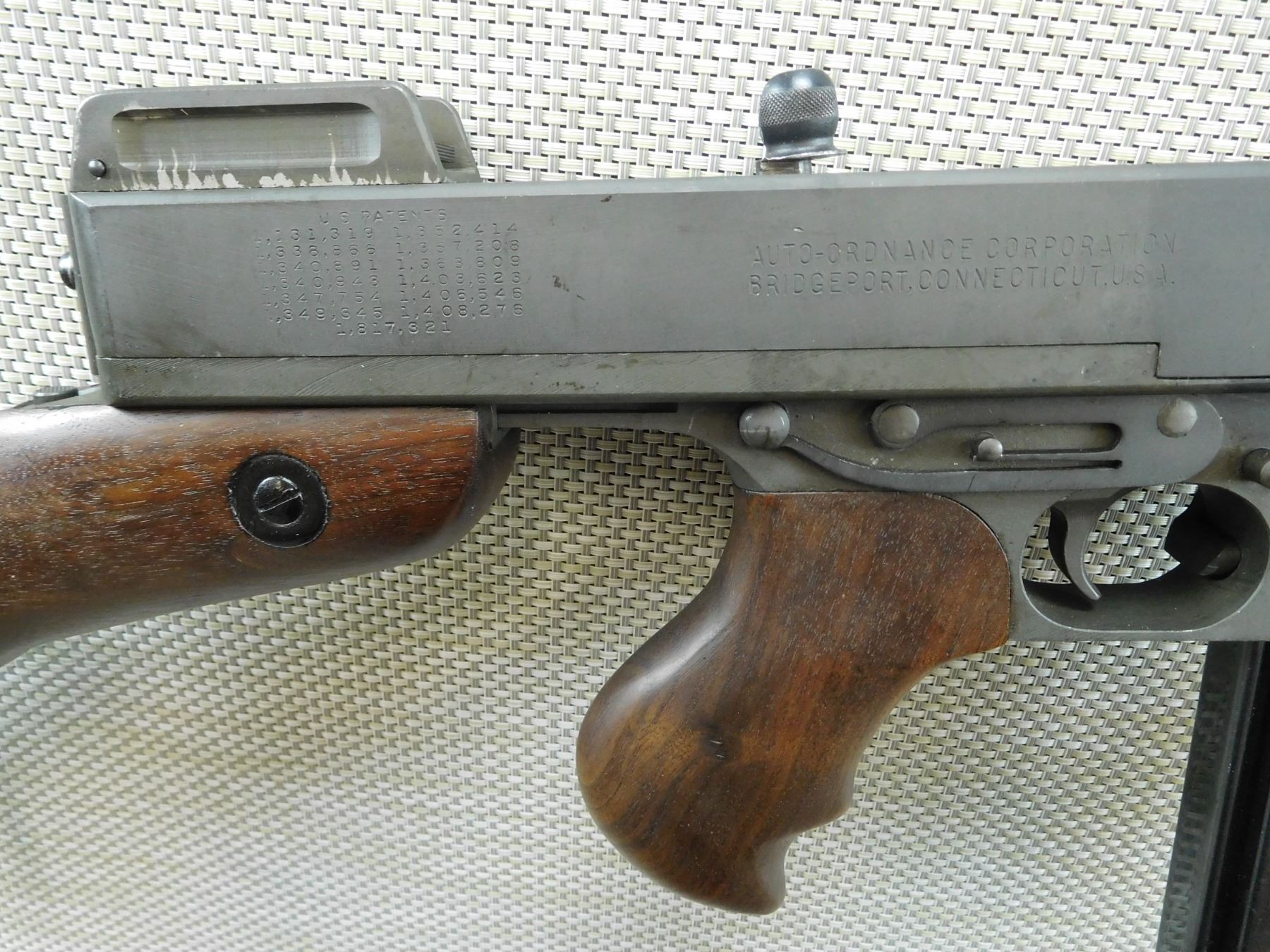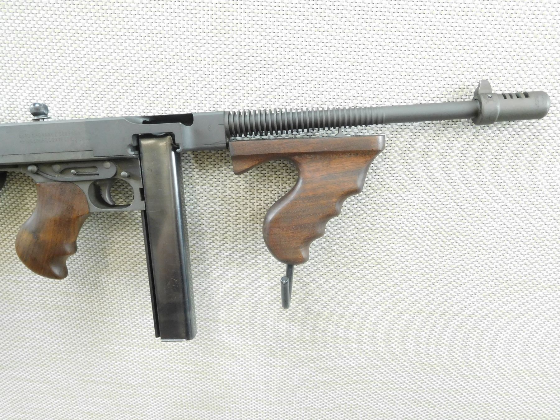 THOMPSON , MODEL: MODEL OF1928 A1 , CALIBER: 45 AUTO , COMES WITH STICK MAGAZINE PINNED AT 5, CONVERTED AUTOMATIC SUBMACHINE GUN, EXCELLENT BORE, HAS WOODEN STOCK 7 PISTOL GRIPS, FLIP REAR AND FIXED BEAD FRONT SIGHT, HEAT SHIELD, GOOD BORE, PARKERIZED FINNISH, CUTTS FLASH SUPRESSOR THIS IS REGISTERED AS 12-3 AND WILL REQUIRE A TECHNICAL INSPECTION TO VERIFY CONVERSION....THIS WILL TAKE SOME TIME, ALTERNATELY THIS IS AVAILABLE DE-ACTIVATED AT YOUR ADDITIONAL EXPENSE (APPROX. $250.) WE WILL ARRANGE THE WORK AND STATUS CHANGE INCLUDED IN THE FEE. , BARREL LENGTH: 267MM , SERIAL # S-187100 , STOCK # 2166 , CONDITION: 8/10 , CLASS: CANADIAN PROHIBITED CLASS