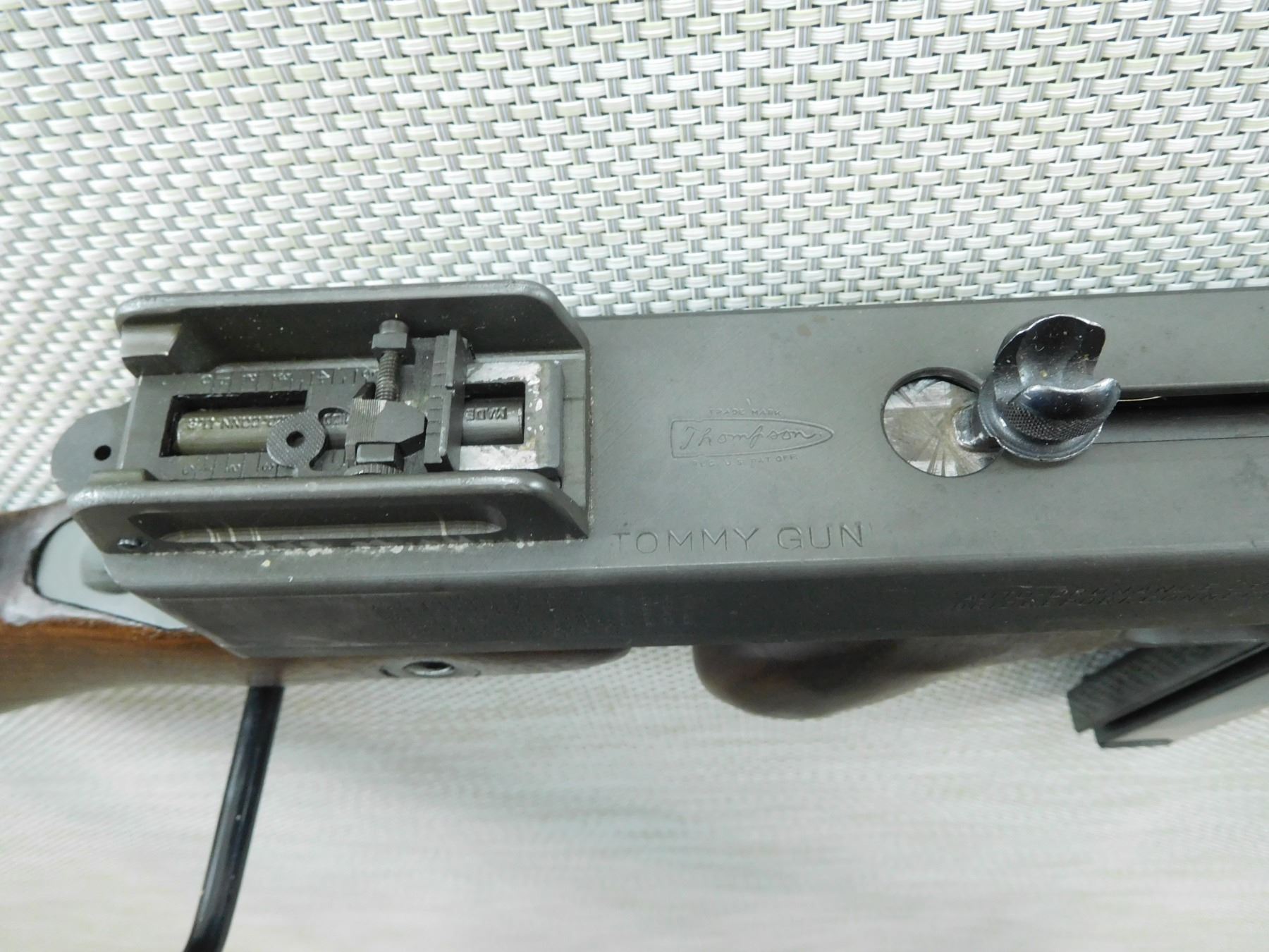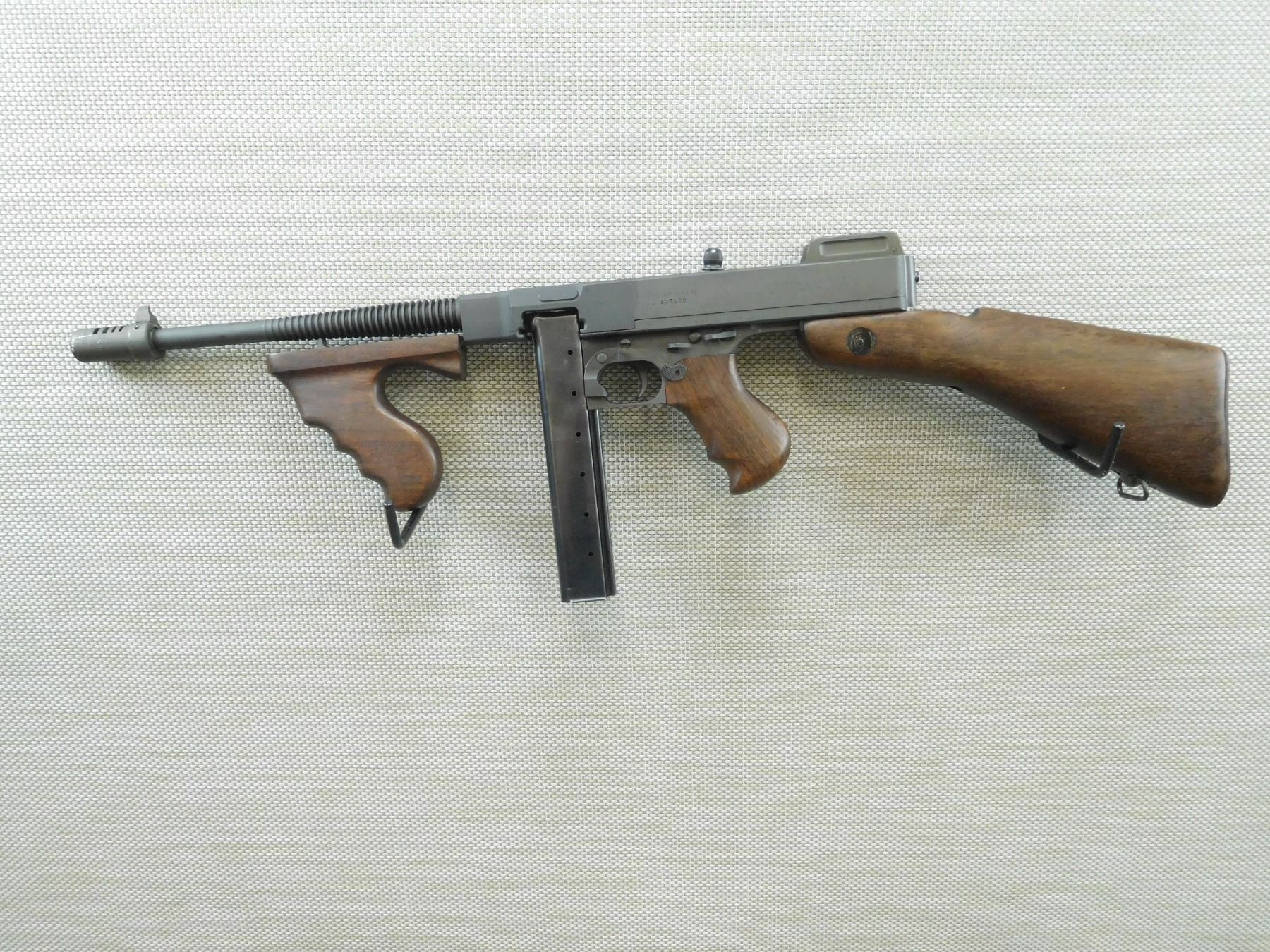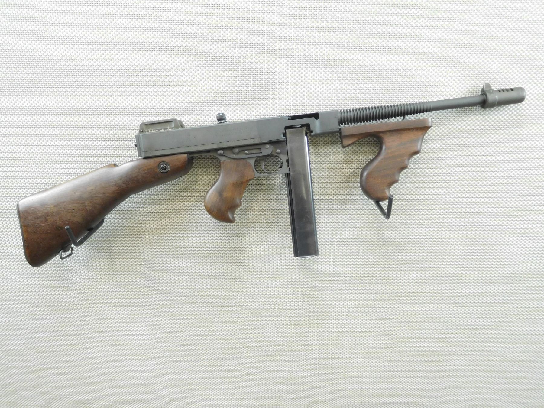 THOMPSON , MODEL: MODEL OF1928 A1 , CALIBER: 45 AUTO , COMES WITH STICK MAGAZINE PINNED AT 5, CONVERTED AUTOMATIC SUBMACHINE GUN, EXCELLENT BORE, HAS WOODEN STOCK 7 PISTOL GRIPS, FLIP REAR AND FIXED BEAD FRONT SIGHT, HEAT SHIELD, GOOD BORE, PARKERIZED FINNISH, CUTTS FLASH SUPRESSOR THIS IS REGISTERED AS 12-3 AND WILL REQUIRE A TECHNICAL INSPECTION TO VERIFY CONVERSION....THIS WILL TAKE SOME TIME, ALTERNATELY THIS IS AVAILABLE DE-ACTIVATED AT YOUR ADDITIONAL EXPENSE (APPROX. $250.) WE WILL ARRANGE THE WORK AND STATUS CHANGE INCLUDED IN THE FEE. , BARREL LENGTH: 267MM , SERIAL # S-187100 , STOCK # 2166 , CONDITION: 8/10 , CLASS: CANADIAN PROHIBITED CLASS
