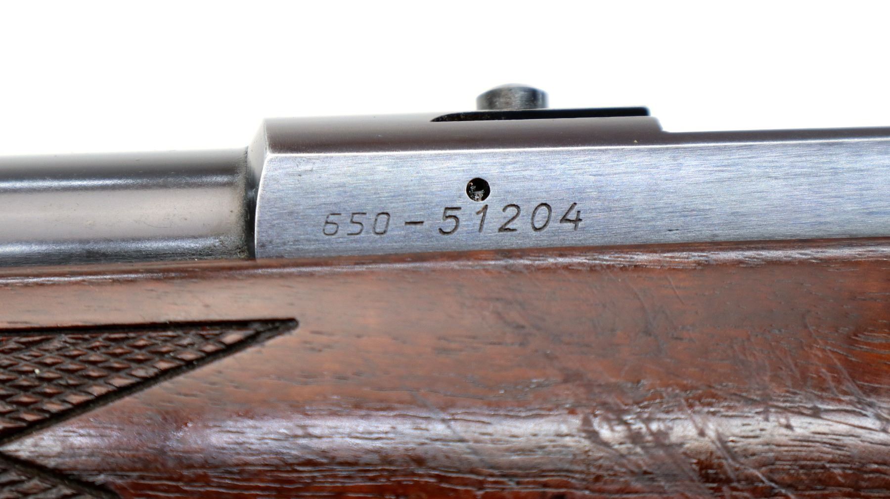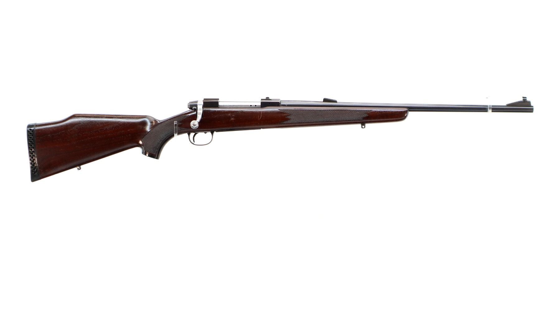 Main Description: Blade front sight with ramp, missing top of rear sight, base present, blued finish, receiver has integral scope bases, checkered flat sided bolt knob. One piece wood stock, checkered forearm and pistol grip with right hand palm swell, raised comb, black vented rubber recoil pad, grip cap, swivel studs.