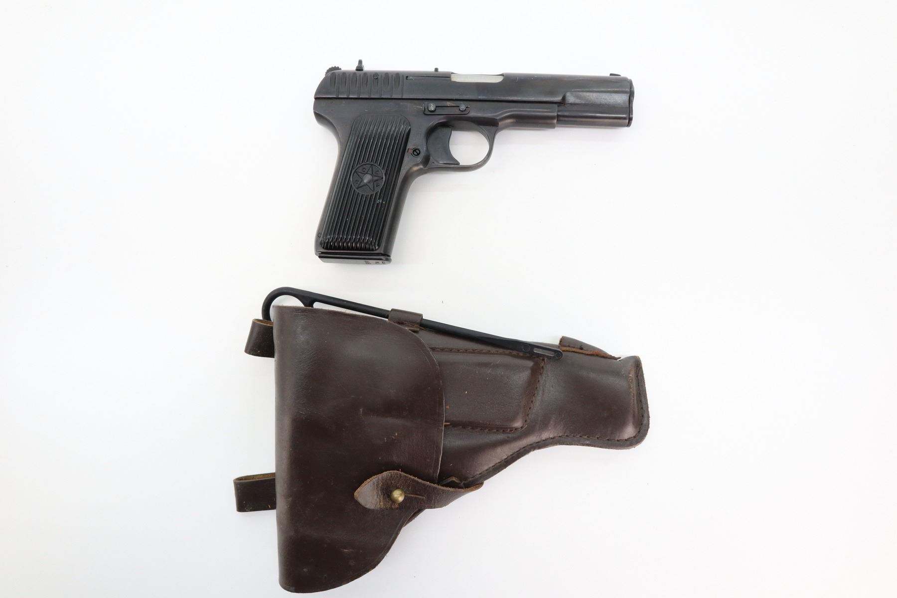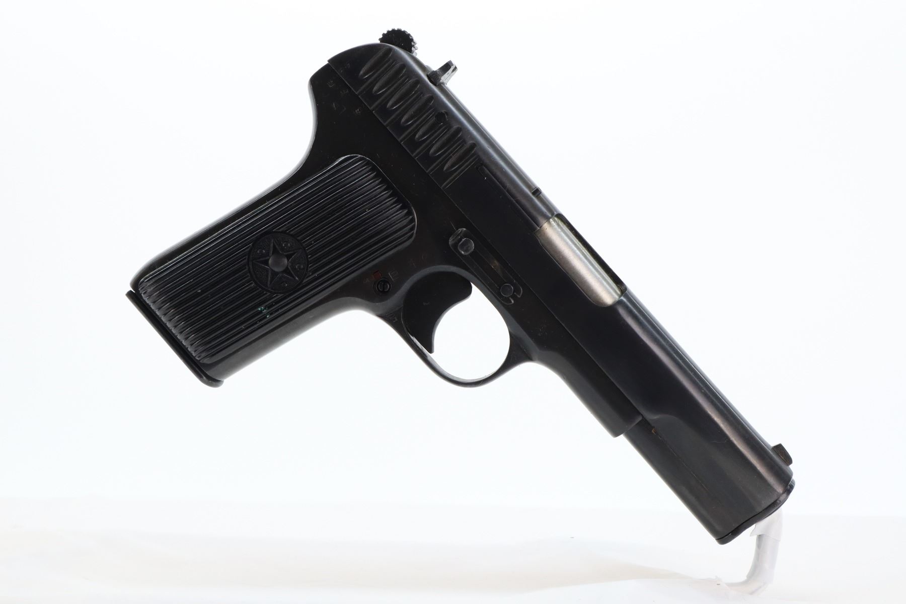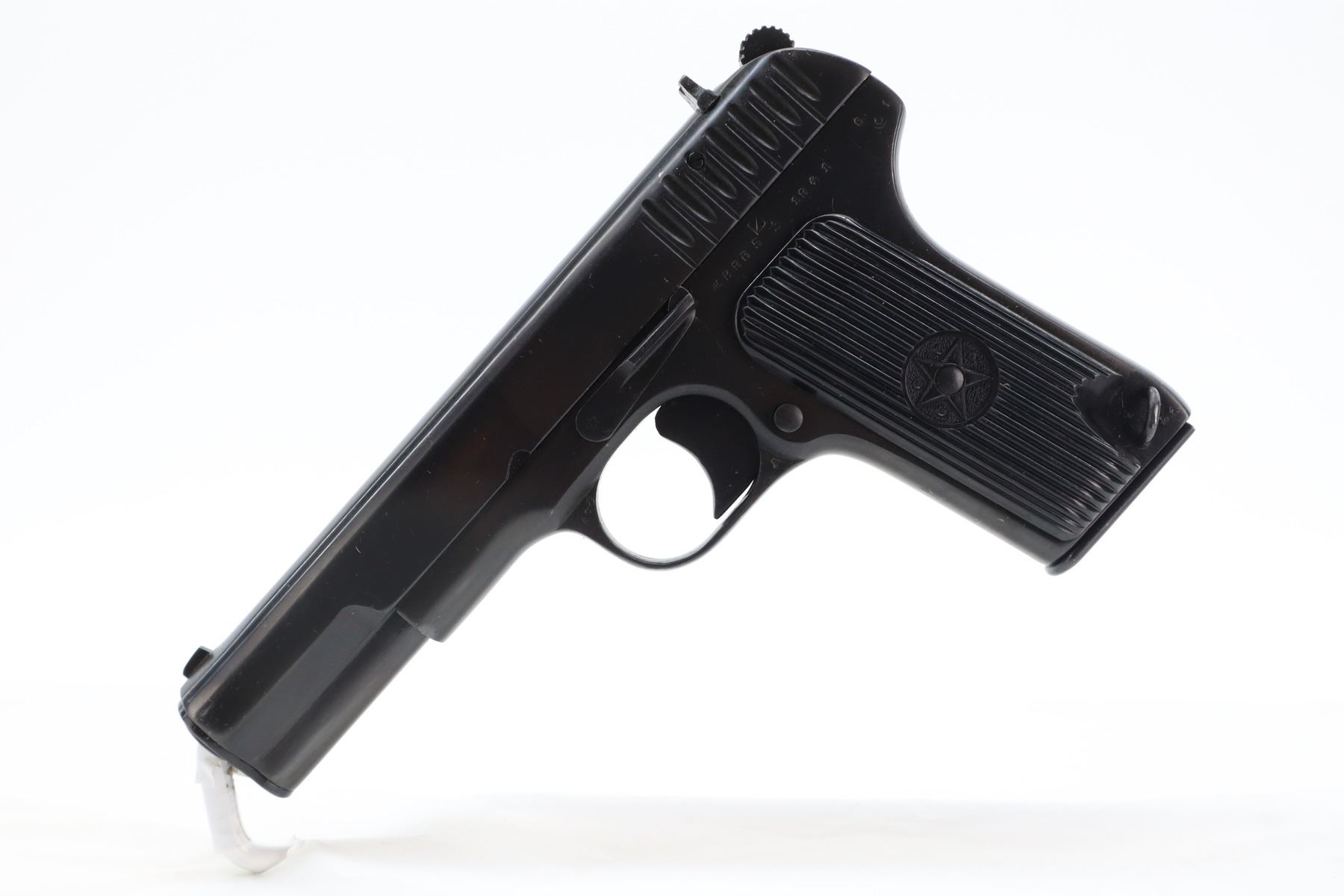 8+/10 , TOKAREV , MODEL: TT33 , CALIBER: 7.62 X 25 TOKAREV , COMES WITH HOLSTER & 2 MAGAZINES , BORE IS VERY GOOD. BLADE FRONT AND RAISED NOTCH REAR SIGHT. CHECKERED BLACK PLASTIC GRIPS WITH CCCP LOGO. DATED 1941. BOTH MAGAZINES ARE MATCHING. APPEARS TO BE AN ARSENAL REFINISH. SHOWS VERY LITTLE HANDLING MARKS , ACTION: SEMI AUTOMATIC , BARREL LENGTH: 115MM , CONDITION: 8+/10 , SERIAL # B865 , CLASS: CANADIAN RESTRICTED CLASS