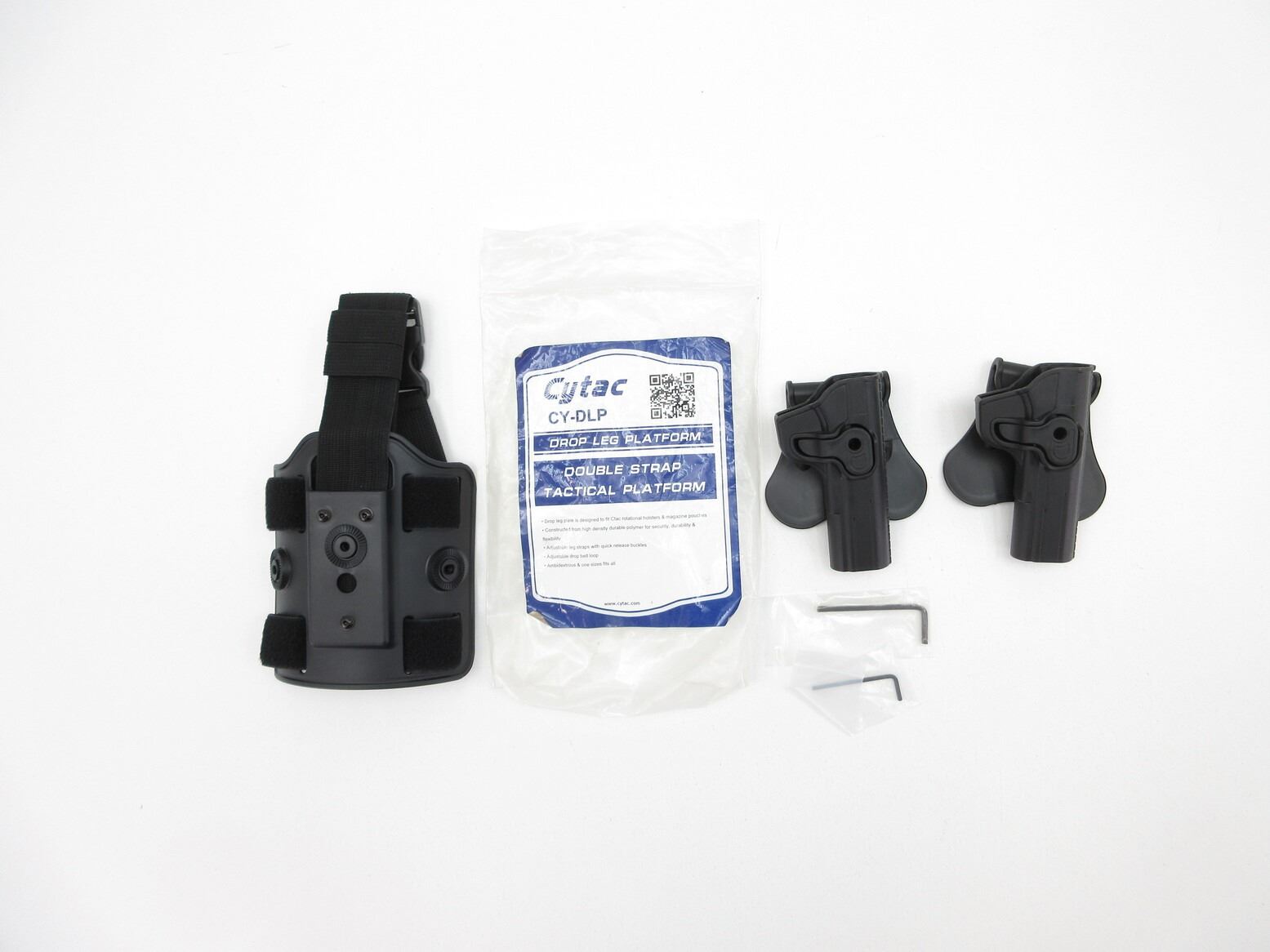 LOT INCLUDES; (2) CYTAC TOKAREV TT33 PISTOL HOLSTER, BLACK POLYMER CONSTRUCTION, RIGHT HANDED, ROTATES 360°, CAN BE ATTACHED TO PADDLE, BELT LOOP, MOLLE OR DROP LEG PLATFORMS, (1) CYTAC DROP LEG PLATFORM, DOUBLE STRAP, DESIGNED TO FIT CYTAC ROTATIONAL HOLSTERS & MAGAZINE POUCHES, POLYMER CONSTRUCTION, ADJUSTABLE LEG STRAPS, WITH QUICK RELEASE BUCKLES, AMBIDEXTROUS, ONE SIZE. SEE PHOTOS.