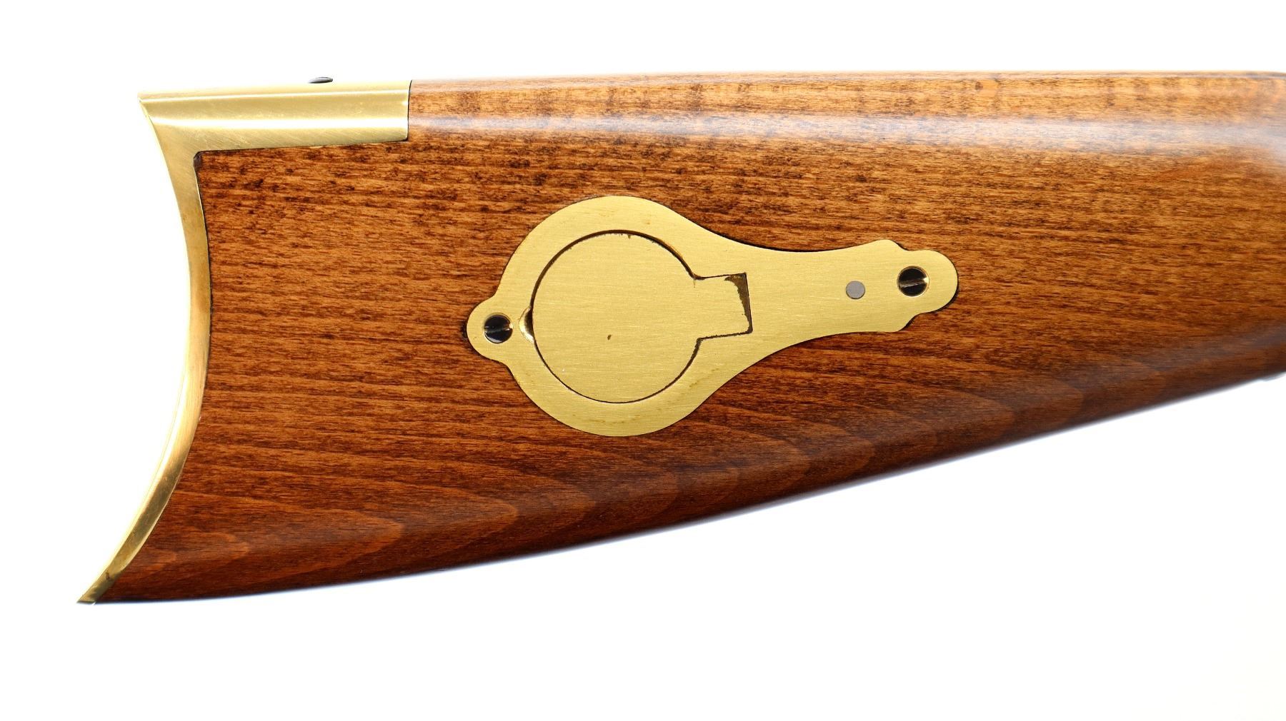 Main Description: Blade front sight, adjustable u notched rear sight, blued octagon barrel, smooth colour case hardened lock and grooved spur hammer that functions, double set triggers. One piece half length wood stock, single forearm wedge, straight grip, smooth curved brass butt plate, patch box, finger rest trigger guard, nose cap. Brown polymer ramrod with brass tip.