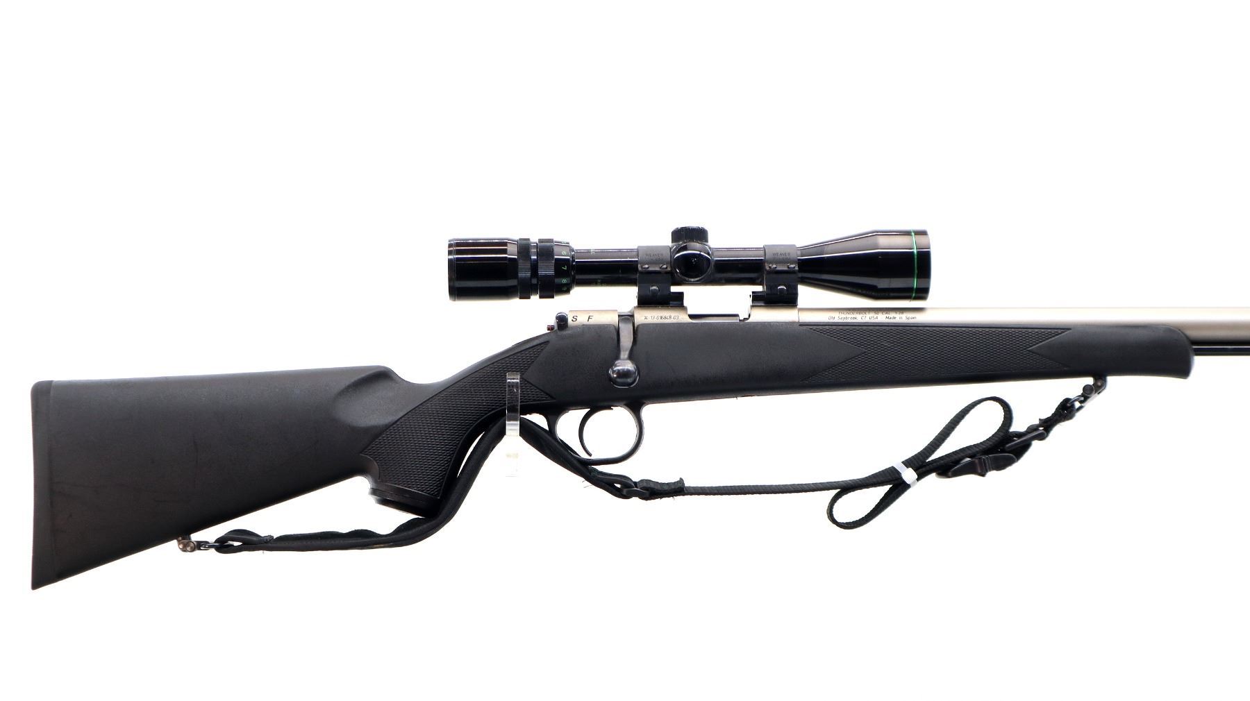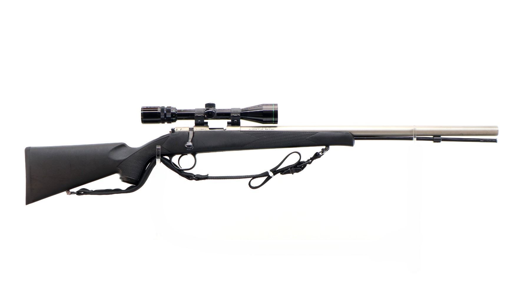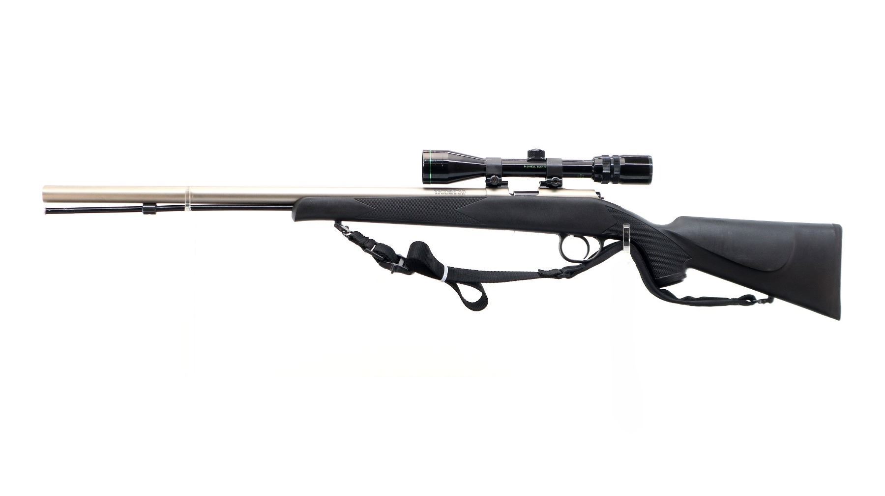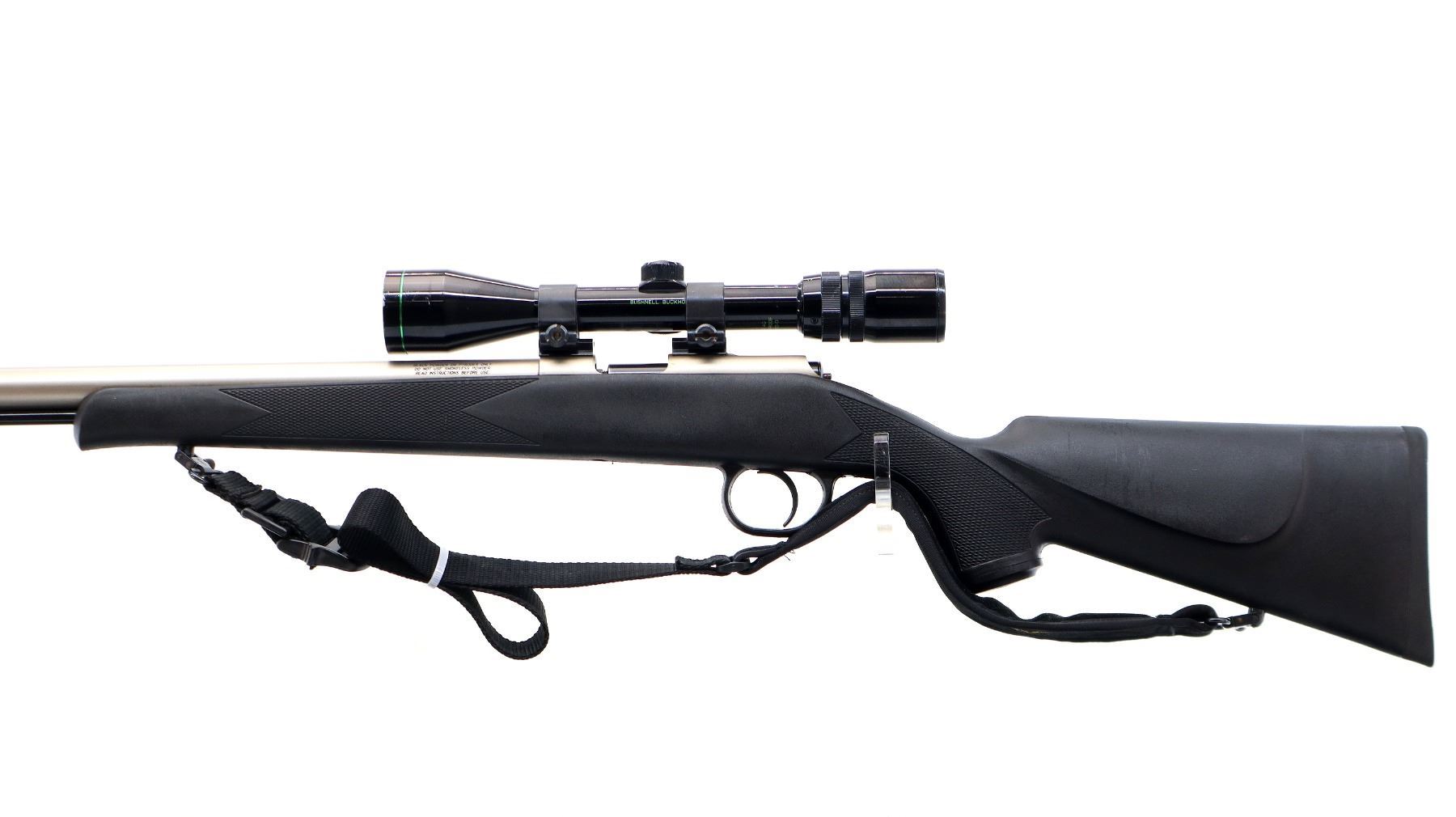 Main Description: Missing front and rear sights threaded holes present, stainless finish, round barrel, receiver drilled and tapped with Bushnell Buckhorn 3-9x40 scope installed, clear optics with duplex crosshair. Uses 209 primers. One piece black synthetic stock, checkered forearm and pistol grip, cheek rest, black rubber recoil pad, grip cap, sling swivels with black nylon sling, black polymer ramrod with alloy tip.