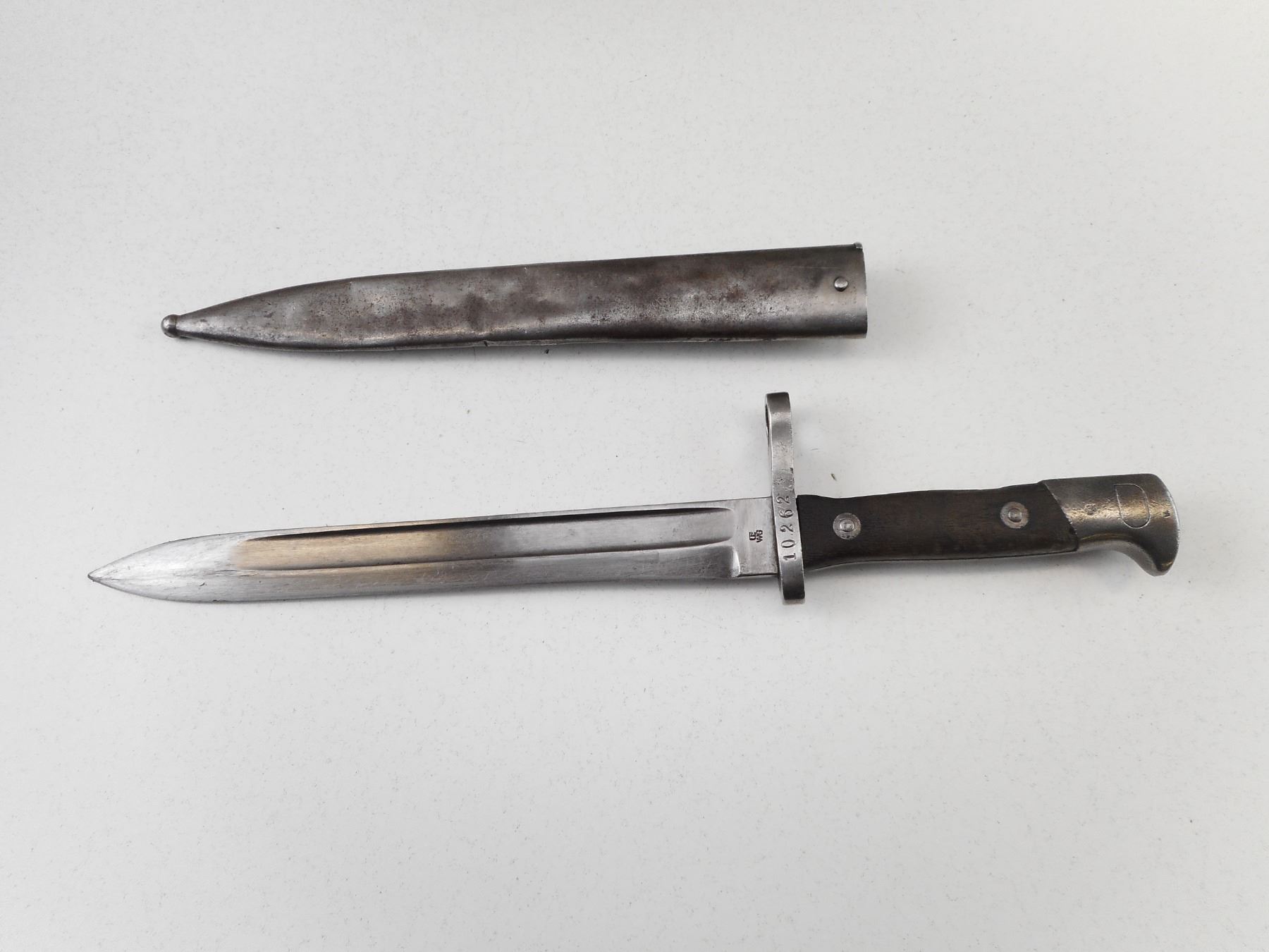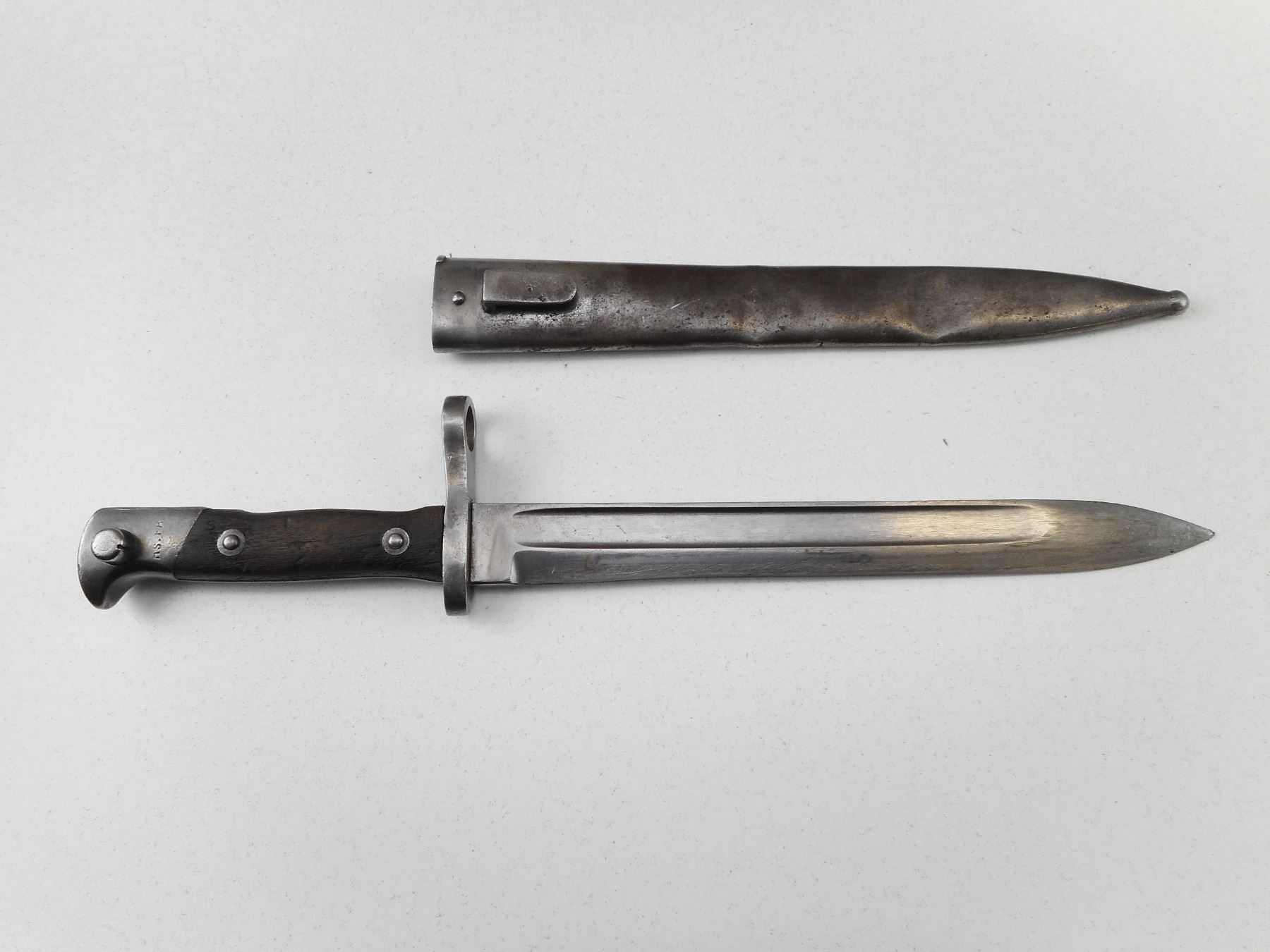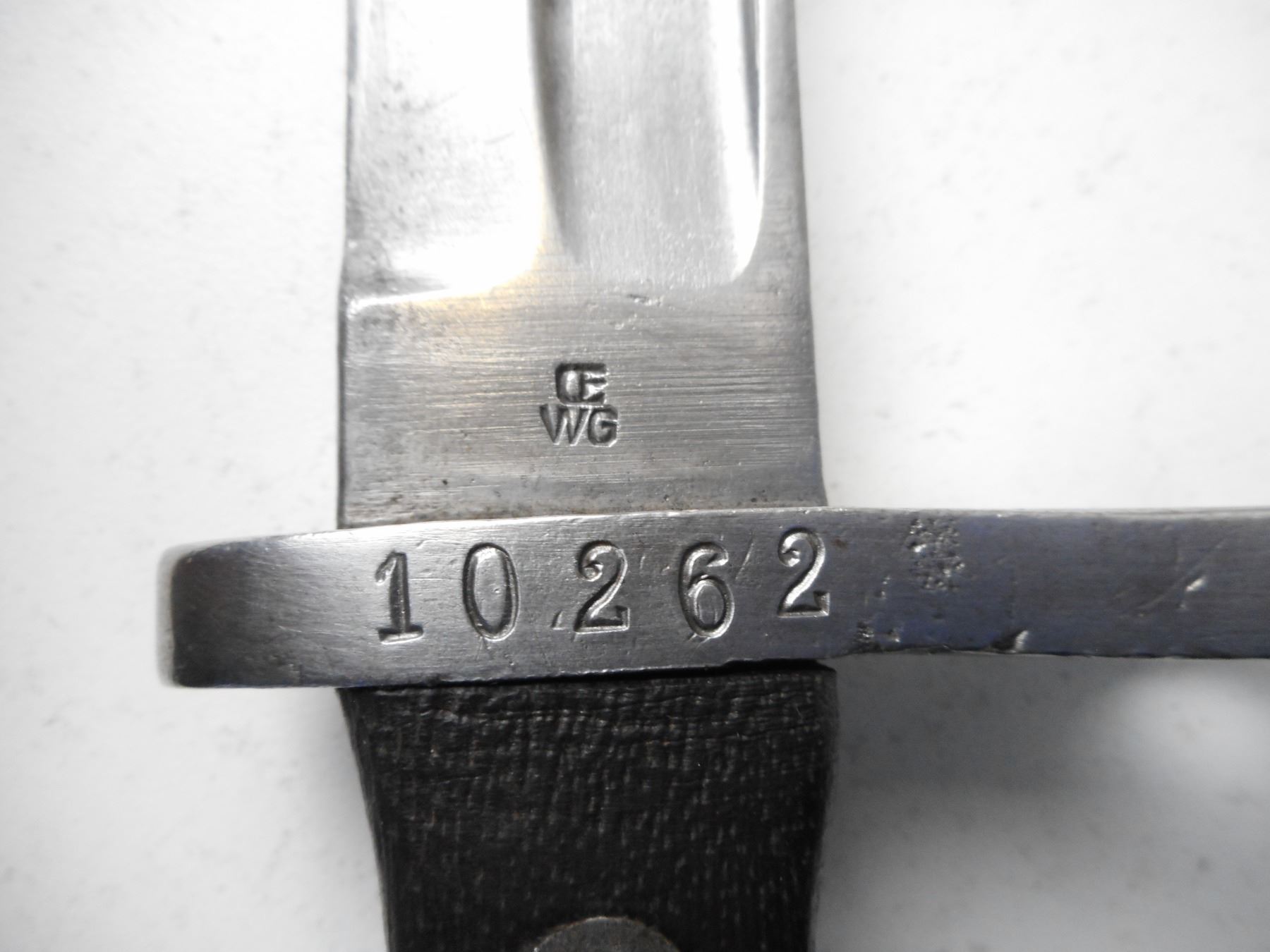 TURKISH M1913 TYPE BAYONET WITH SCABBARD , RICASSO MARKED OE/WG. CROSSPIECE MARKED 10262, CROSSPIECE IS LOOSE. BLADE LENGTH APPROX. 9.5" TOTAL LENGTH APPROX. 14.5". SCABBARD HAS A "D" ON THE THROAT, SOME DENTS OVERALL.
