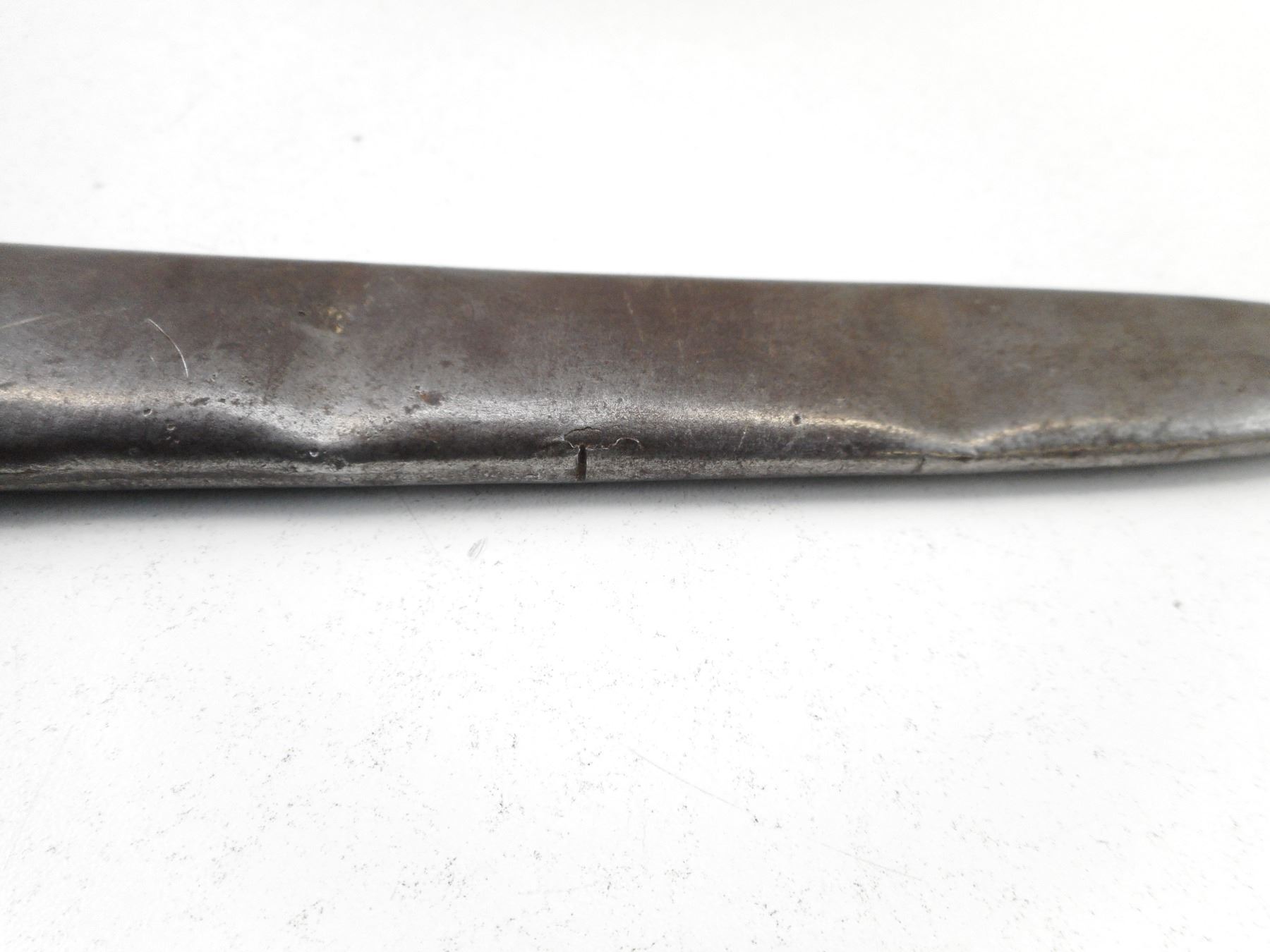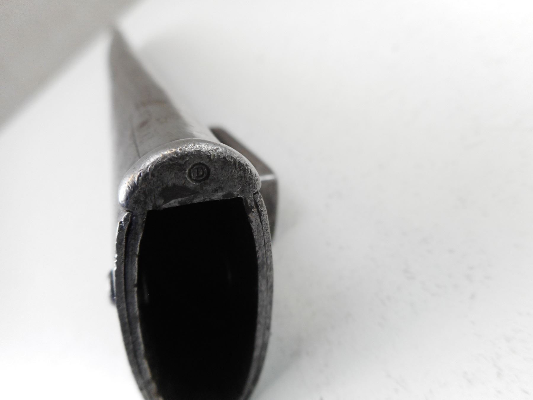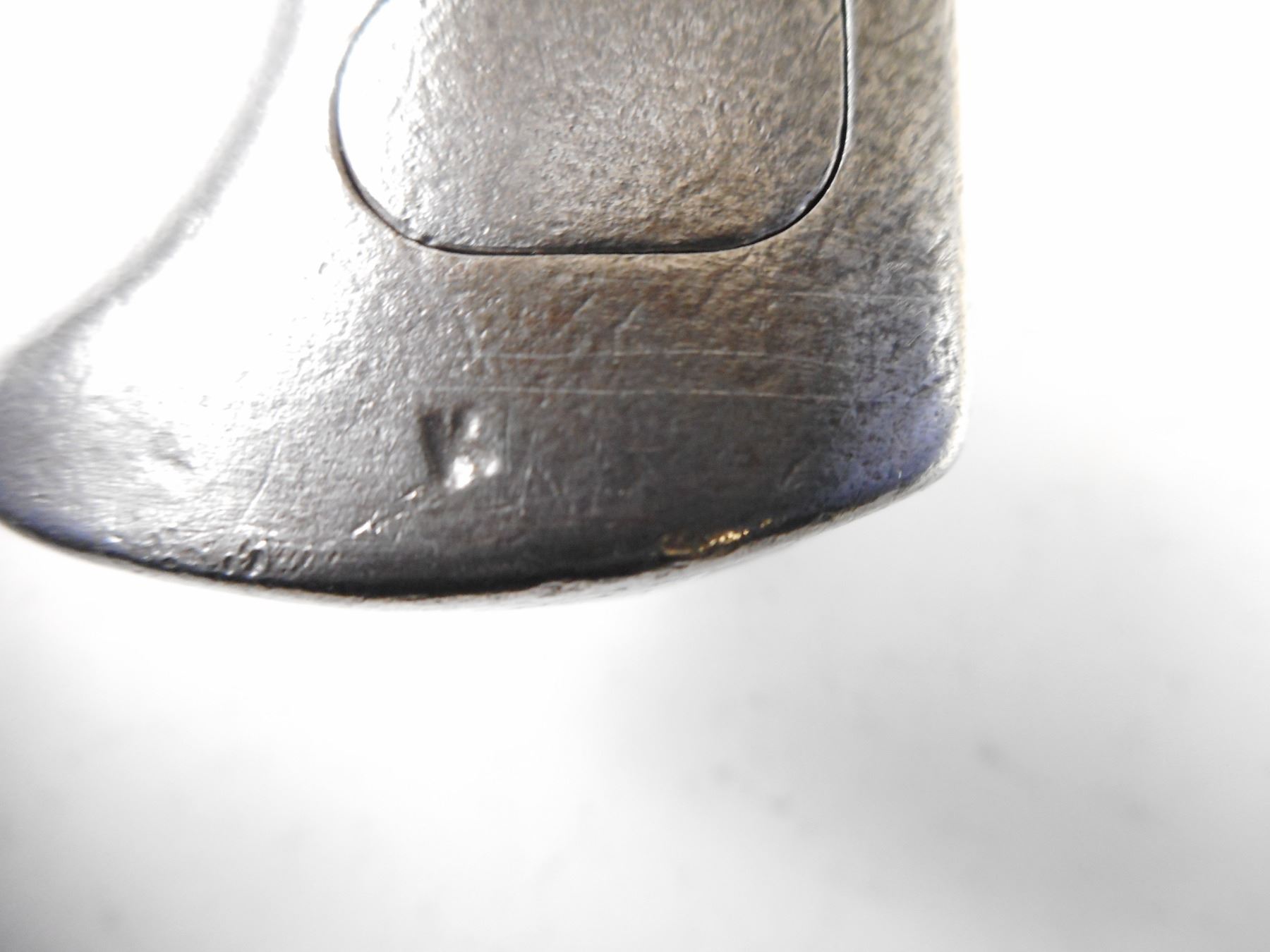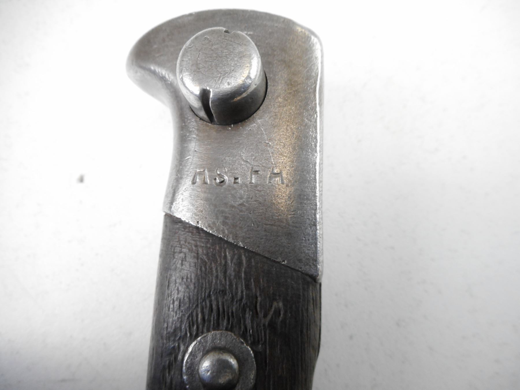 TURKISH M1913 TYPE BAYONET WITH SCABBARD , RICASSO MARKED OE/WG. CROSSPIECE MARKED 10262, CROSSPIECE IS LOOSE. BLADE LENGTH APPROX. 9.5" TOTAL LENGTH APPROX. 14.5". SCABBARD HAS A "D" ON THE THROAT, SOME DENTS OVERALL.