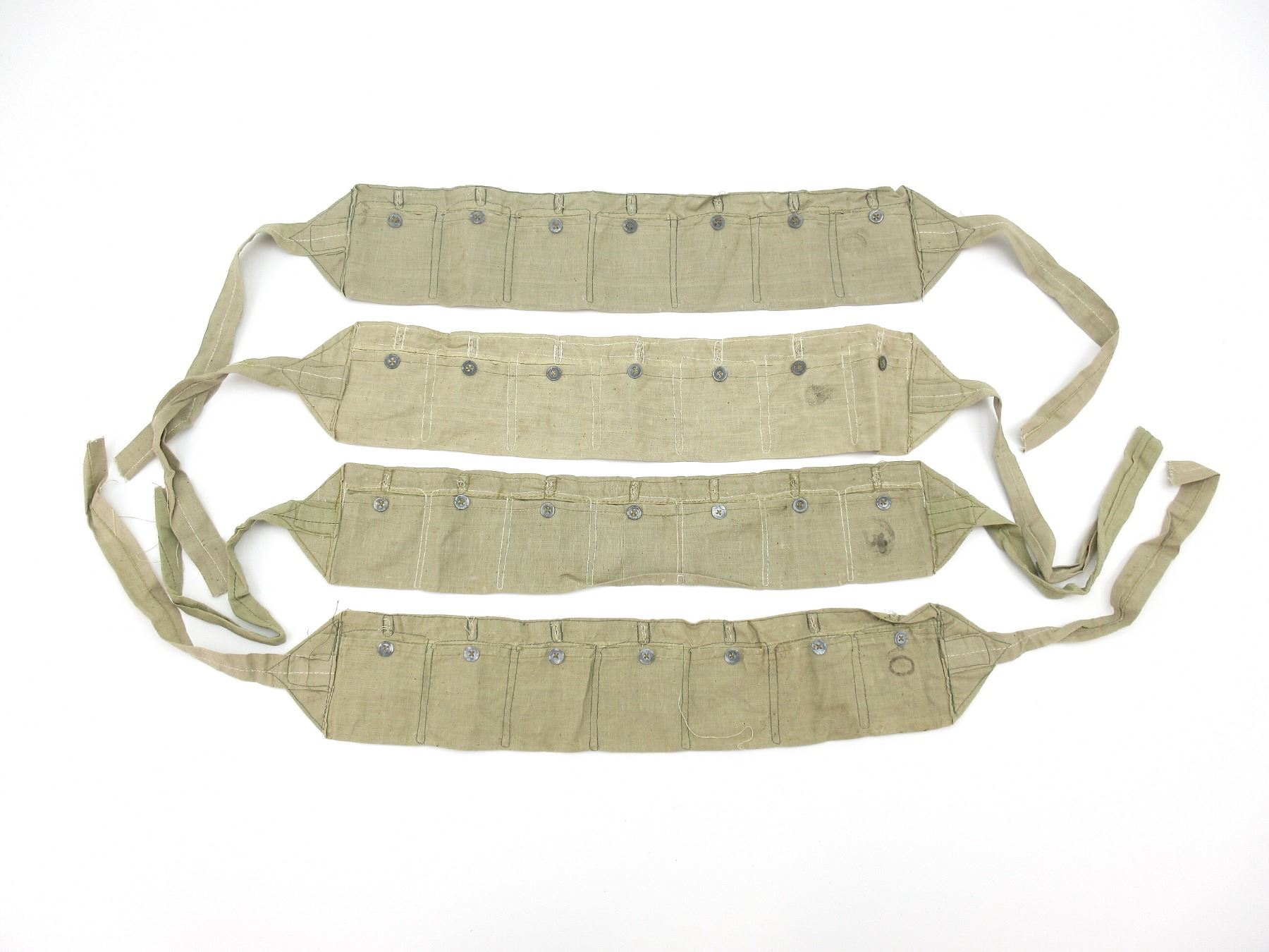 LOT INCLUDES; (4) GREEN / GREY CLOTH BANDOLIERS WITH STRAP, 7-POCKETS, FAINT / UN-CLEAR INK STAMPS, OAL APPROX. 28". SEE PHOTOS.