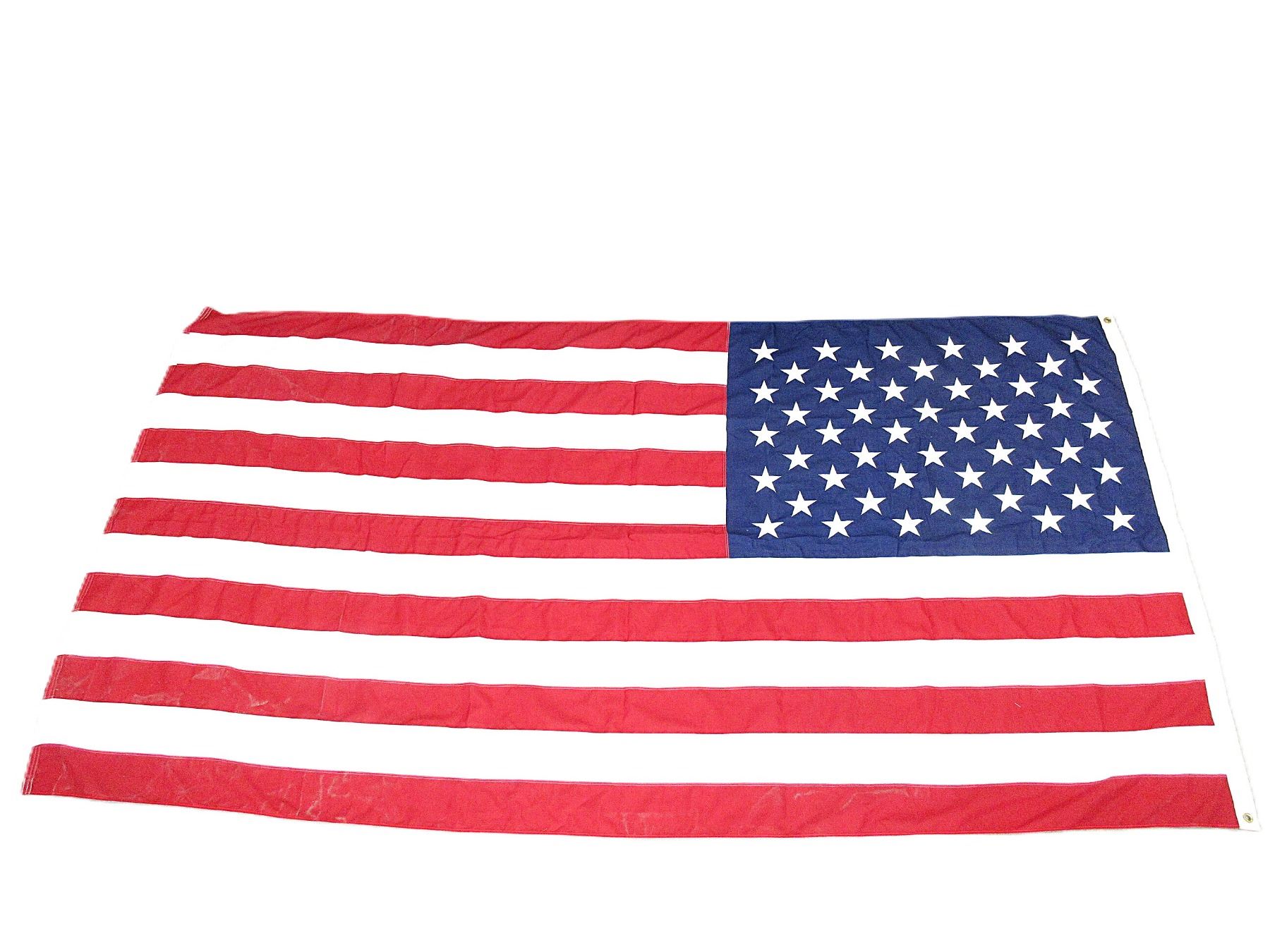 (1) RED / WHITE / BLUE ROUGH POLYESTER WITH 50 STARS, FLAG MARKED: "100%, SPUN POLYESTER, MADE IN THE U.S.A., VALLEY FORGE", EACH RED / WHITE STRIPE SEWN TOGETHER & SEWN TO BLUE PANEL, WHITE STARS INDIVIDUALLY EMBROIDERED ON BLUE PANEL, TWO BRASS GROMMETS & APPROX. 114.5" X 58". SEE PHOTOS.