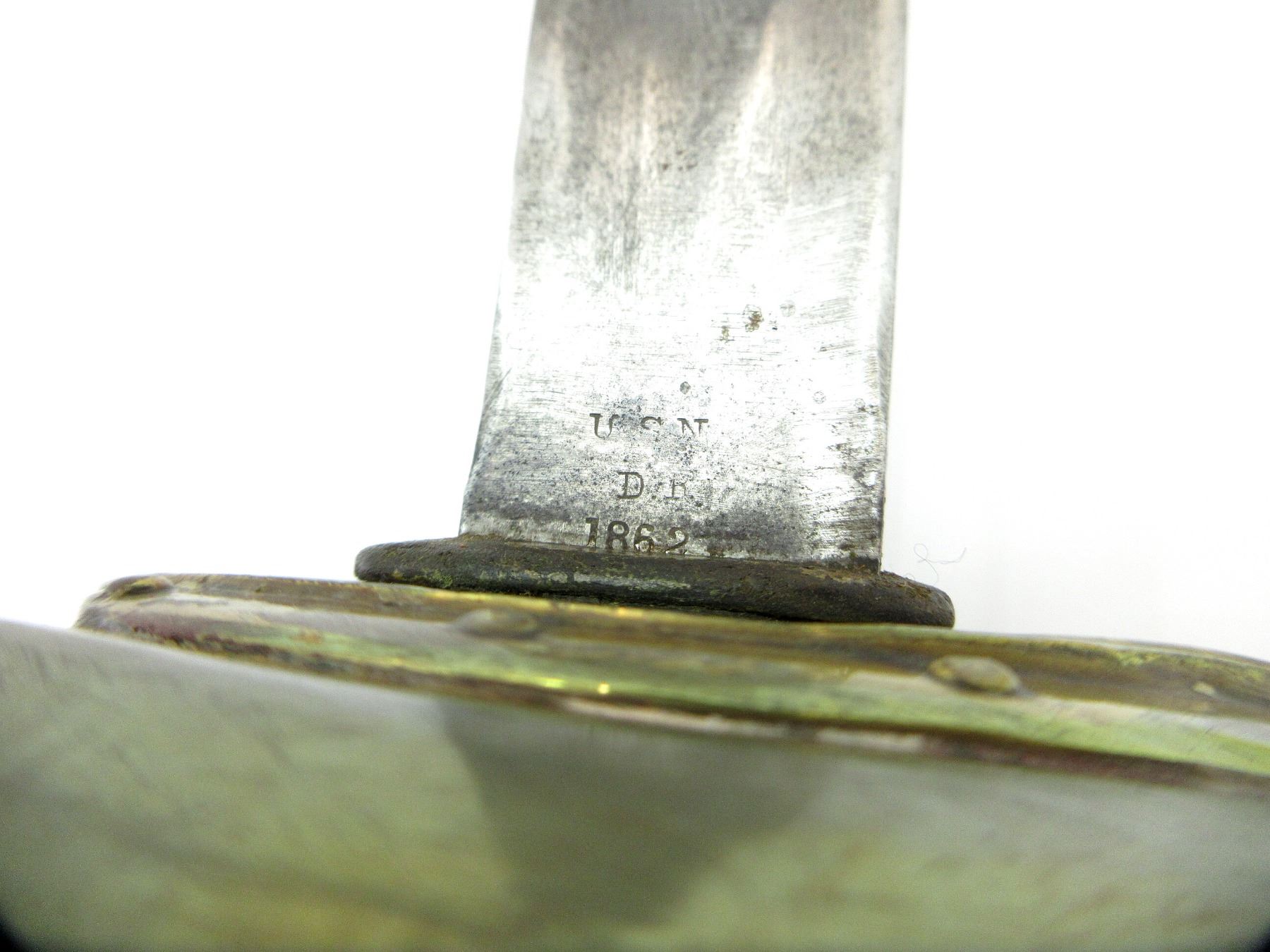 (1) SINGLE-FULLERED BLADE, RICASSO MARKED: "U.S.N., D.R., 1862", LEATHER BUFFER PAD / WASHER, BRASS HAND-GUARD, HAND-GUARD MARKED: "20M" OVER "357", LEATHER WRAPPED WOODEN GRIP, BRASS POMMEL, NO VISIBLE MARKINGS, LEATHER & BRASS SCABBARD, NO VISIBLE MARKINGS, BLADE APPROX. 26" & OAL APPROX. 32". SEE PHOTOS.