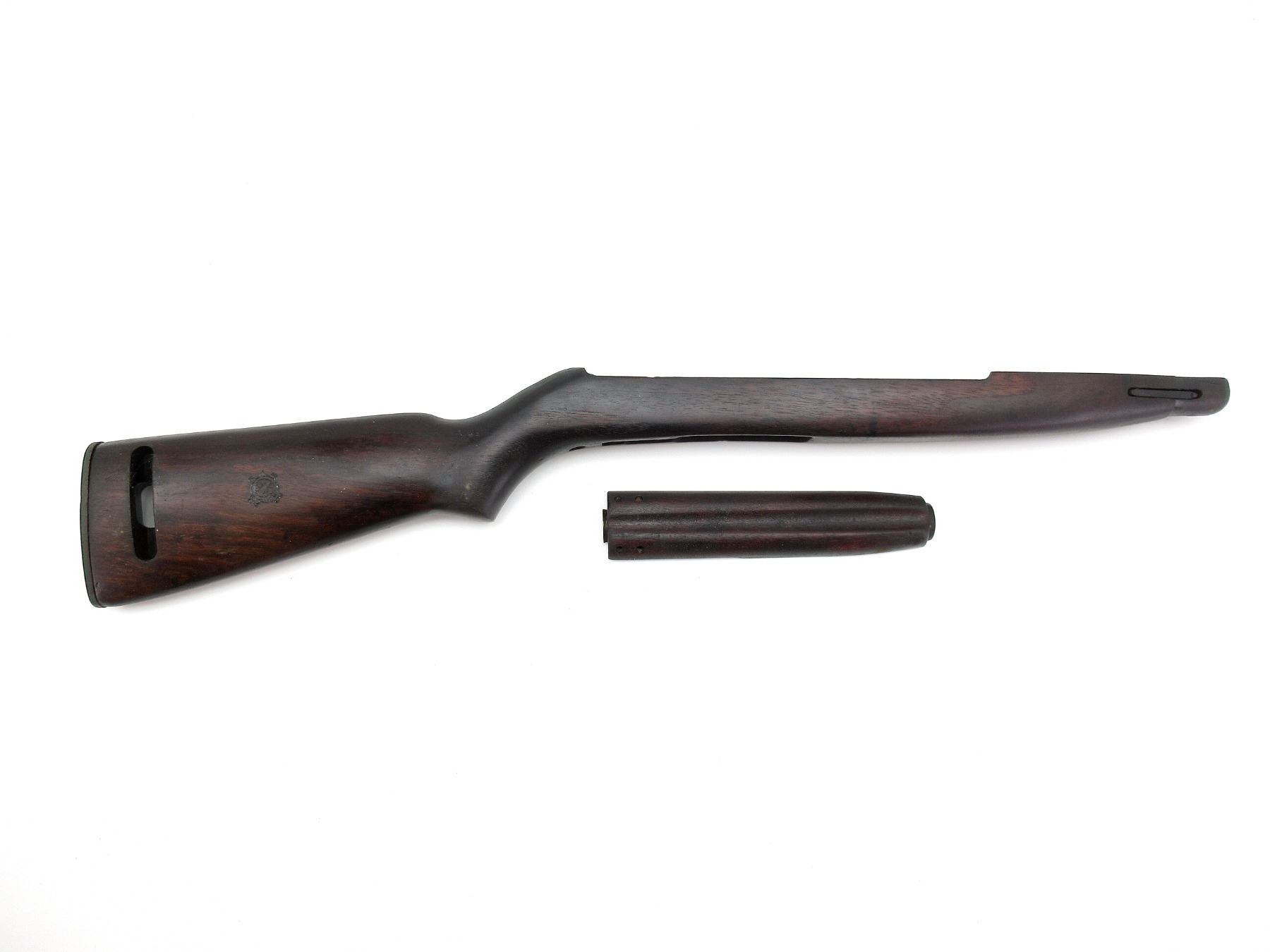LOT INCLUDES; (1) WOOD RIFLE STOCK, WITH VARIOUS U.S. / MAKER PROOF MARKS, MFG'D BY INLAND, SMALL CRACK BY REAR OF ACTION, WITH BUTT PLATE, OAL APPROX. 28.5", (1) WOOD HANDGUARD, SMALL CRACKS AT FRONT INSIDE, OAL APPROX. 8.5". MAY REQUIRE FITTING. SEE PHOTOS.