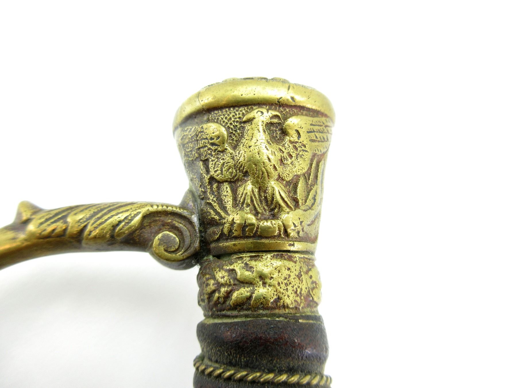 (1) THIN STRAIGHT DOUBLE-EDGED SWORD, NO VISIBLE MARKINGS ON BLADE / RICASSO, BRASS CROSS PIECE / D-SHAPED HILT, DECORATIVE EAGLE WITH ARROWS ON CROSS-PIECE, BRASS HILT HAS DECORATIVE ARROWS & FLORAL DESIGNS, LEATHER & BRASS WIRE WRAPPED GRIP, BRASS POMMEL WITH EAGLE & FLORAL DESIGN, NO VISIBLE MARKINGS, STEEL SCABBARD WITH DECORATIVE BRASS END & HANGERS, NO VISIBLE MARKINGS, BLADE APPROX. 30" & OAL APPROX. 35 3/8". SEE PHOTOS.
