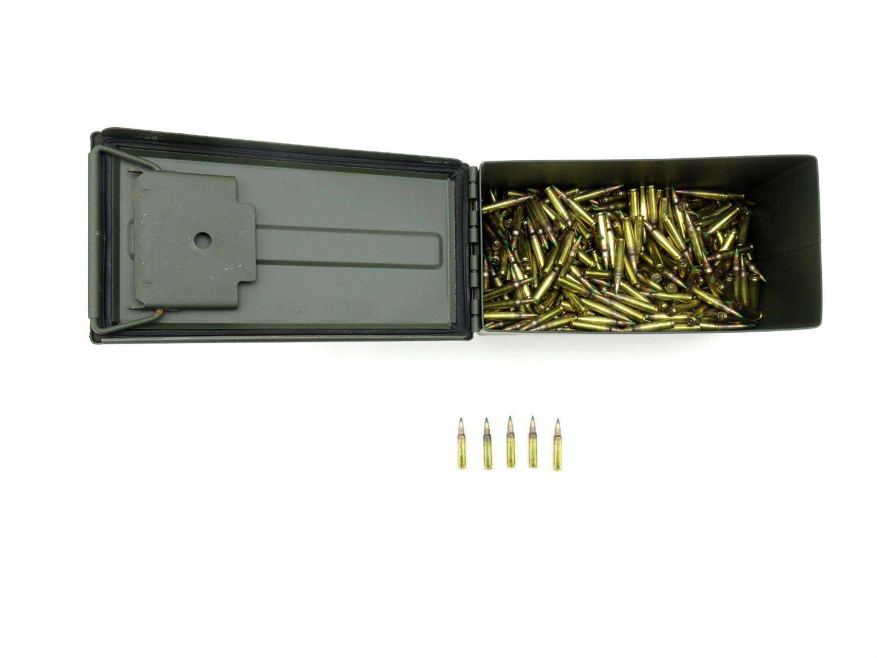 LOT INCLUDES; APPROX. (600) RNDS, FMJ, GREEN TIP, (1) ONE METAL AMMO CAN, APPROX. DIM 12"X6"X7".