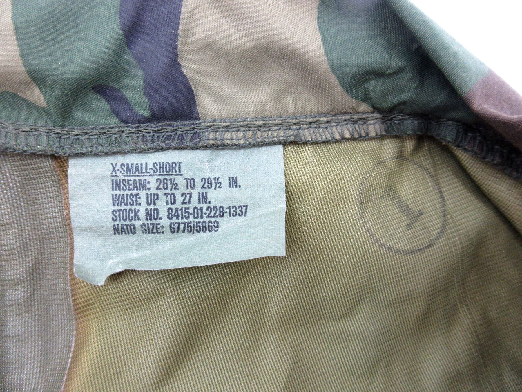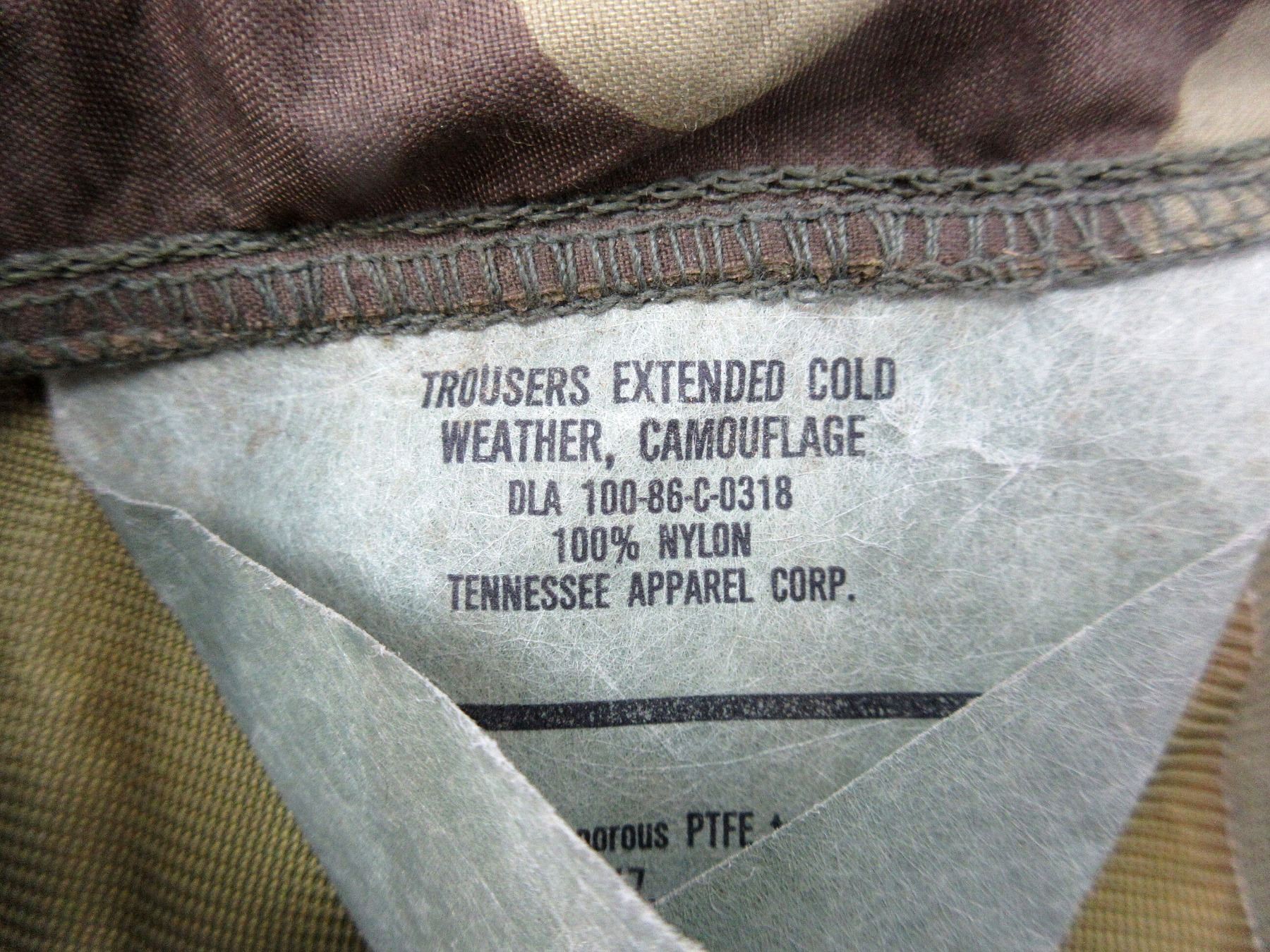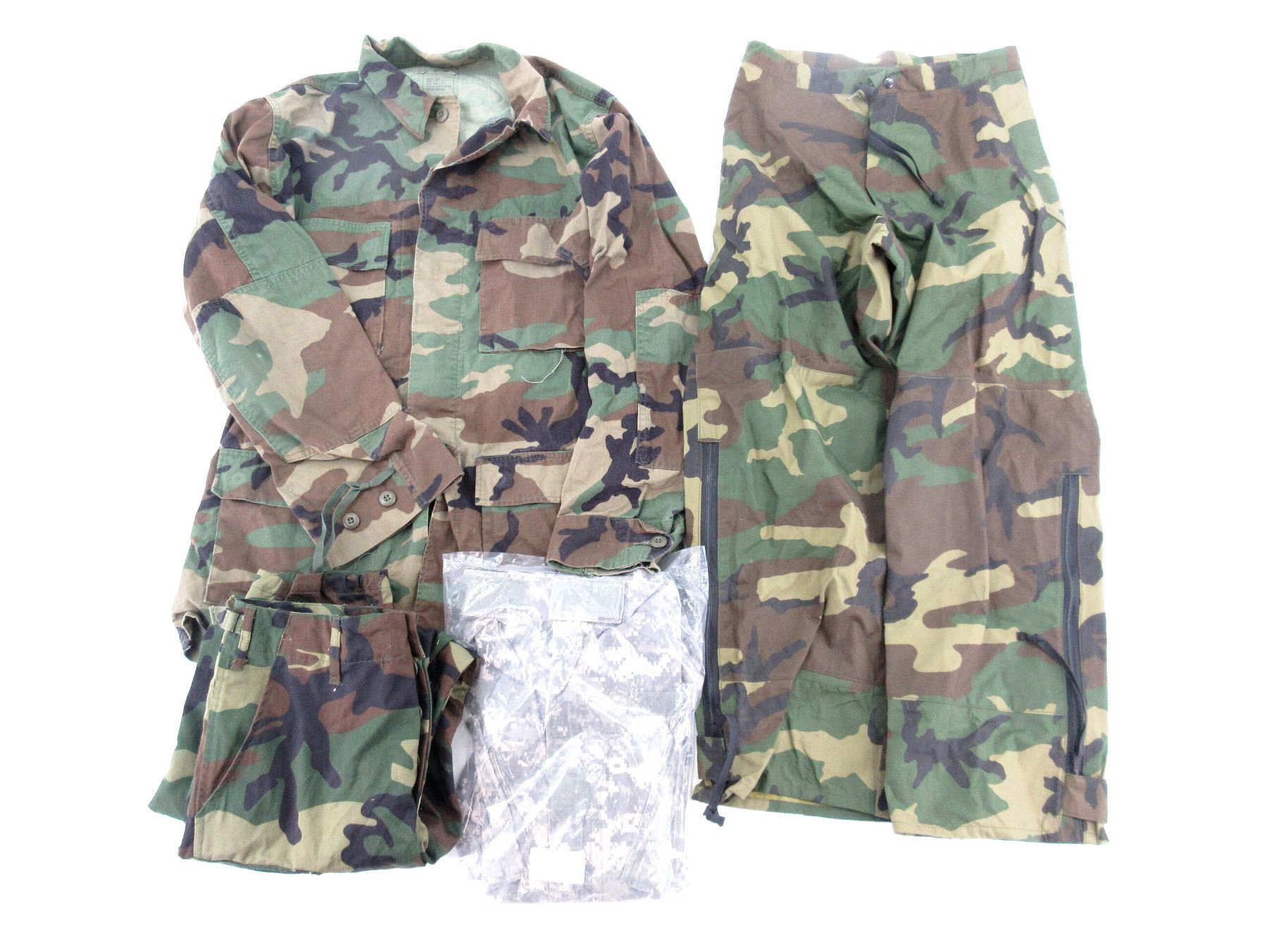 LOT INCLUDES; (1) EXTENDED COLD WEATHER CAMO NYLON PANTS, SIZE XS-SHORT, VARIOUS MARKINGS / LABELS, ZIPPERED-FLY (WORKS), VARIOUS ZIPPERS (WORKS), (1) WOODLAND CAMO COMBAT PANTS, SIZE XS-REGULAR, VARIOUS MARKINGS / LABELS, BUTTON-FLY, (1) UNIVERSAL CAMO PATTERN COMBAT COAT, SIZE M-SHORT, VARIOUS MARKINGS / LABELS, VELCRO / ZIPPERED-FRONT, APPEARS NOS, IN SEALED PACKAGING & (1) WOODLAND CAMO COMBAT COAT, SIZE M-LONG, VARIOUS MARKINGS / LABELS, BUTTON-FRONT, SHOWS WEAR. SEE PHOTOS.